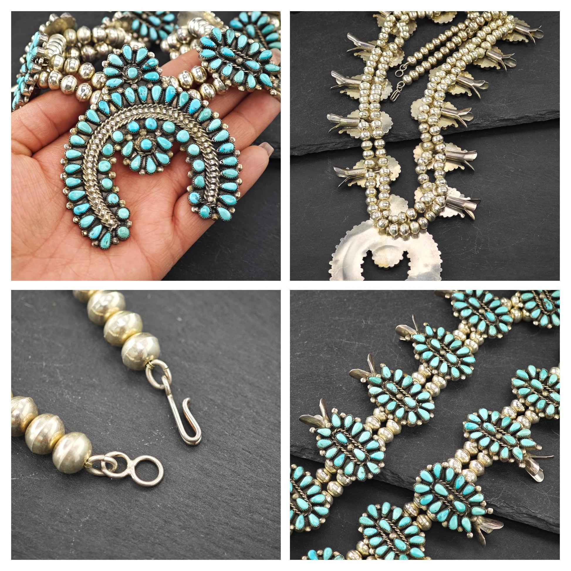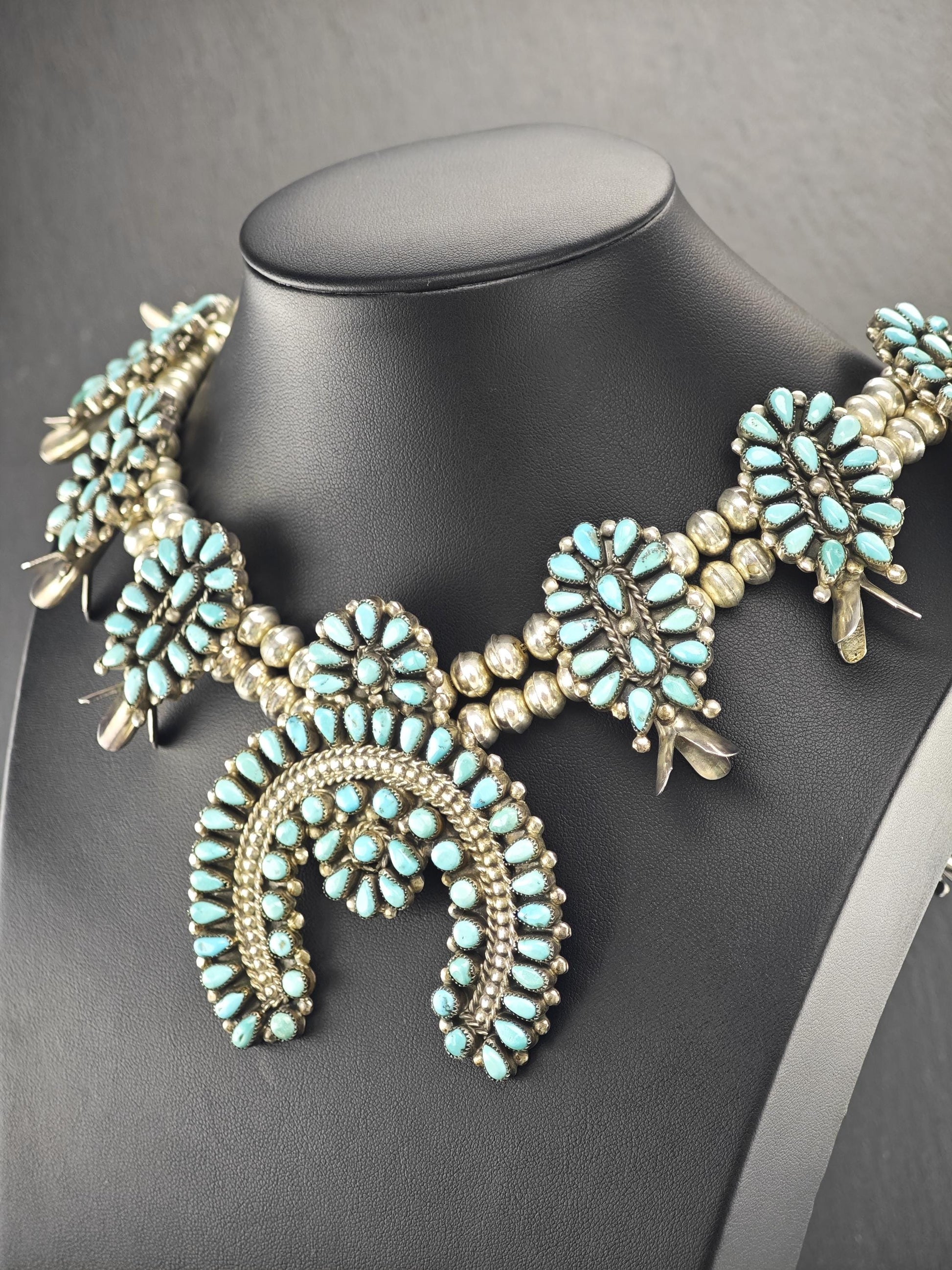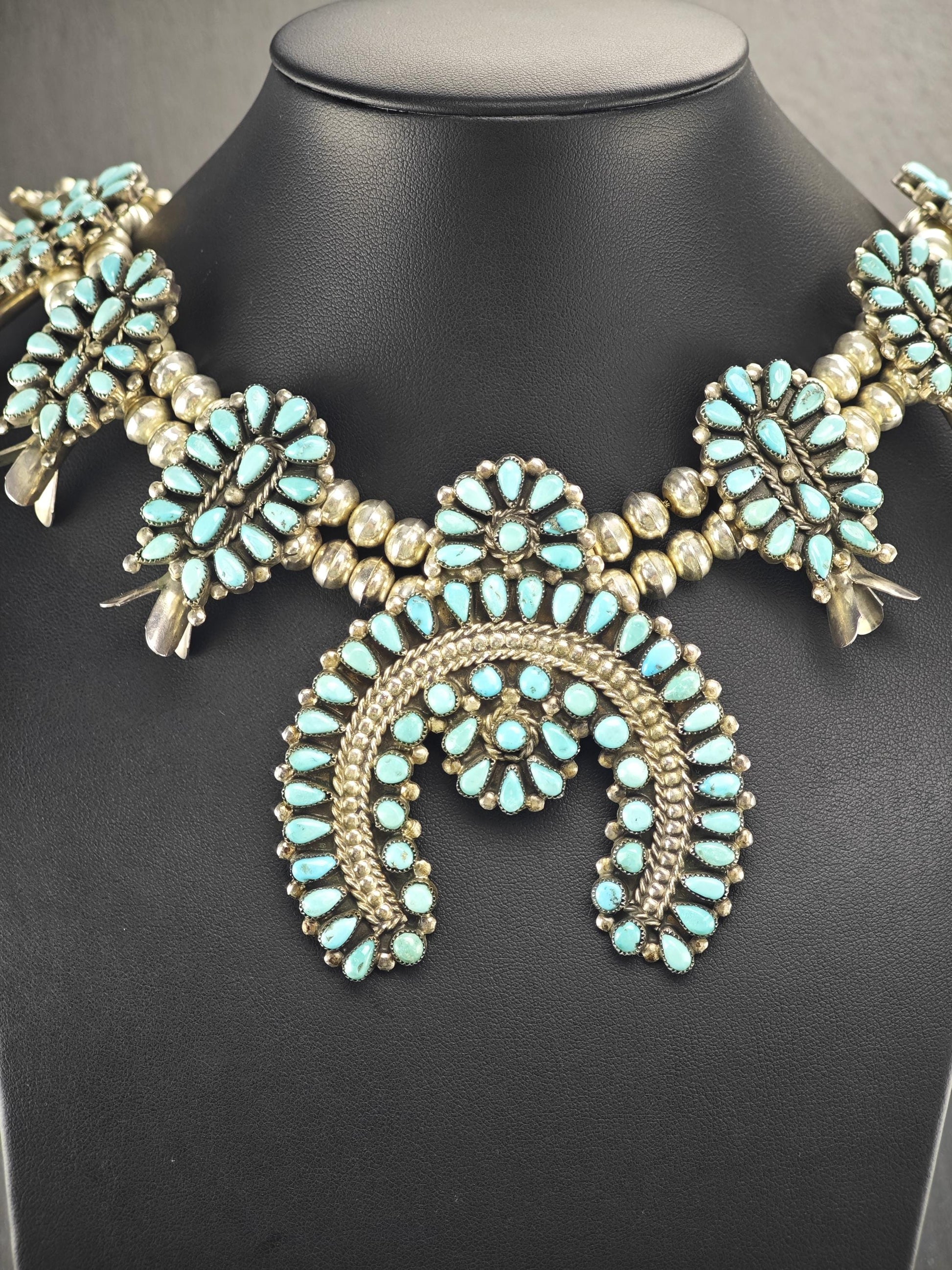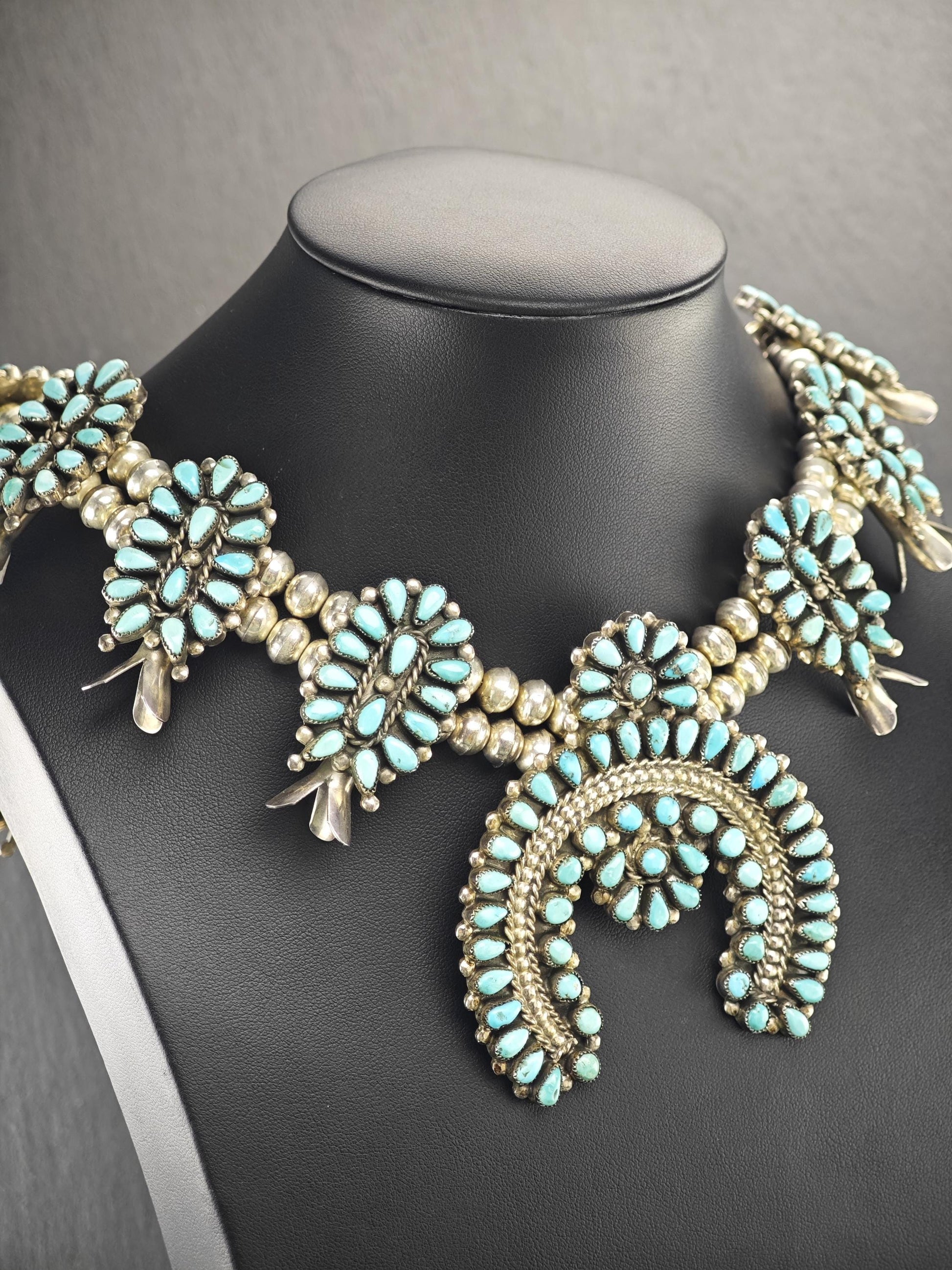 Vintage Native American Sterling Silver Blue Turquoise Cluster, Floral Squash Blossom Necklace