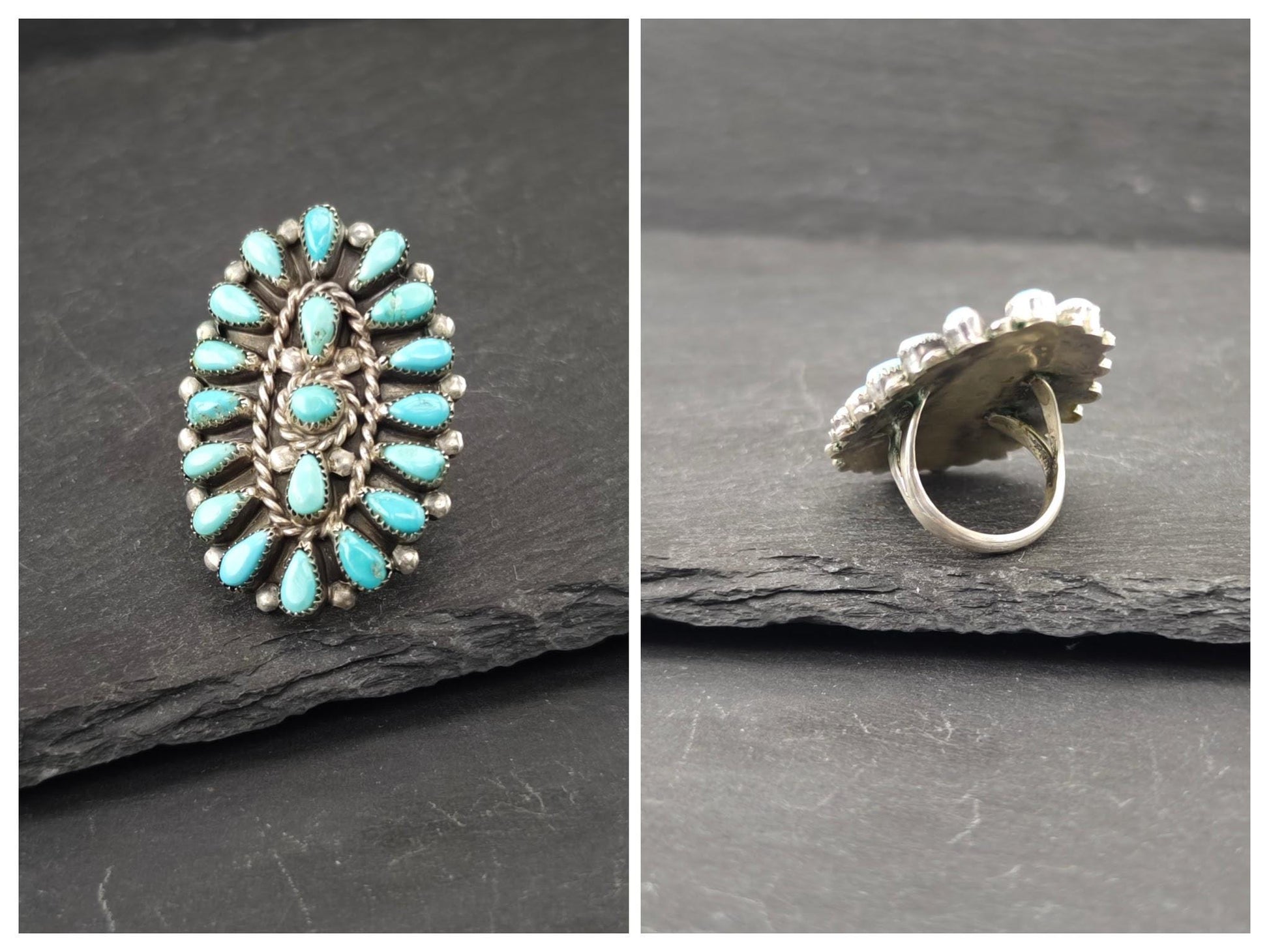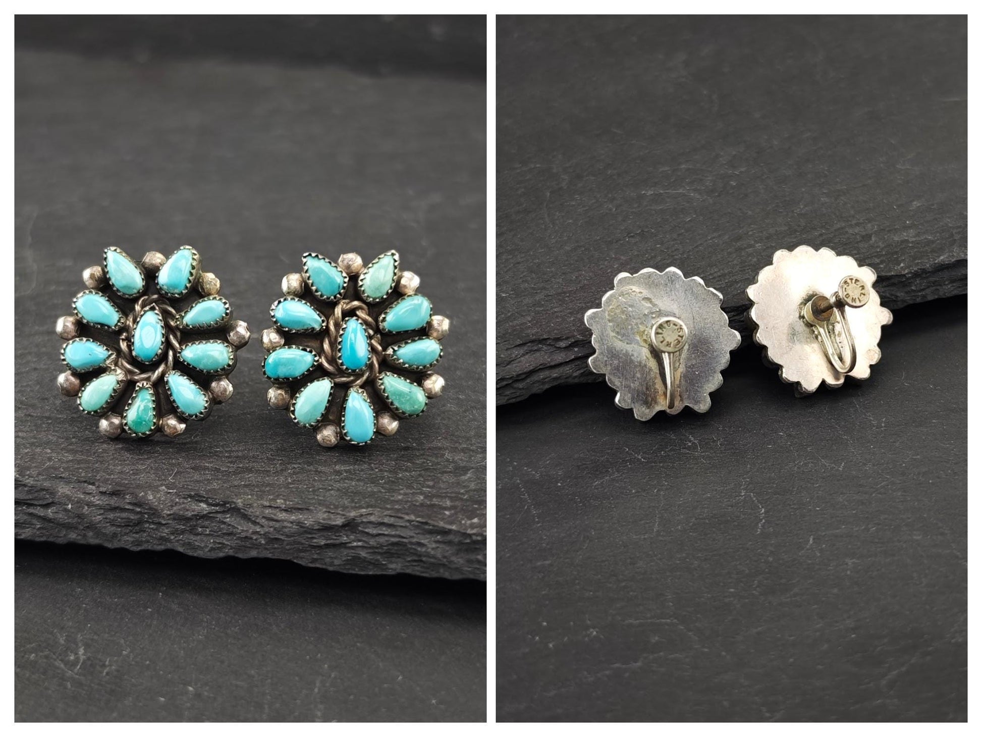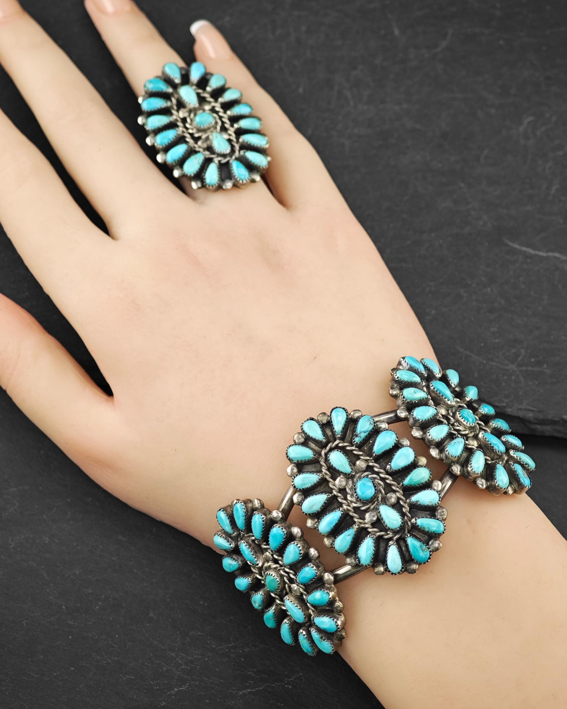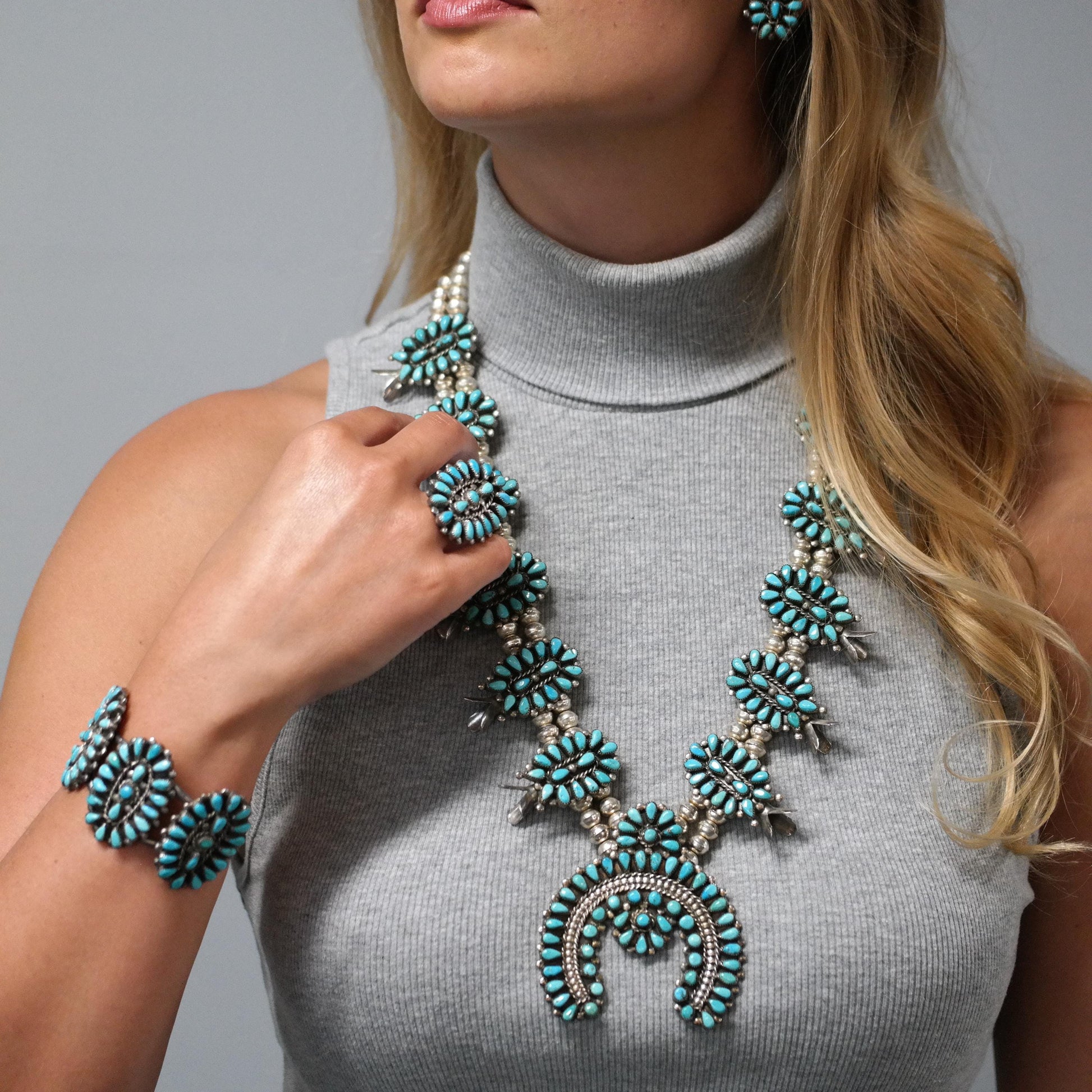 Native American Turquoise Cluster, Squash Blossom Necklace, Cuff, Earrings, Ring Set Sterling Silver