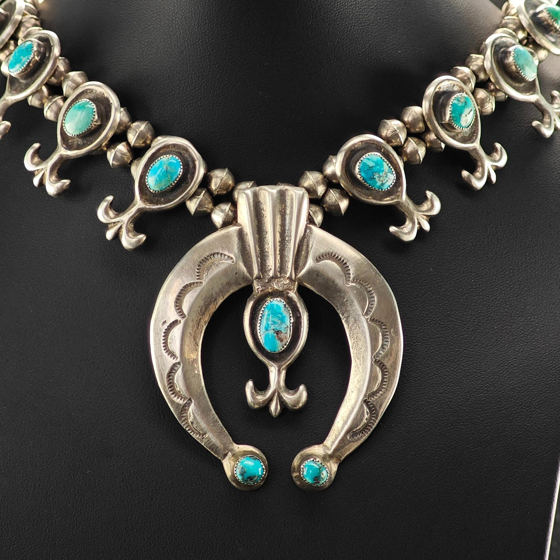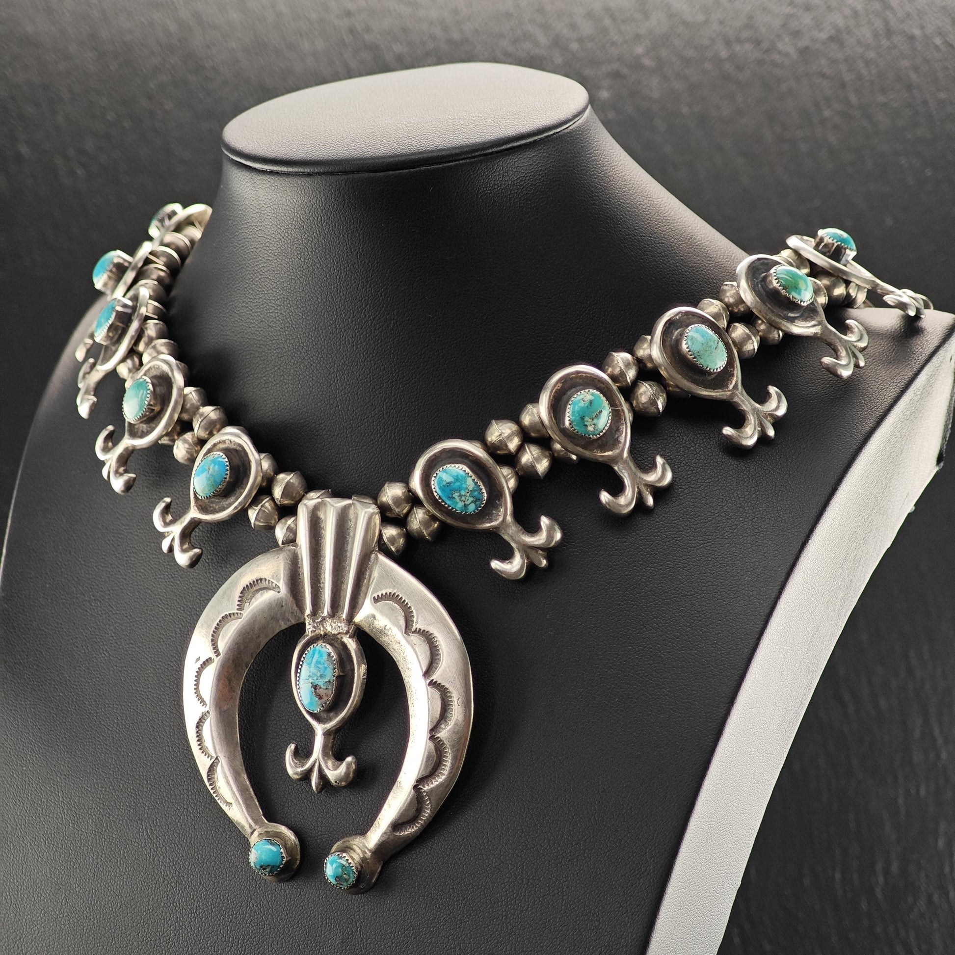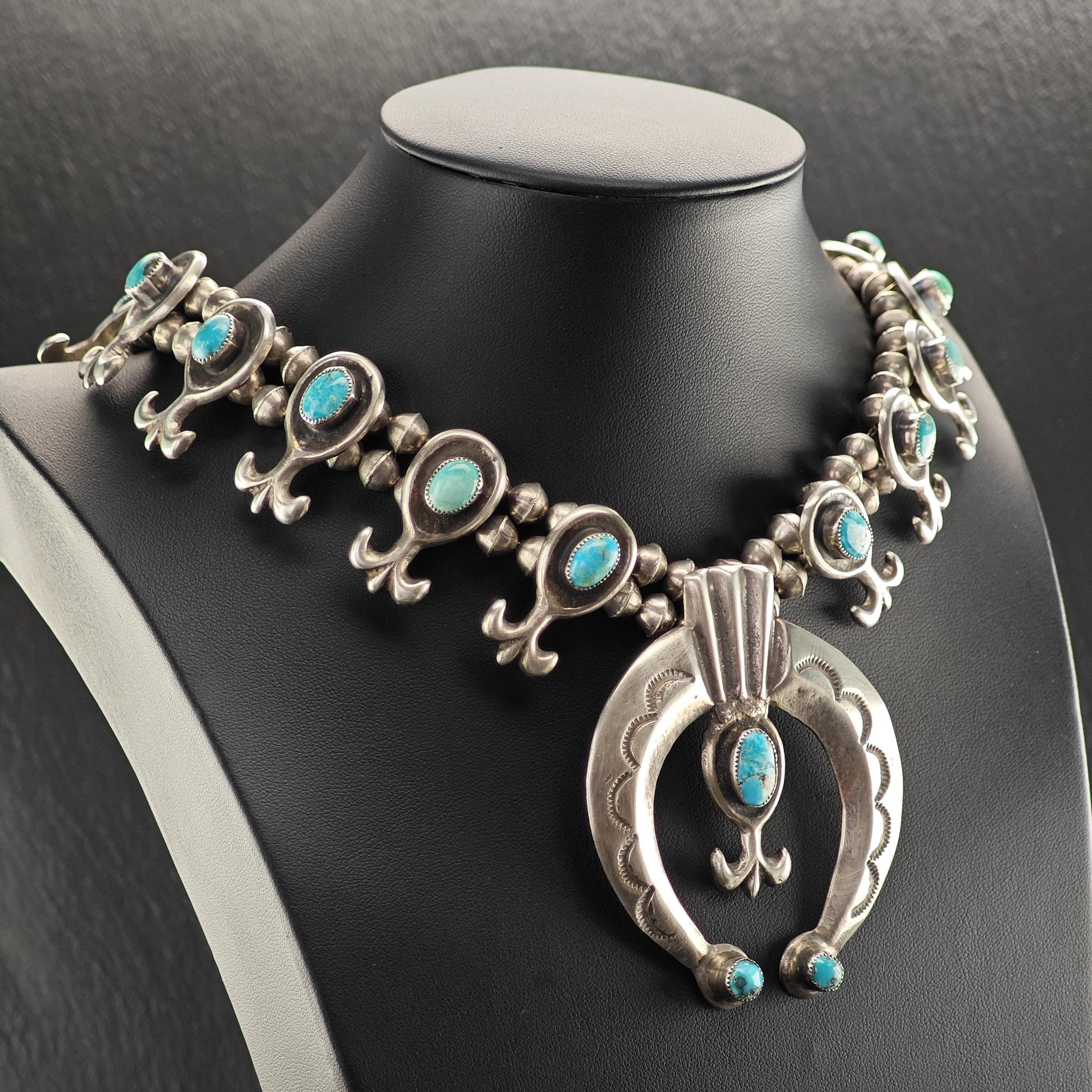 Discover the beauty of this Vintage Native American Sterling Silver Squash Blossom Necklace, featuring stunning blue turquoise in a traditional sandcast design. Weighing 173.9 grams, this exquisite piece is both a statement accessory and a testament to the craftsmanship of Native American artisans.