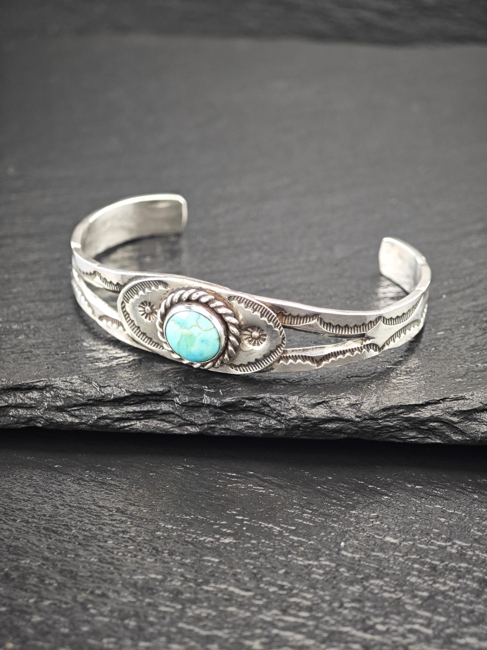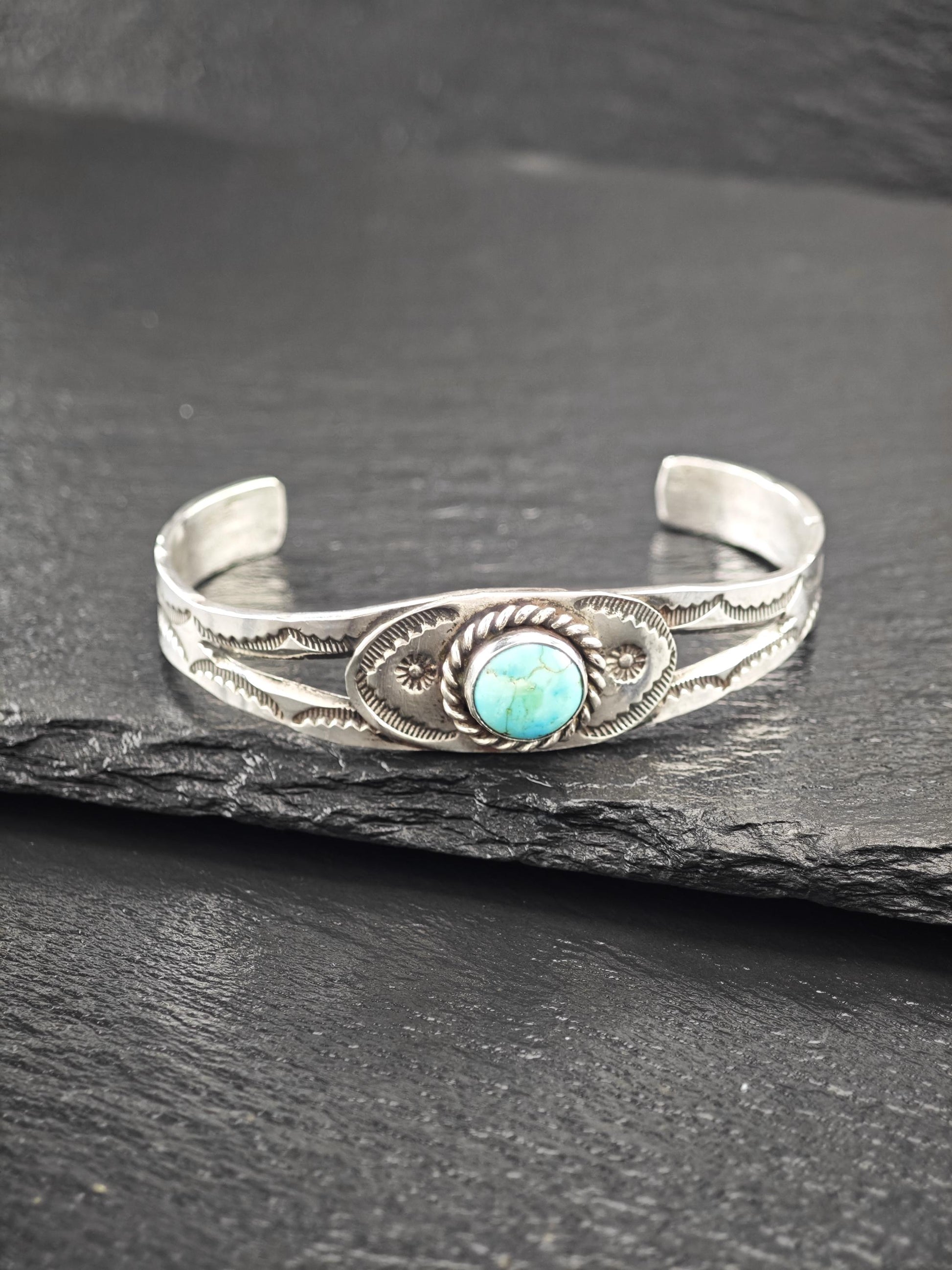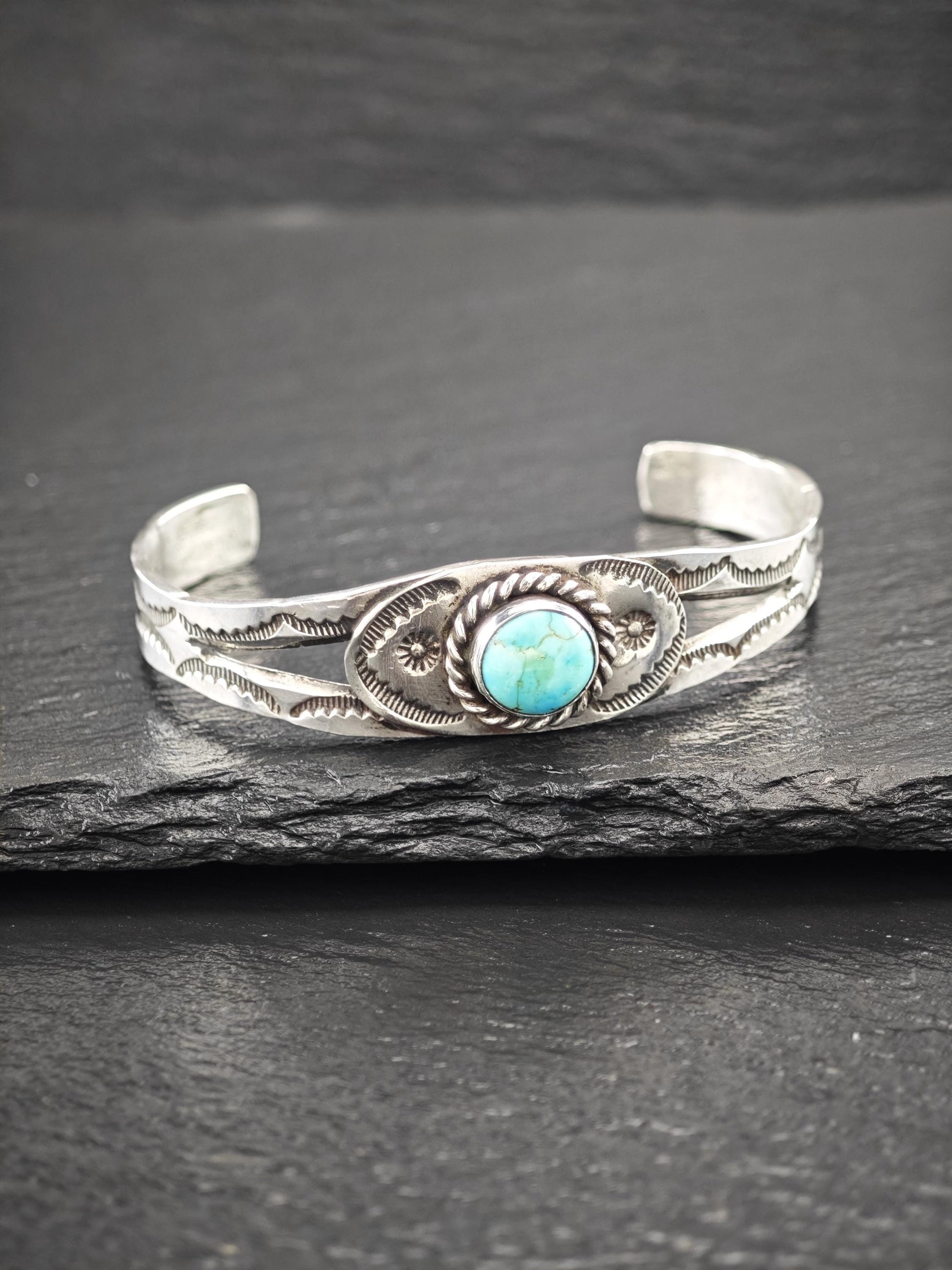 Vintage Native American Blue Turquoise, Stamped Cuff Bracelet Sterling Silver