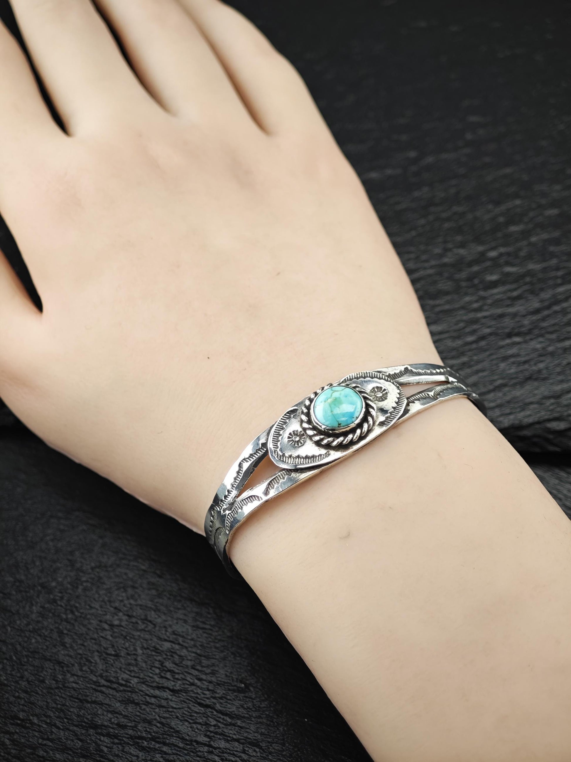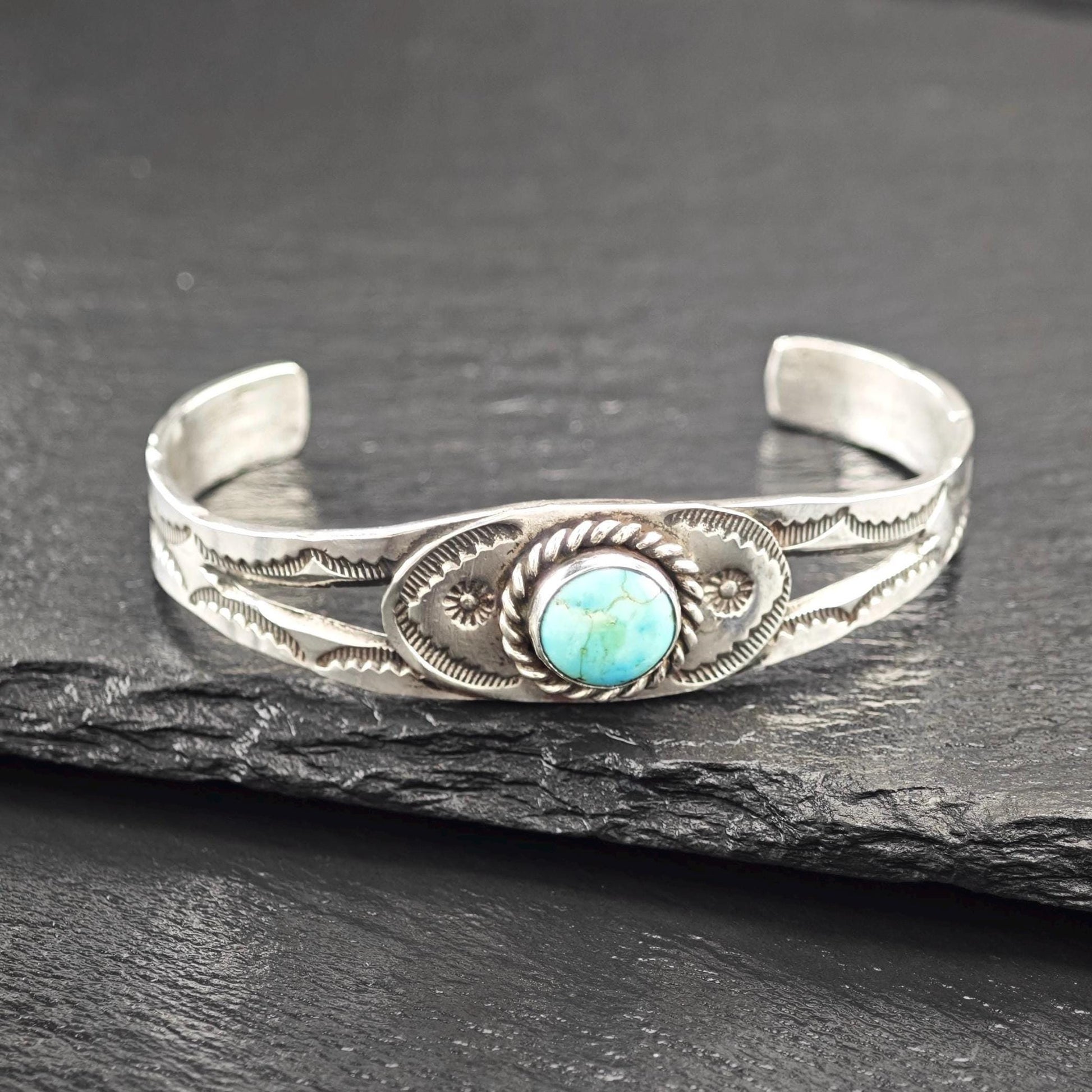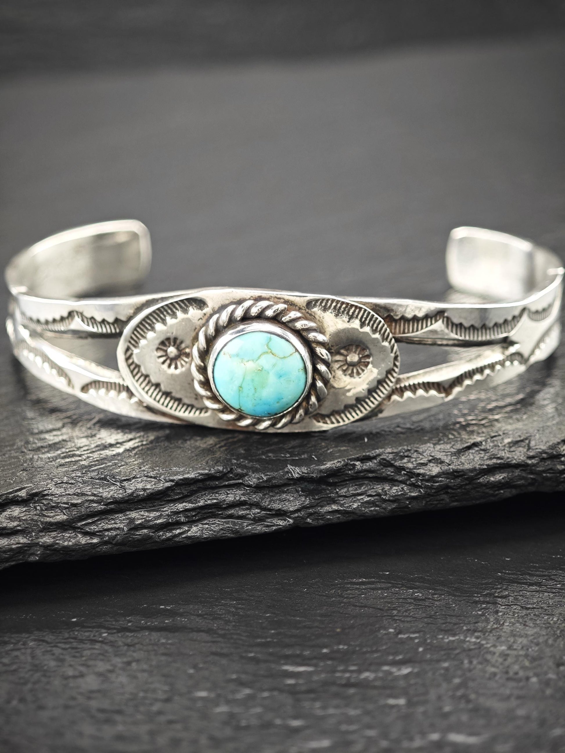 Vintage Native American Blue Turquoise, Stamped Cuff Bracelet Sterling Silver