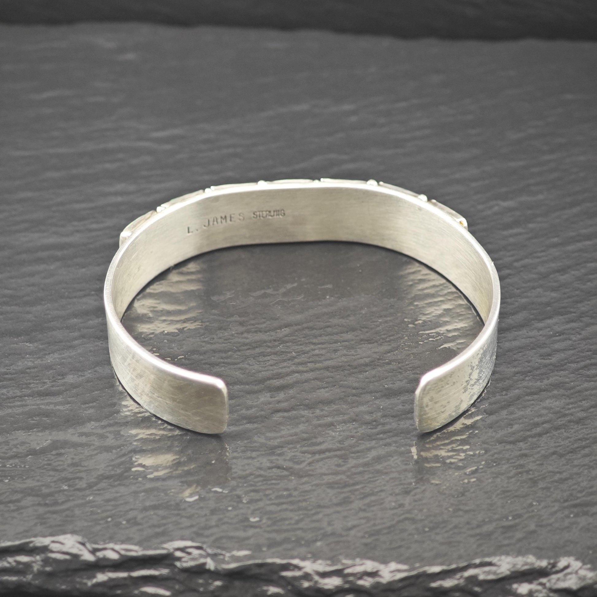 Discover the exquisite craftsmanship of this Navajo Leonard James Lab Opal Cuff Bracelet, expertly made from sterling silver. This stunning piece features the signature stamp "L. James," representing the talented Navajo artist Leonard James. Designed to fit a wrist size of 6 3/4", the bracelet has a tip to tip length of 5 1/2" and a width of 1/2". Weighing 29.4 grams, it feels substantial yet comfortable on the wrist.