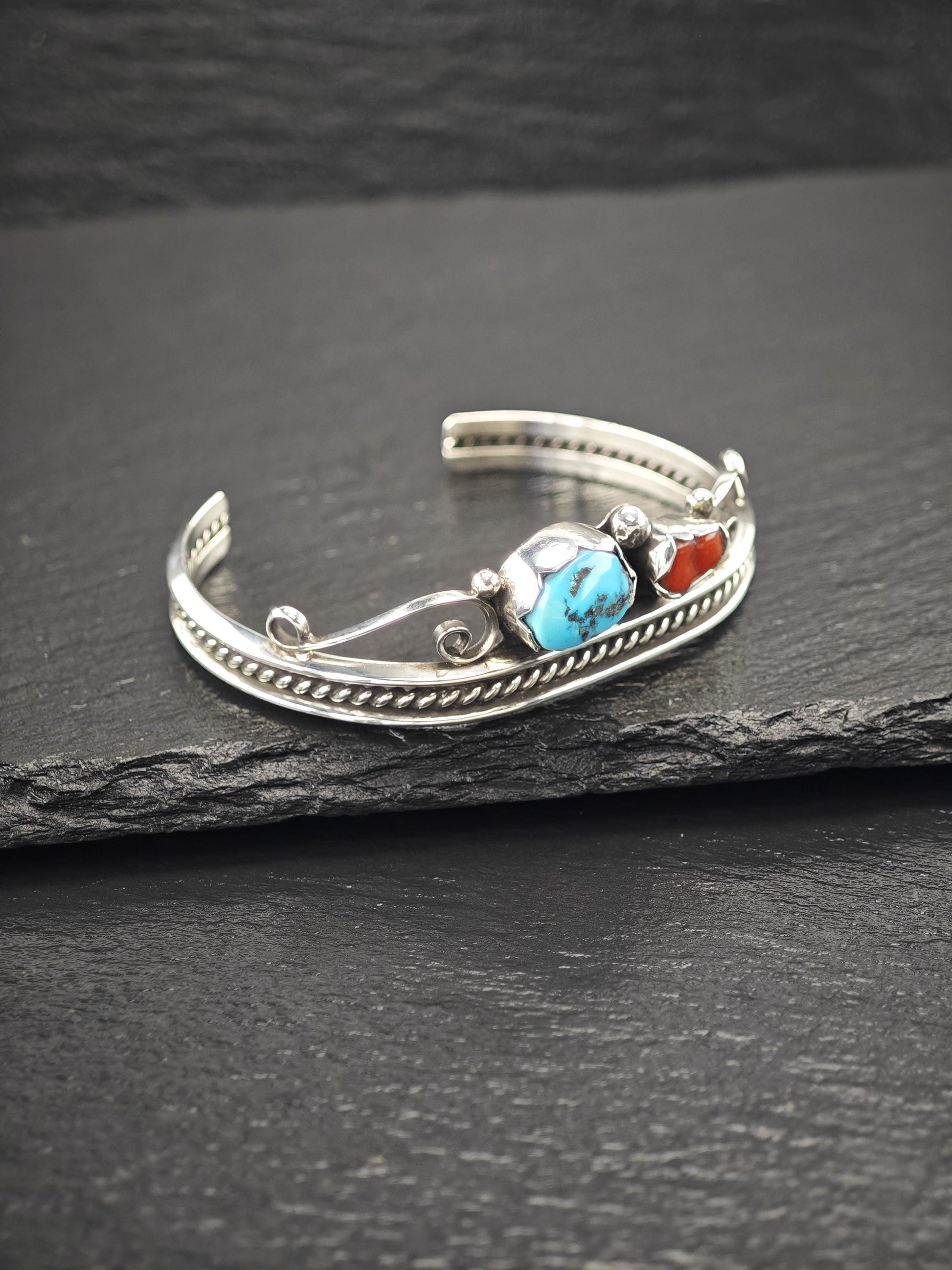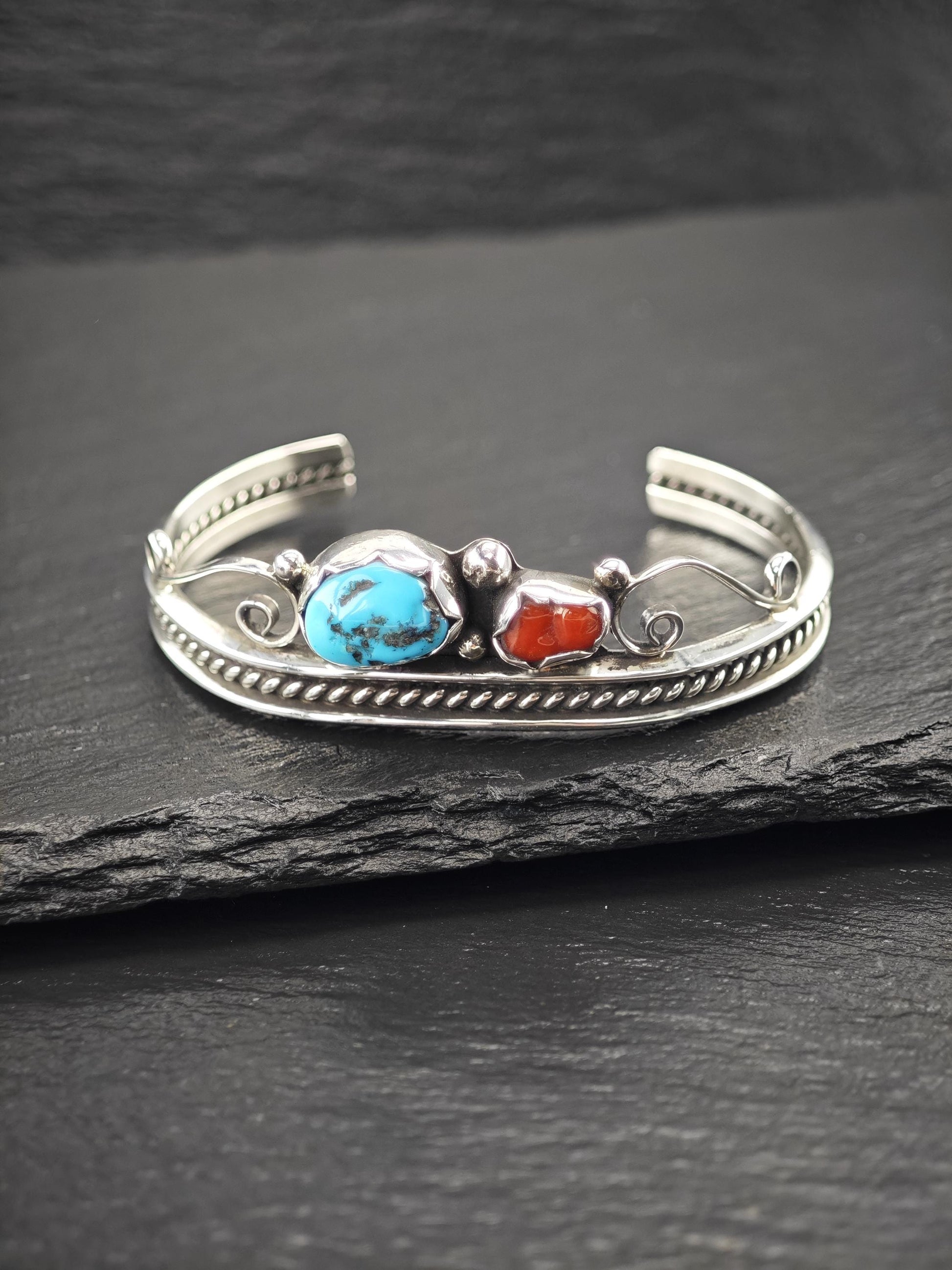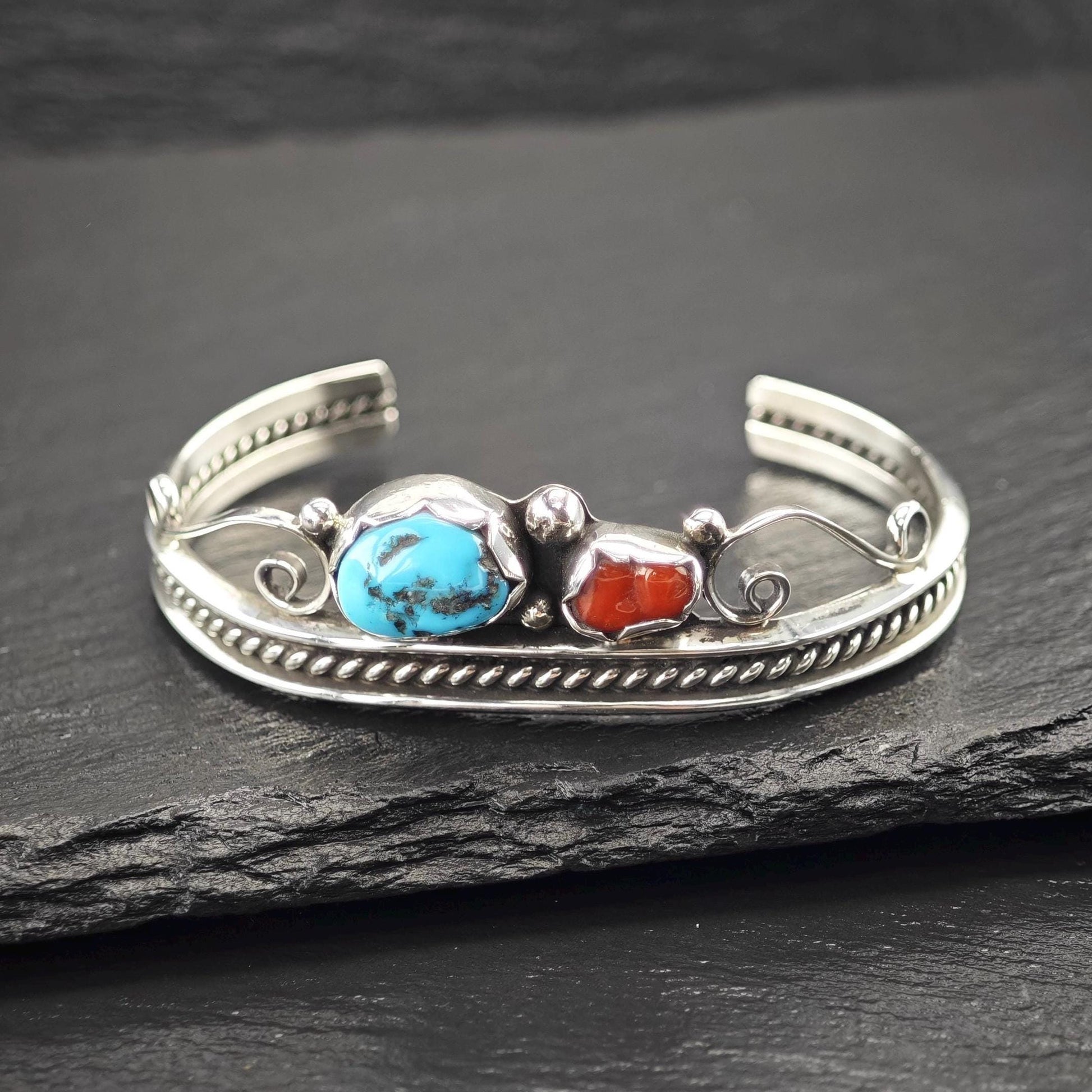 Vintage Navajo, Native American Blue Turquoise, Red Coral Cuff Bracelet Sterling Silver