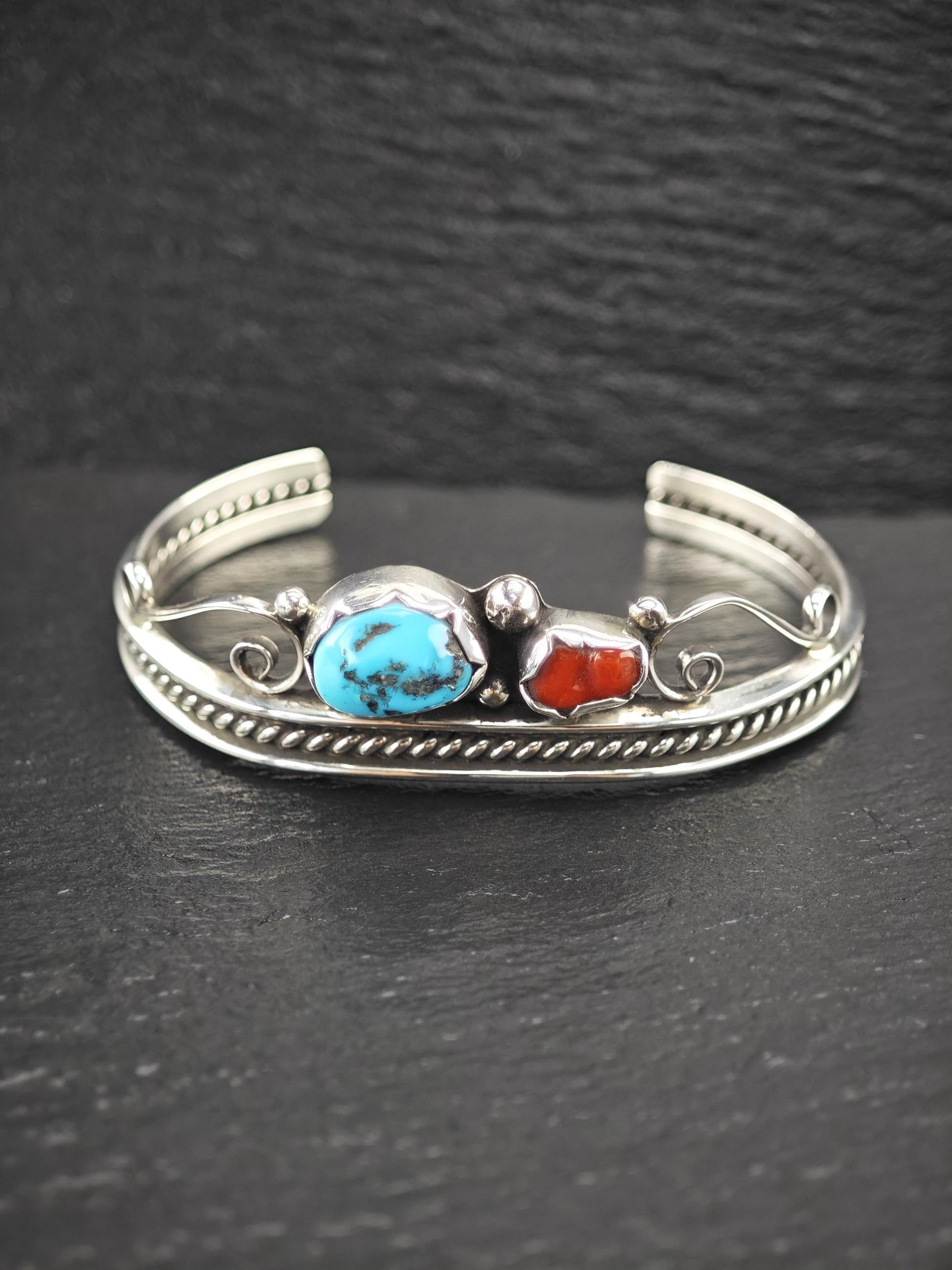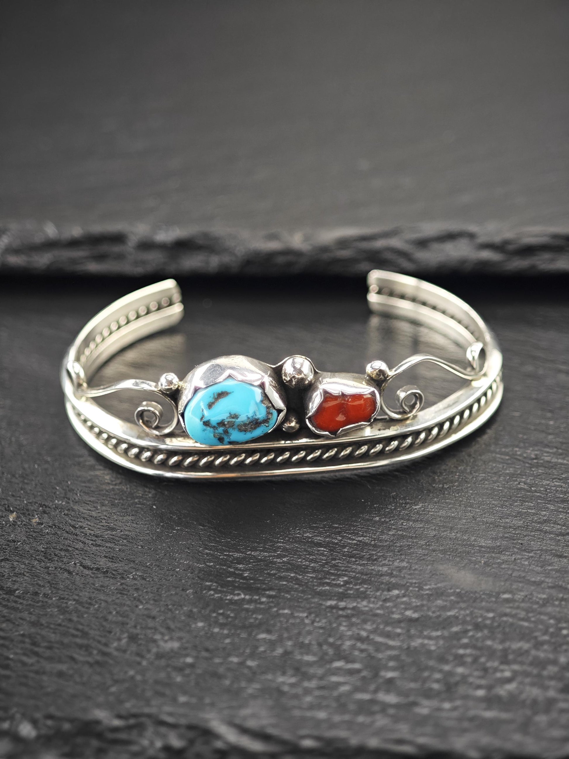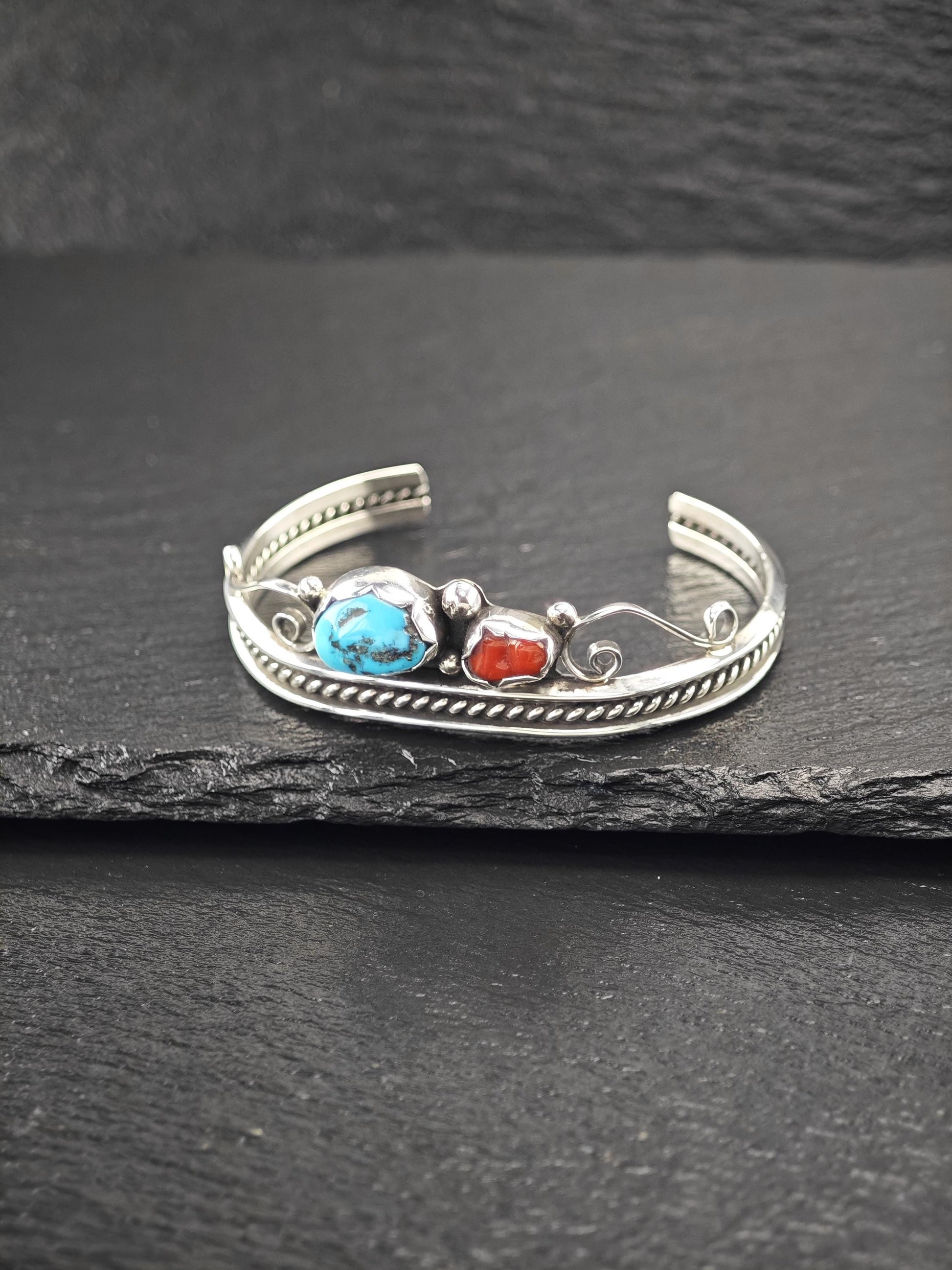 Vintage Navajo, Native American Blue Turquoise, Red Coral Cuff Bracelet Sterling Silver