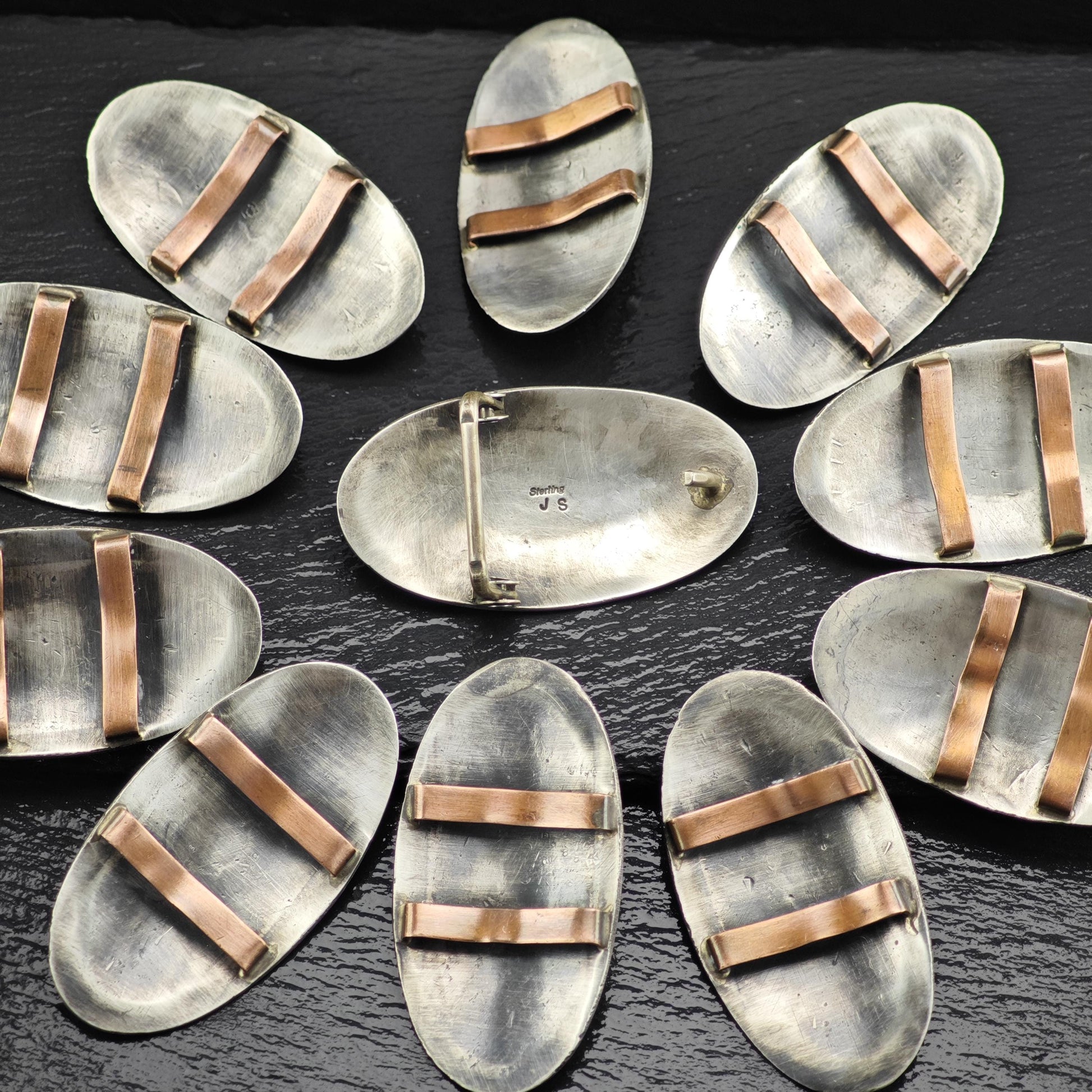 In terms of condition, this belt buckle and conchos are in very good shape, having been lightly cleaned and showing only age-appropriate wear. There is a moderate patina that adds character, though please note that the cabochon on the belt buckle has a small chip. The buckle's belt loop measures 7/8" x 5/8", while the concho loops measure 1" x 1/8".