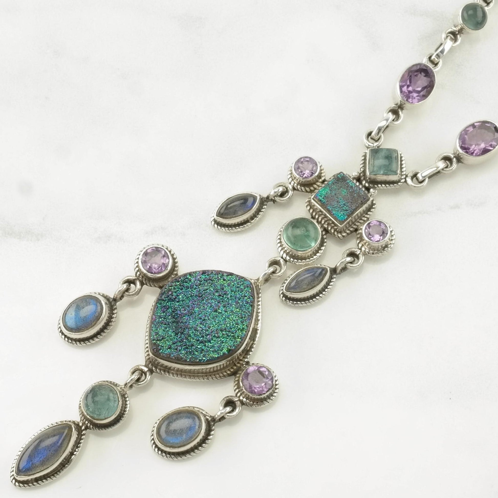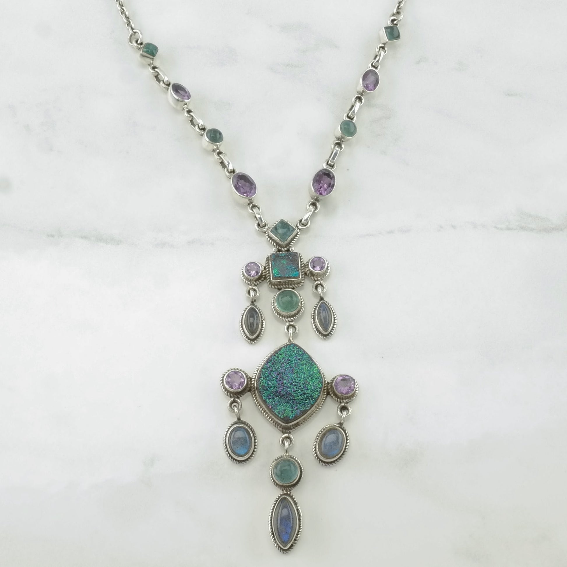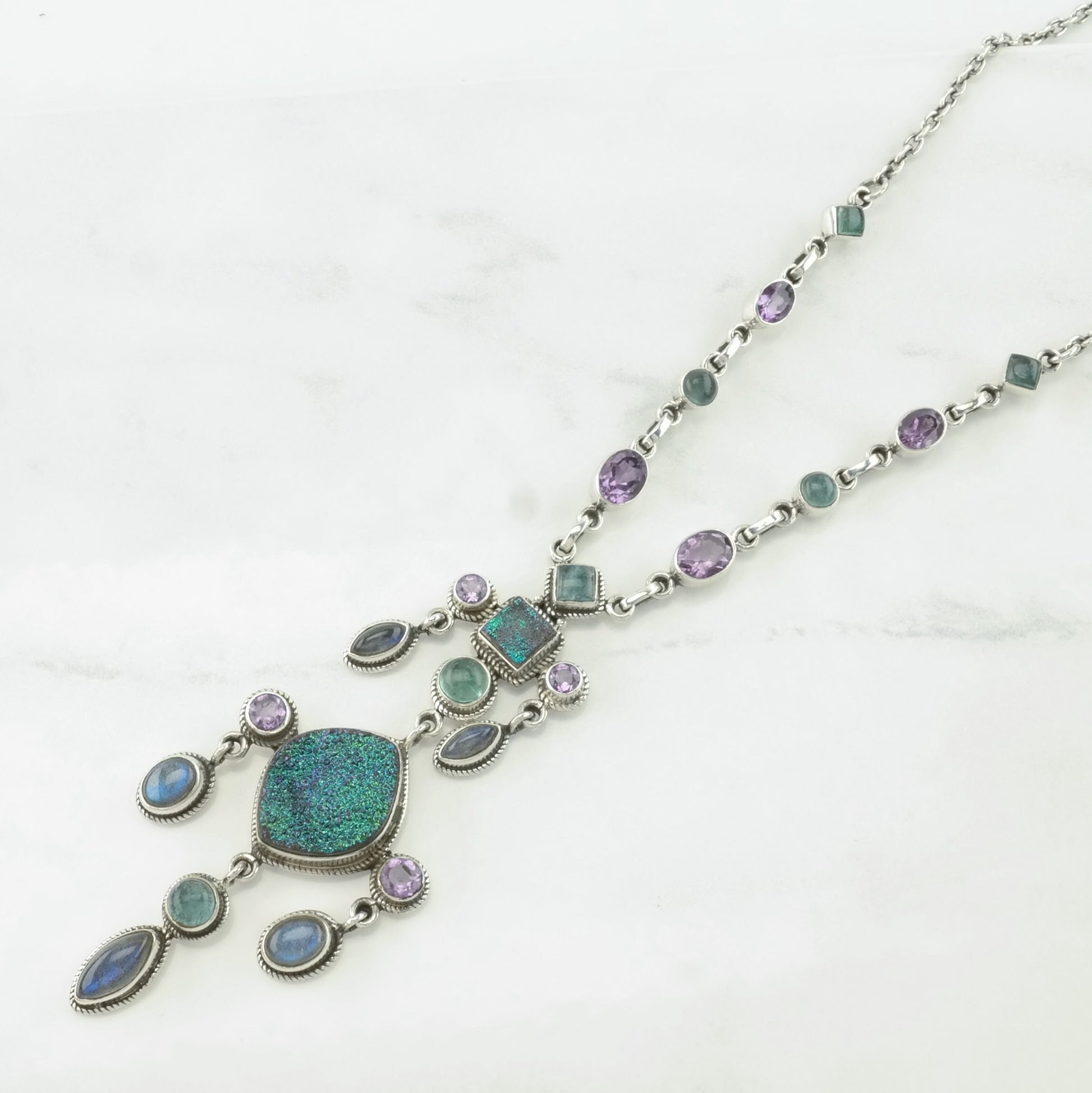 Nicky Butler Dangle Necklace Sterling Silver Purple, Green Labradorite, Amethyst, Druzy