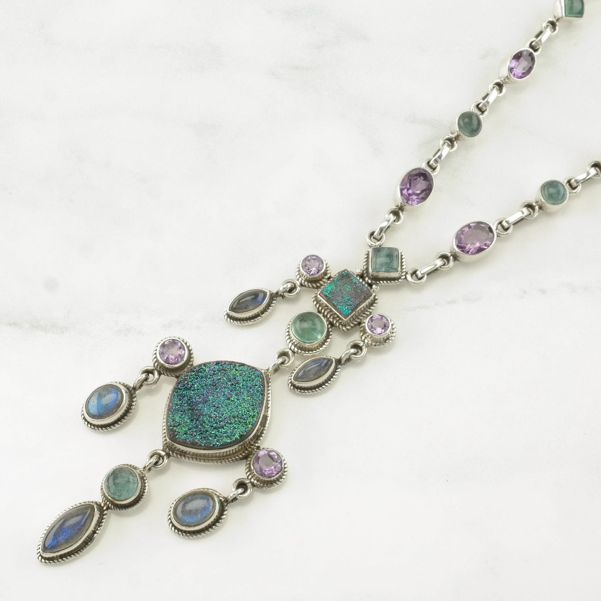 Vintage Nicky Butler Sterling Silver Purple, Green Labradorite, Amethyst, Druzy Dangle Necklace