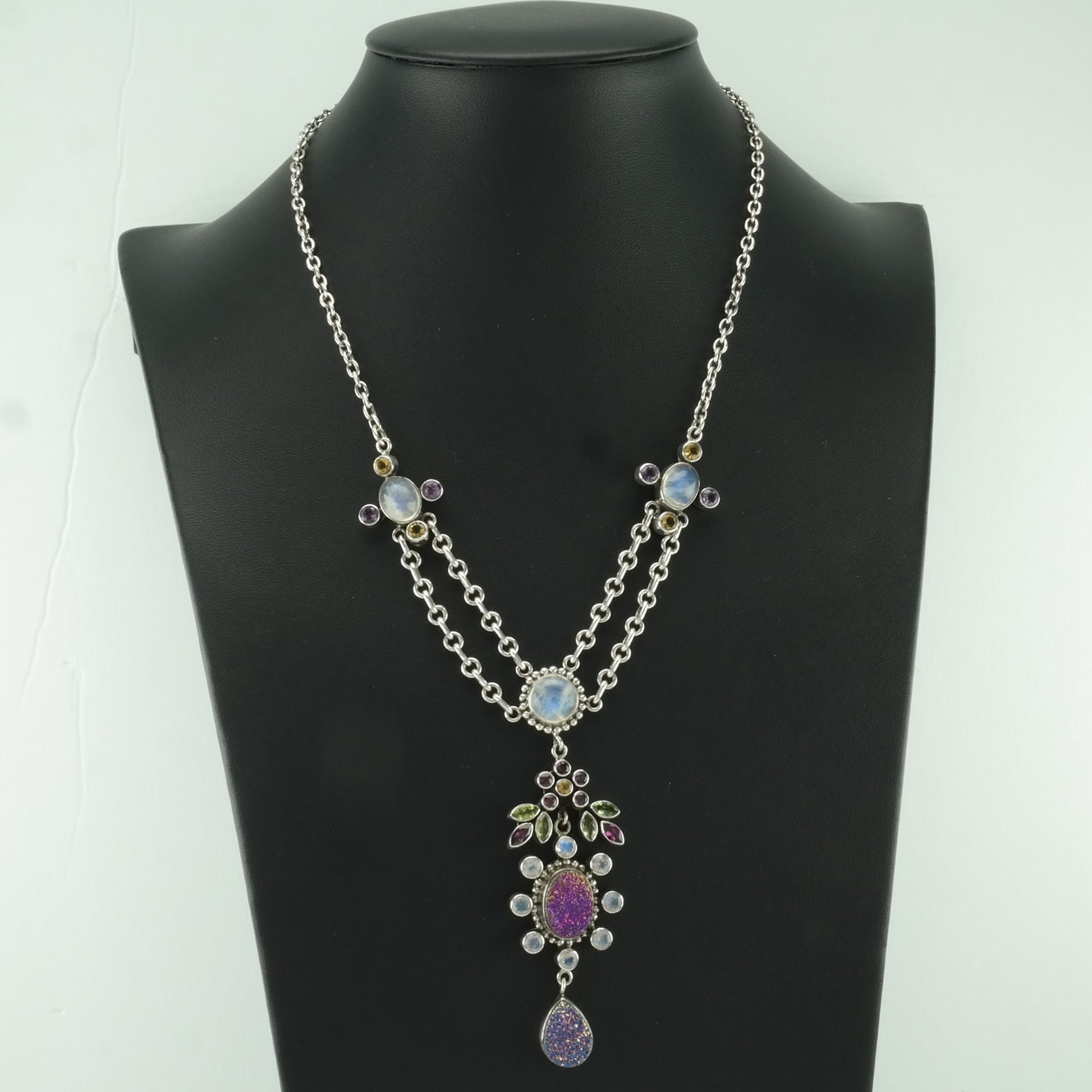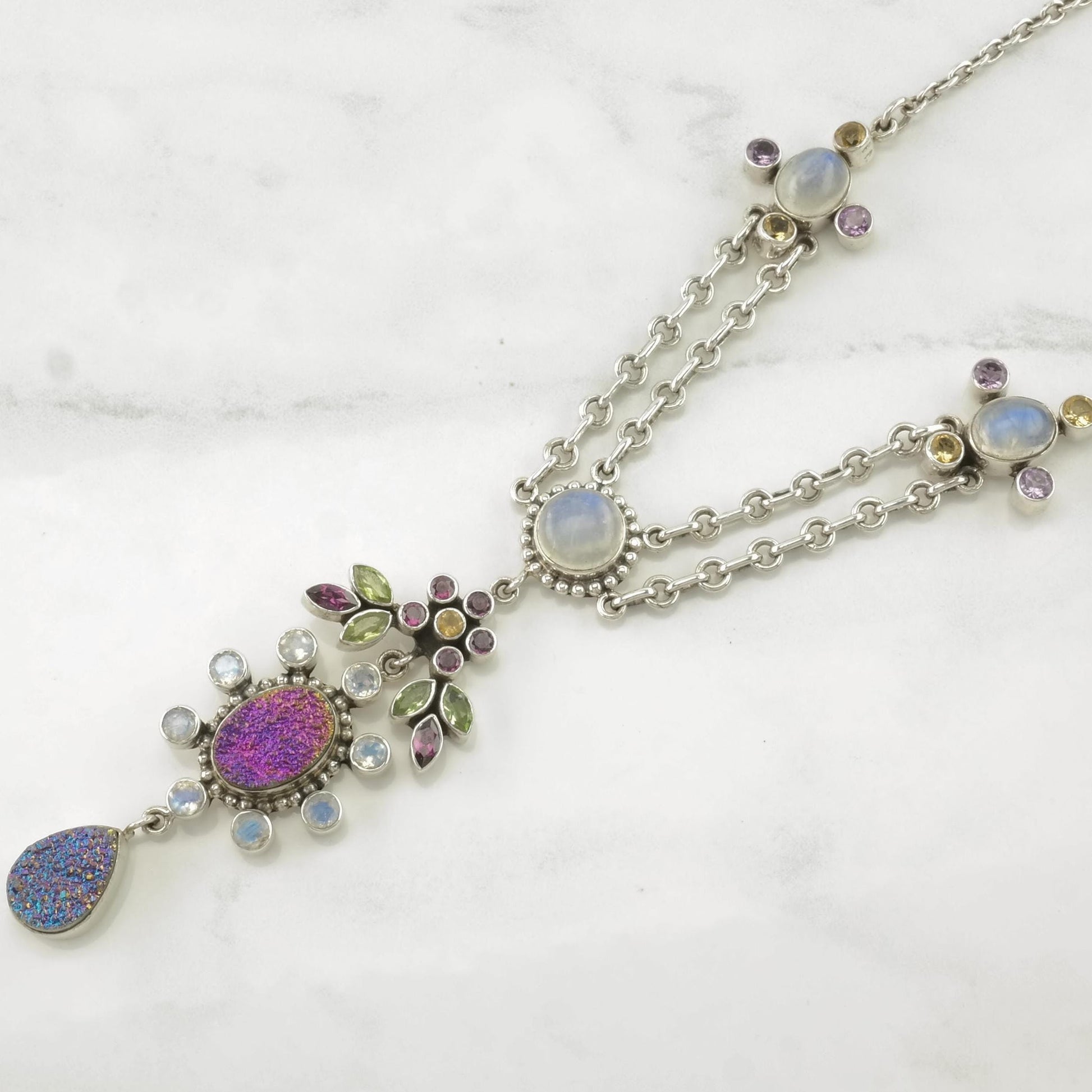 Vintage Nicky Butler Sterling Silver Rainbow, Pink Moonstone, Prasiolite, Amethyst, Druzy, Peridot Floral, Cluster, Teardrop Necklace
