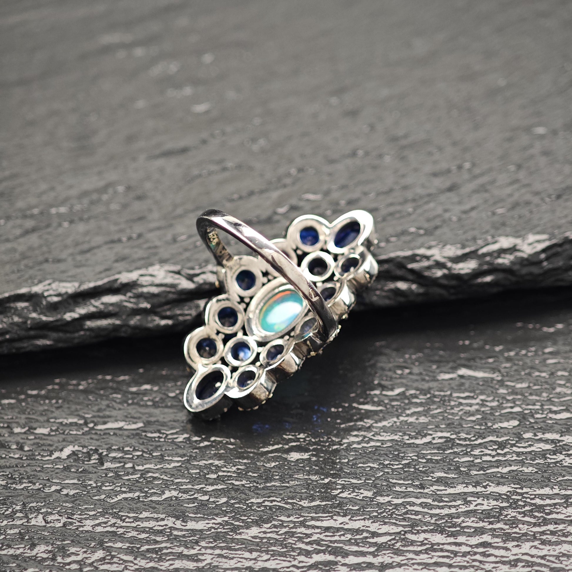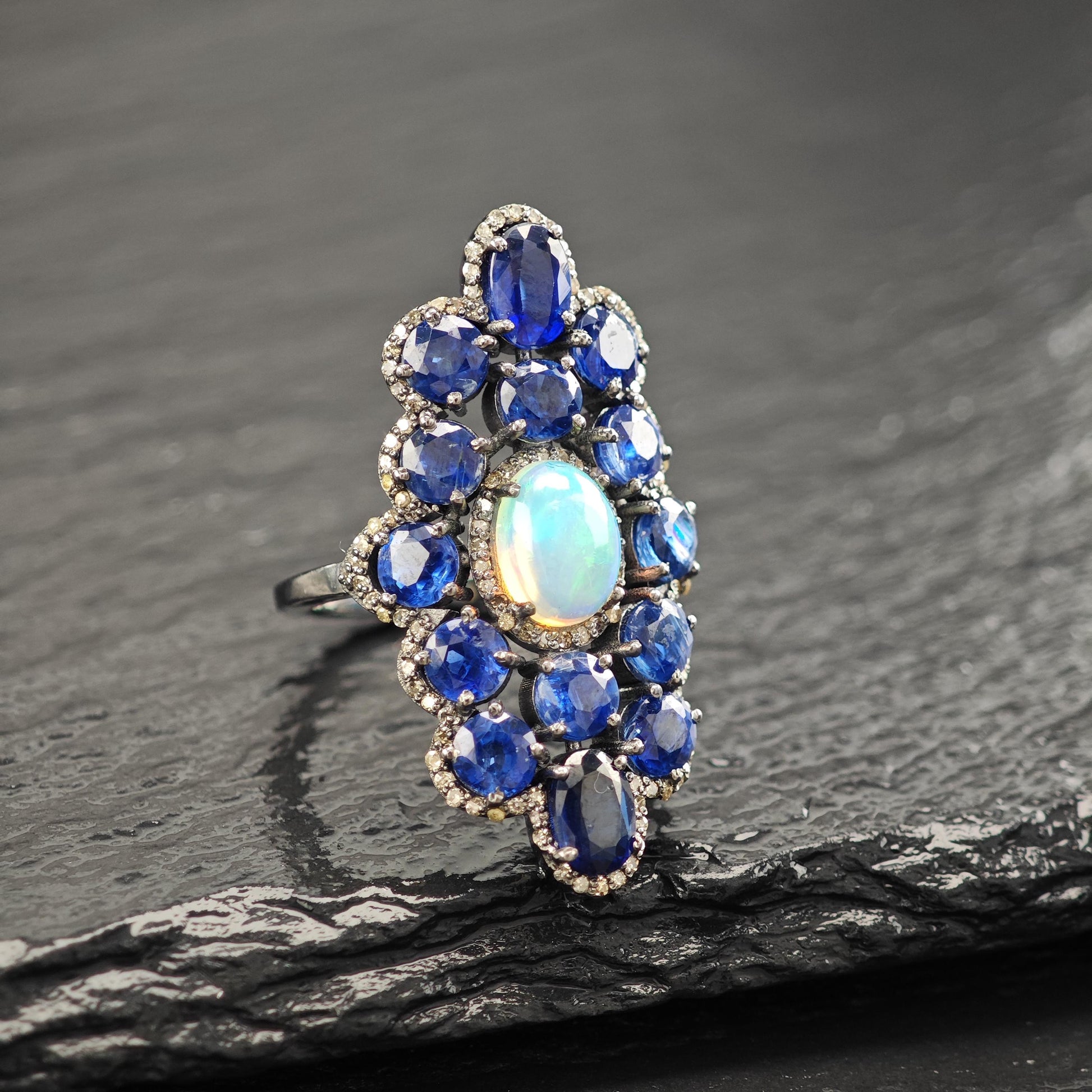 Oxidized Sterling Silver Diamond Sapphire, Opal Ring