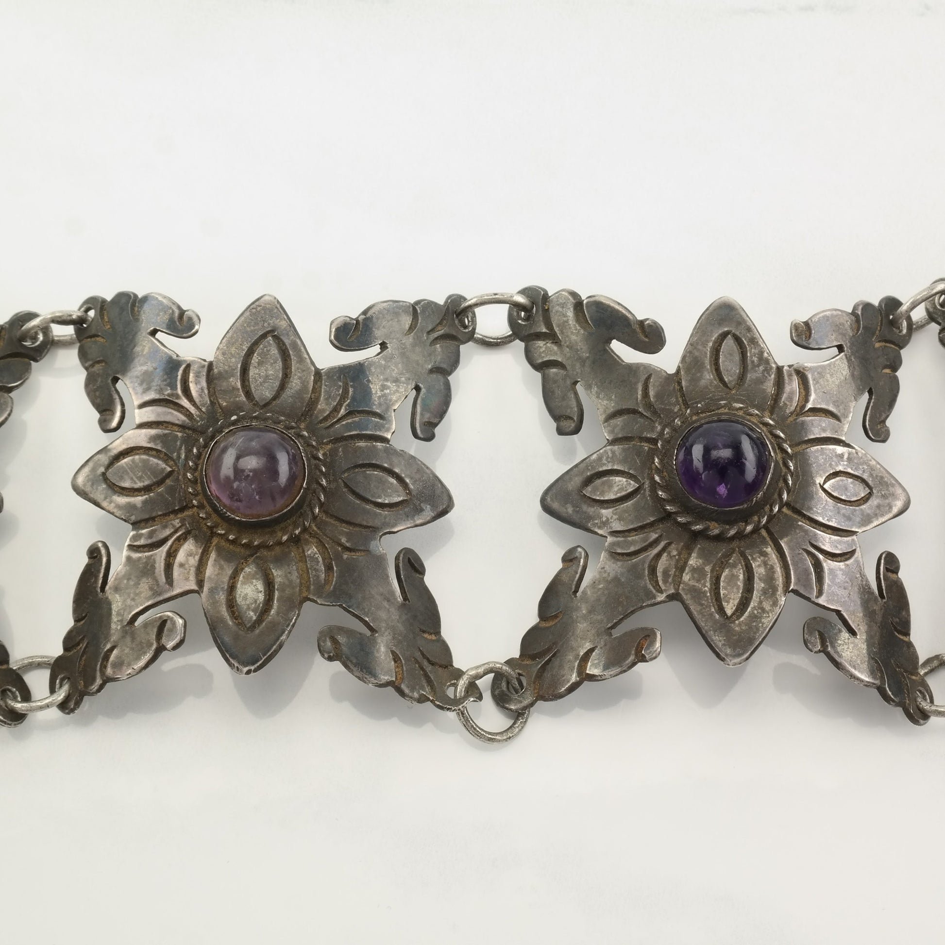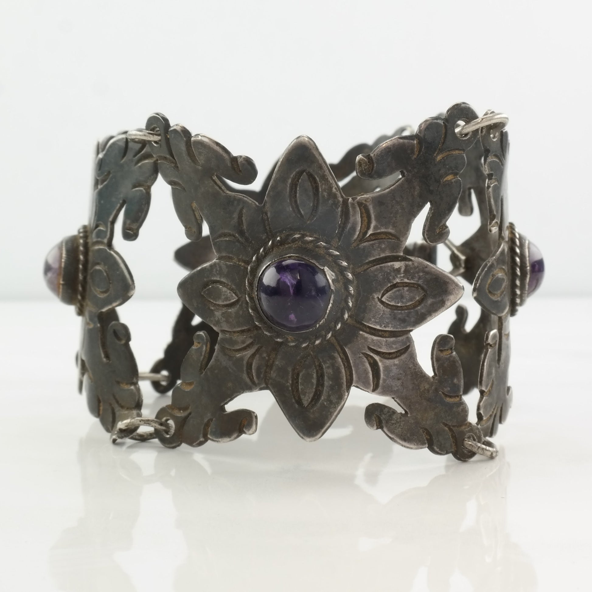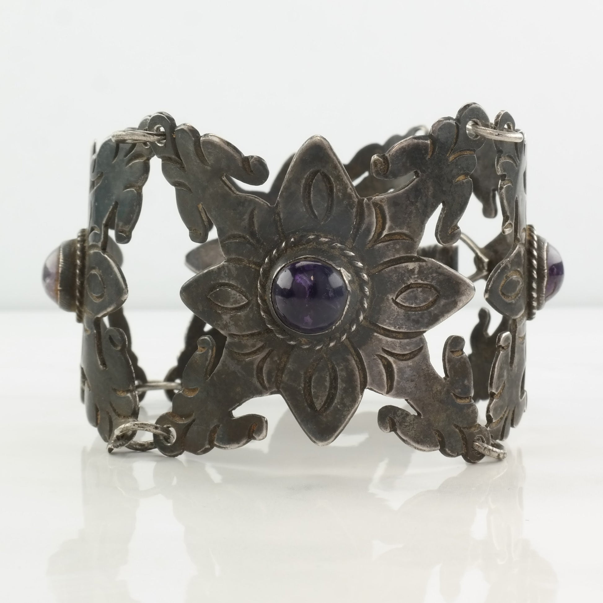 Pre Eagle, Taxco Sterling Silver Link Bracelet Purple Amethyst Floral