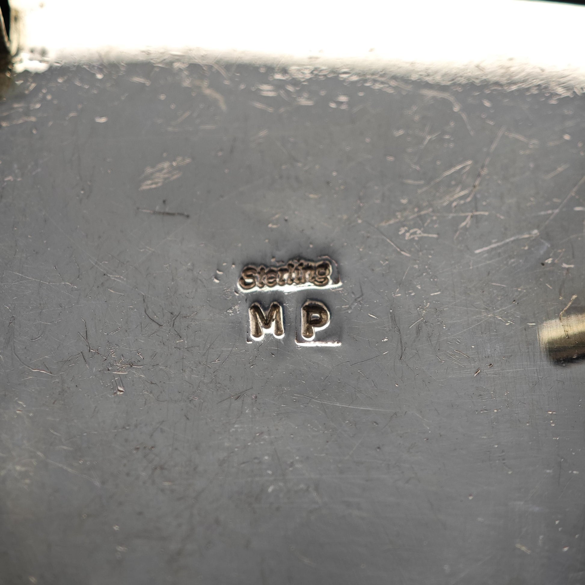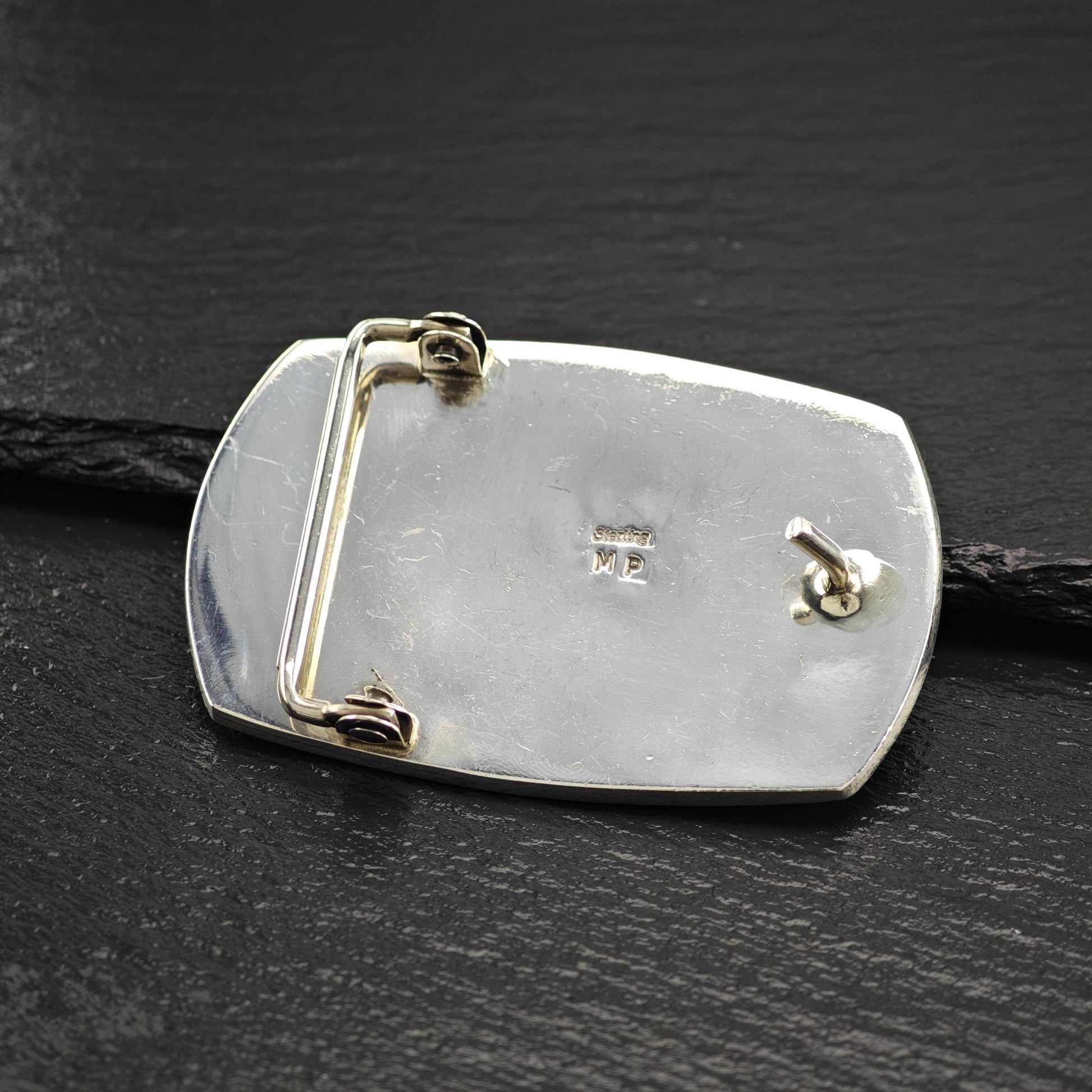Measuring 1 7/8" x 3", this buckle is marked with "Sterling" and the artist's initials, "MP." The vibrant red coral stone is natural and untreated, beautifully inlaid to create a striking focal point. The condition is excellent, having been cleaned and polished to a like-new finish, with some age-appropriate patina that adds character.