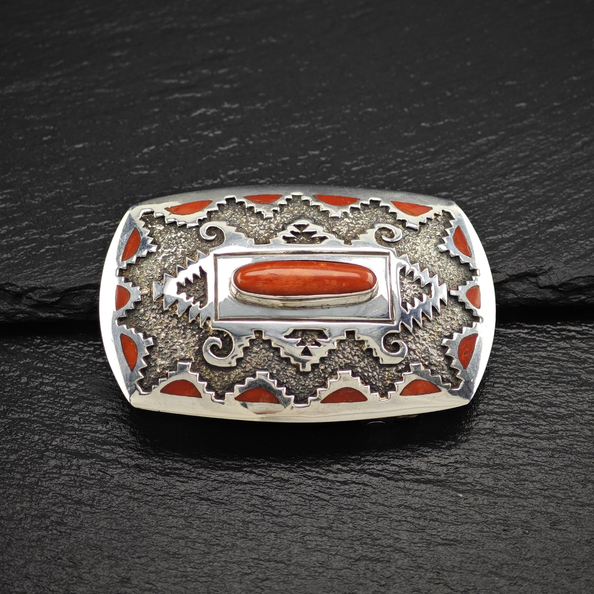 Red Coral Belt Buckle by Michael Perry Sterling Silver Native American Jewelry