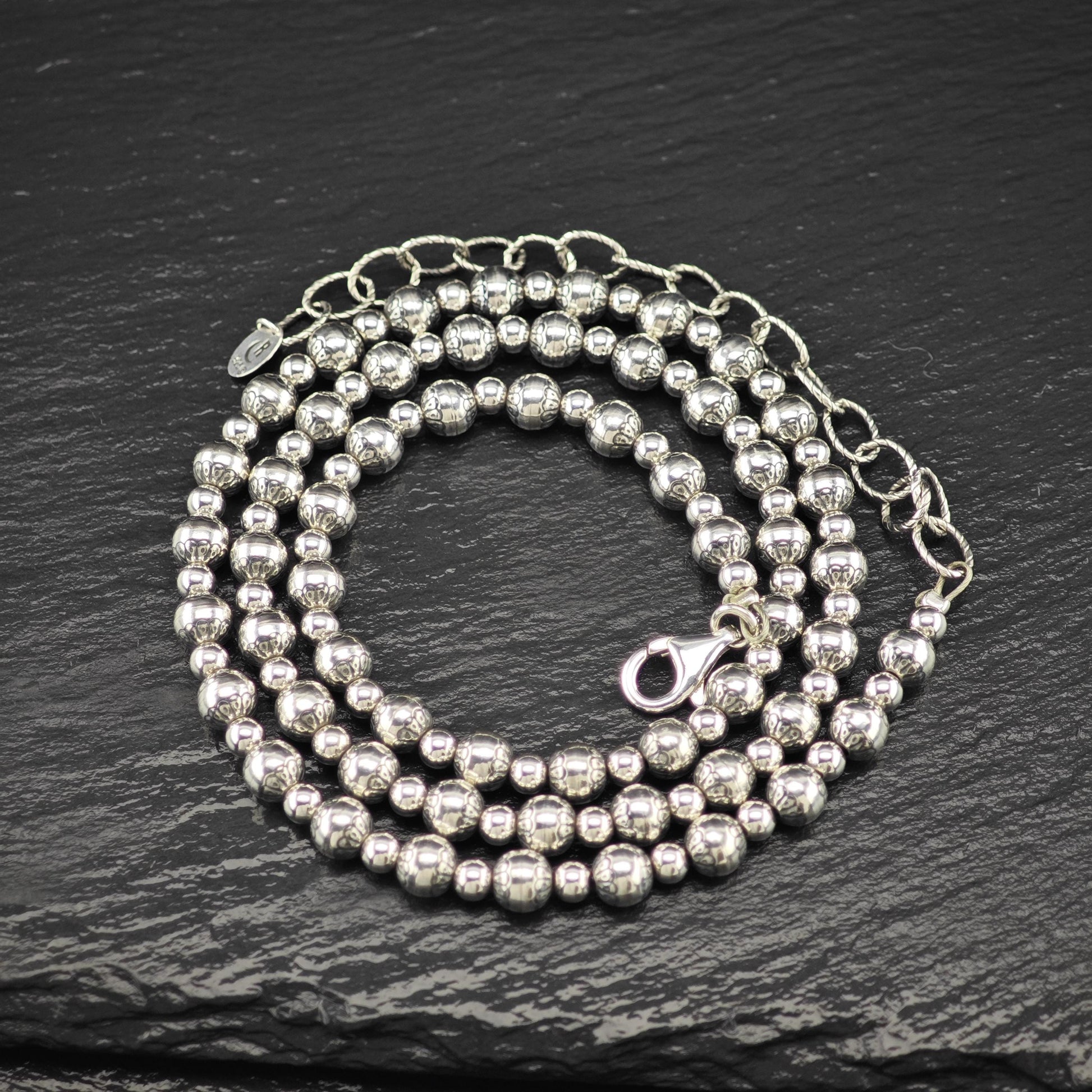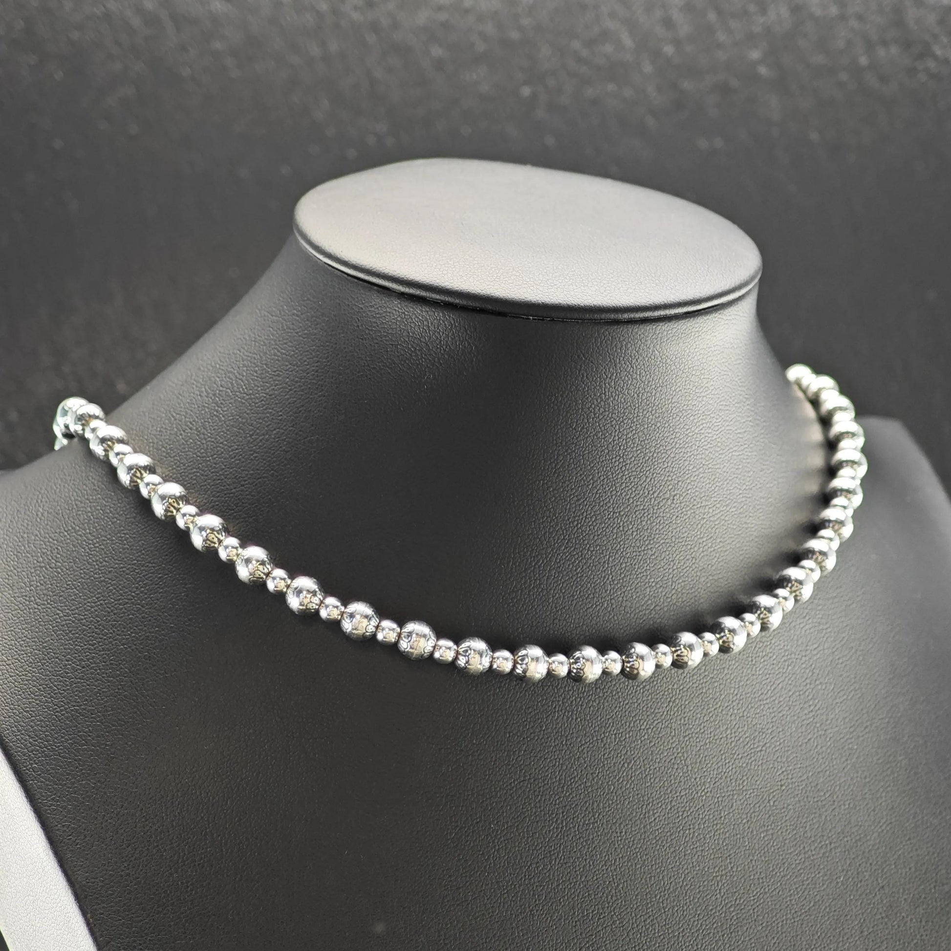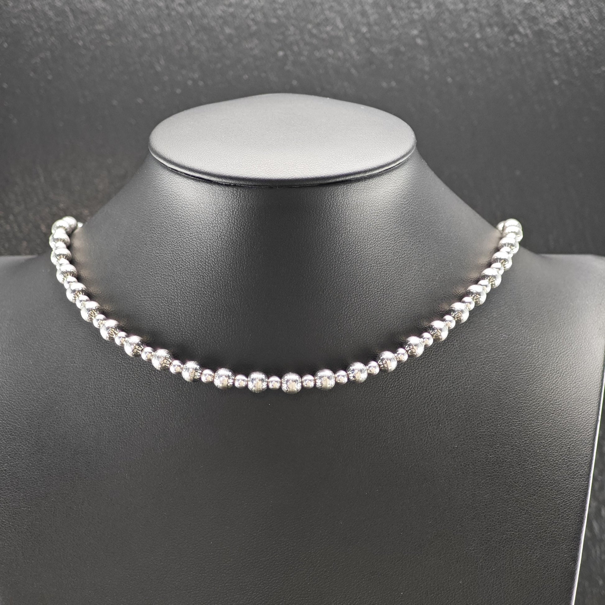 Please note: color variations in photos are due to reflections; the actual necklace displays an even, beautiful silver tone.