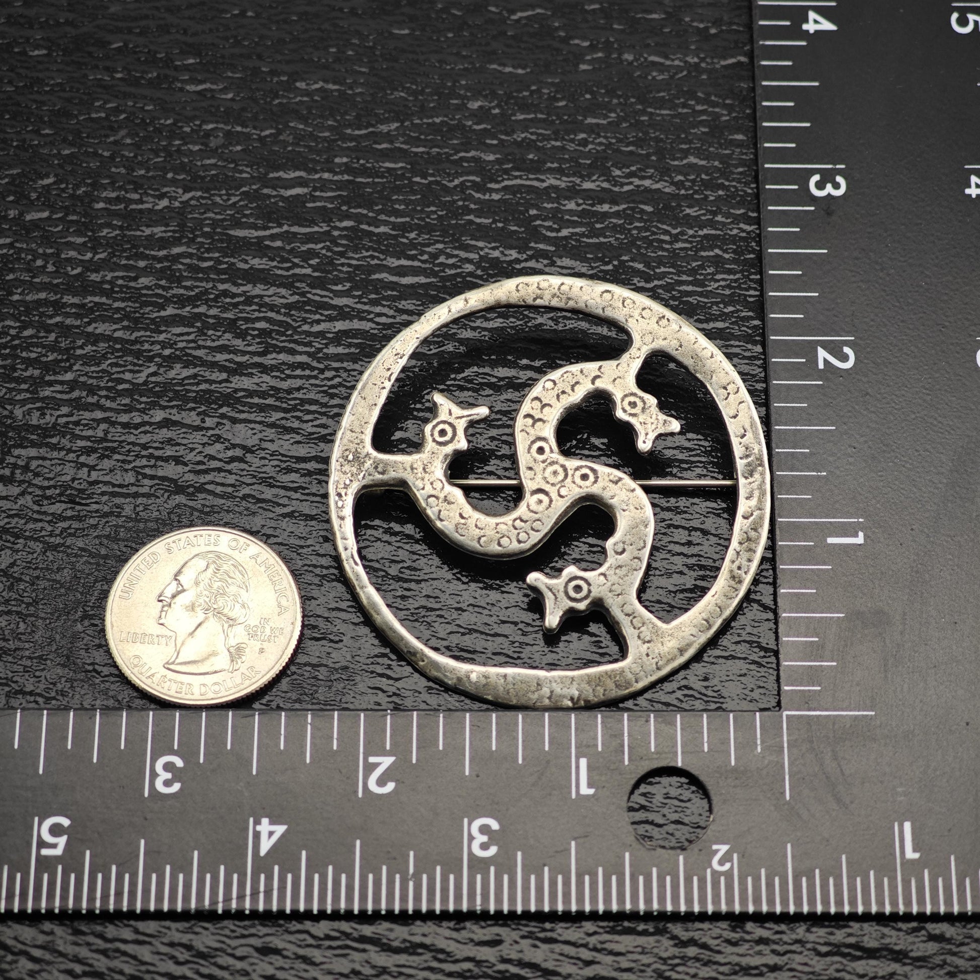 Discover the charm of this exquisite Sea Serpent brooch, crafted from sterling silver and dating back to circa 1990. This stunning piece measures 2 1/4 inches in length and 2 1/4 inches in width, making it a perfect accessory to elevate any outfit. Weighing in at 18 grams, it offers a substantial feel without being overly heavy.