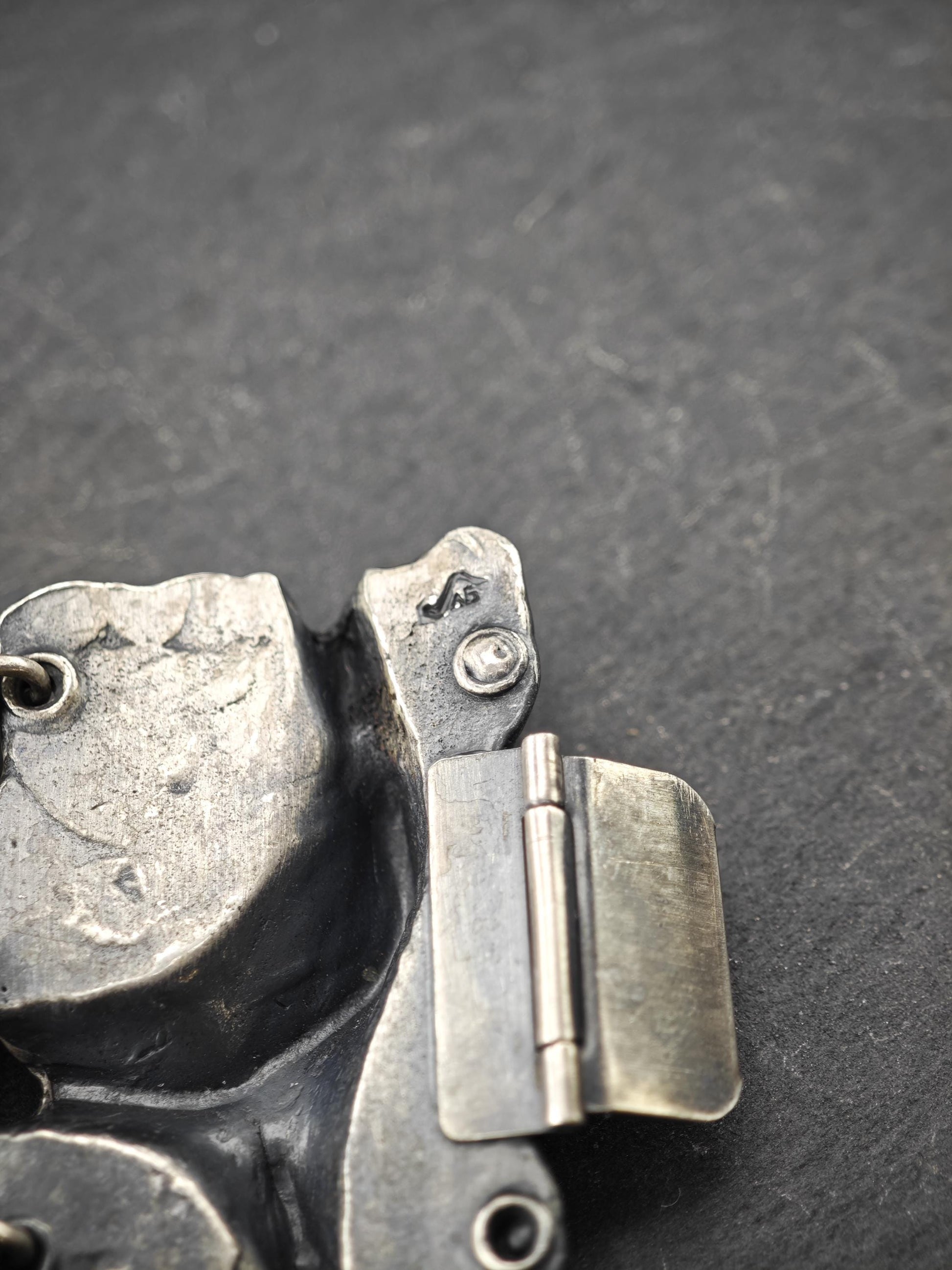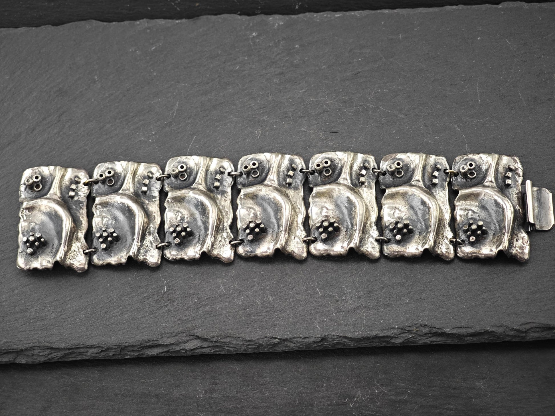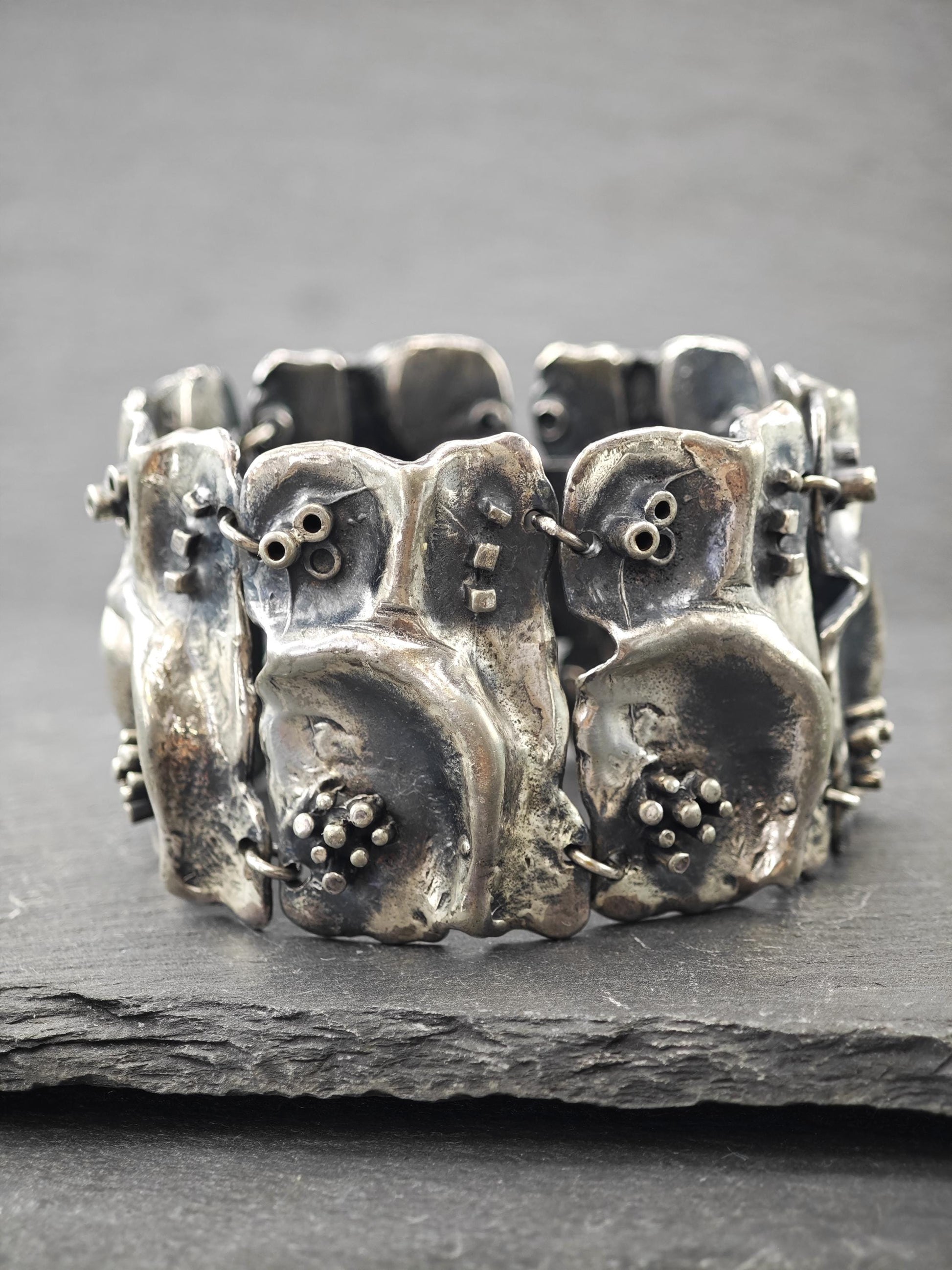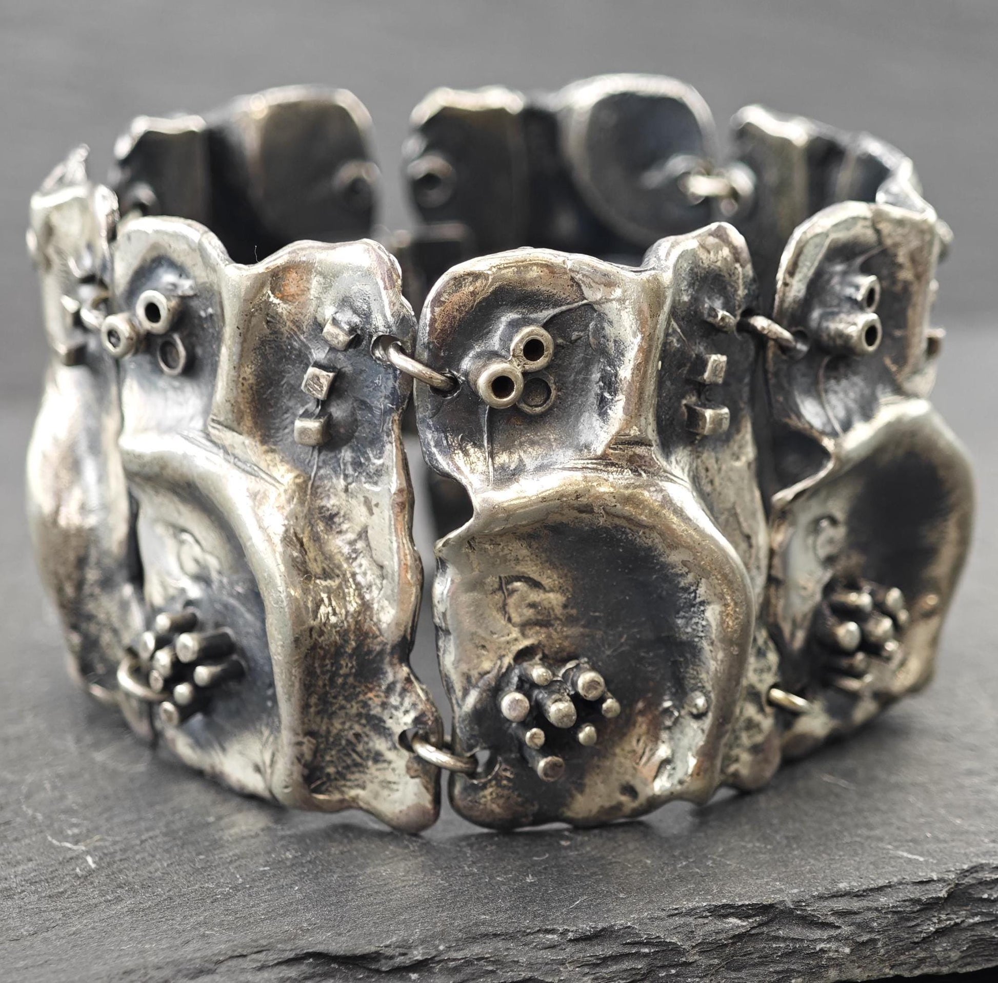 Signed, Brutalist non precious metal, Wide Panel Link Bracelet Stamped Not Sterling Silver, possibly checkmark VS, Fits Wrist Size 7 1/2" Lay Flat Length 7 1/4" Width is 1 3/4" Weight 105.26 Grams, Condition is very good,NOT cleaned, lots of patina, age appropriate wear if any, this bracelet is not Sterling Silver
