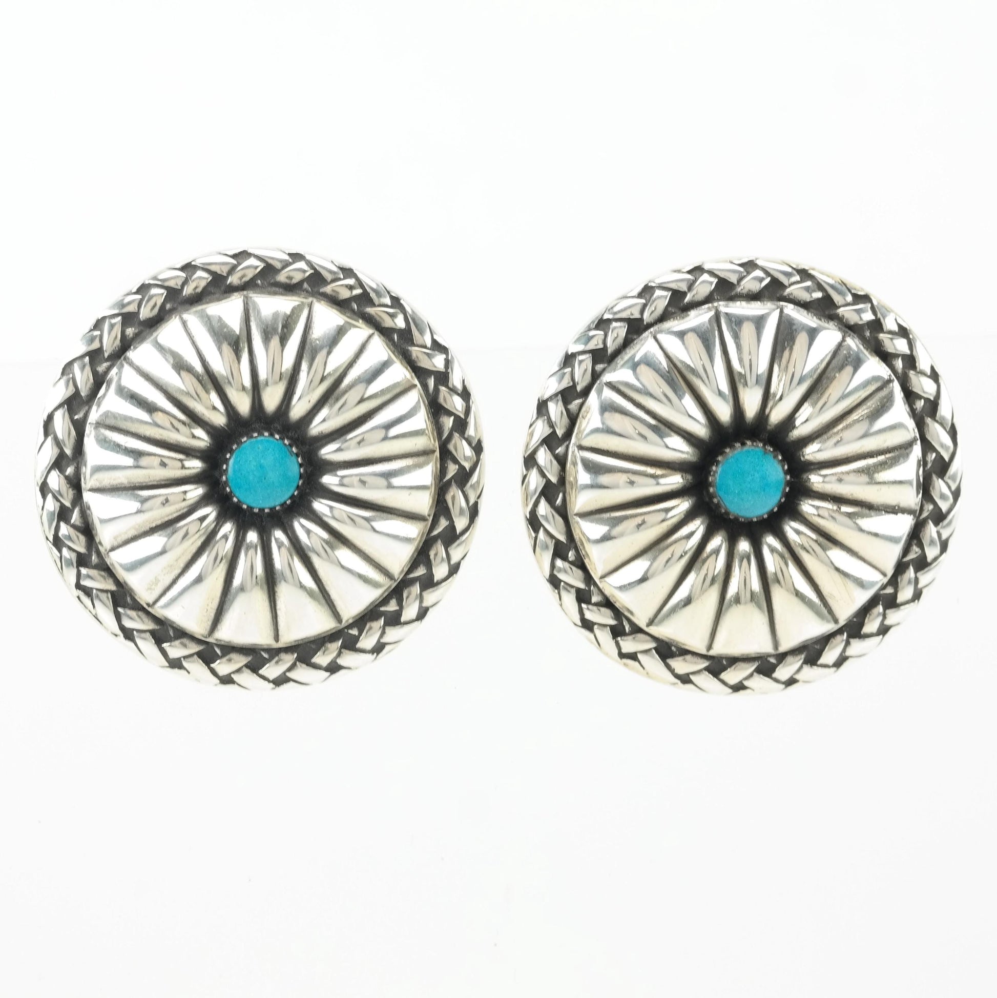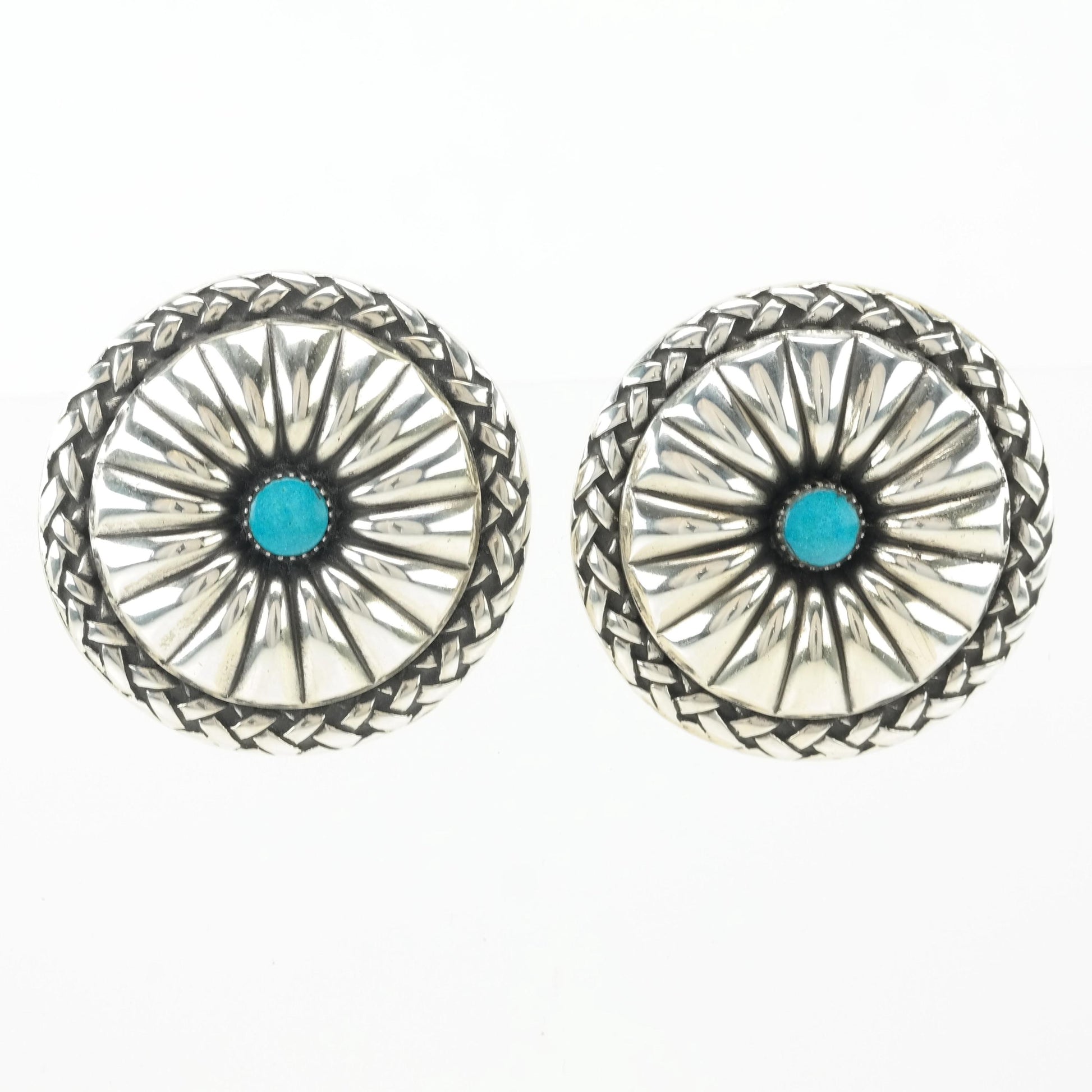 Southwest Block Turquoise Concho Earrings Sterling Silver Screw Back