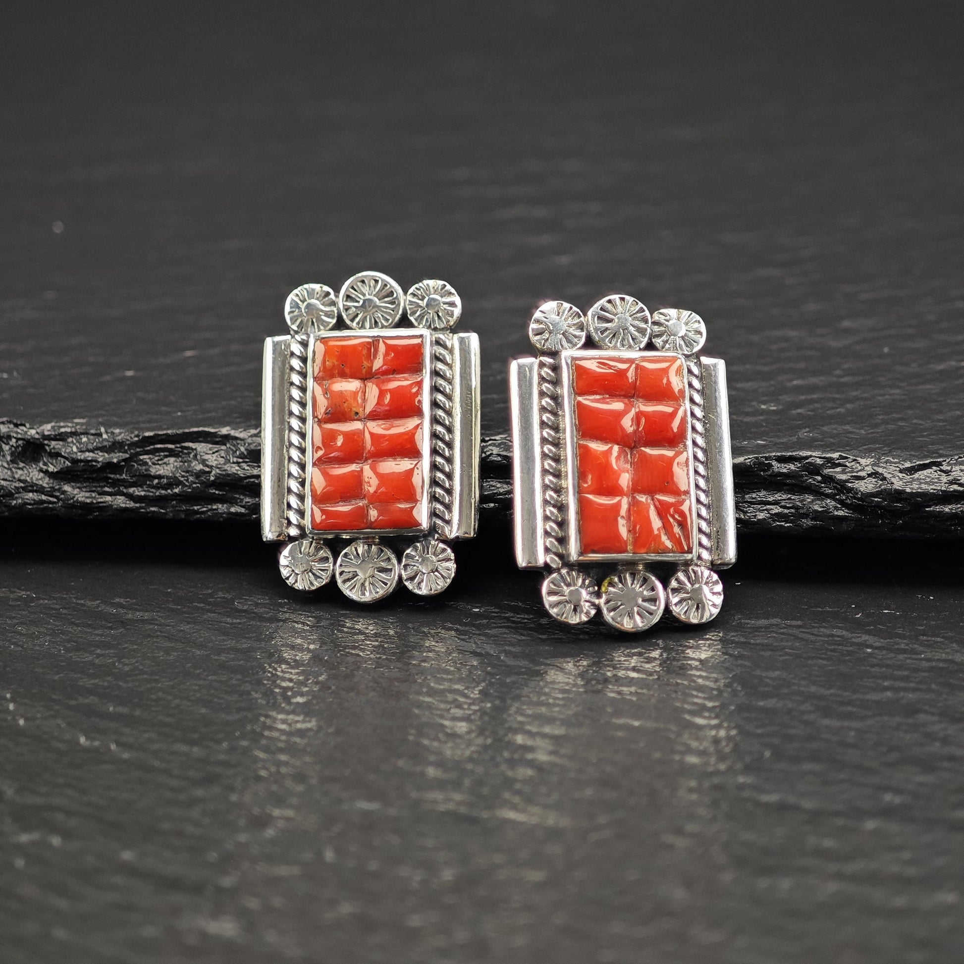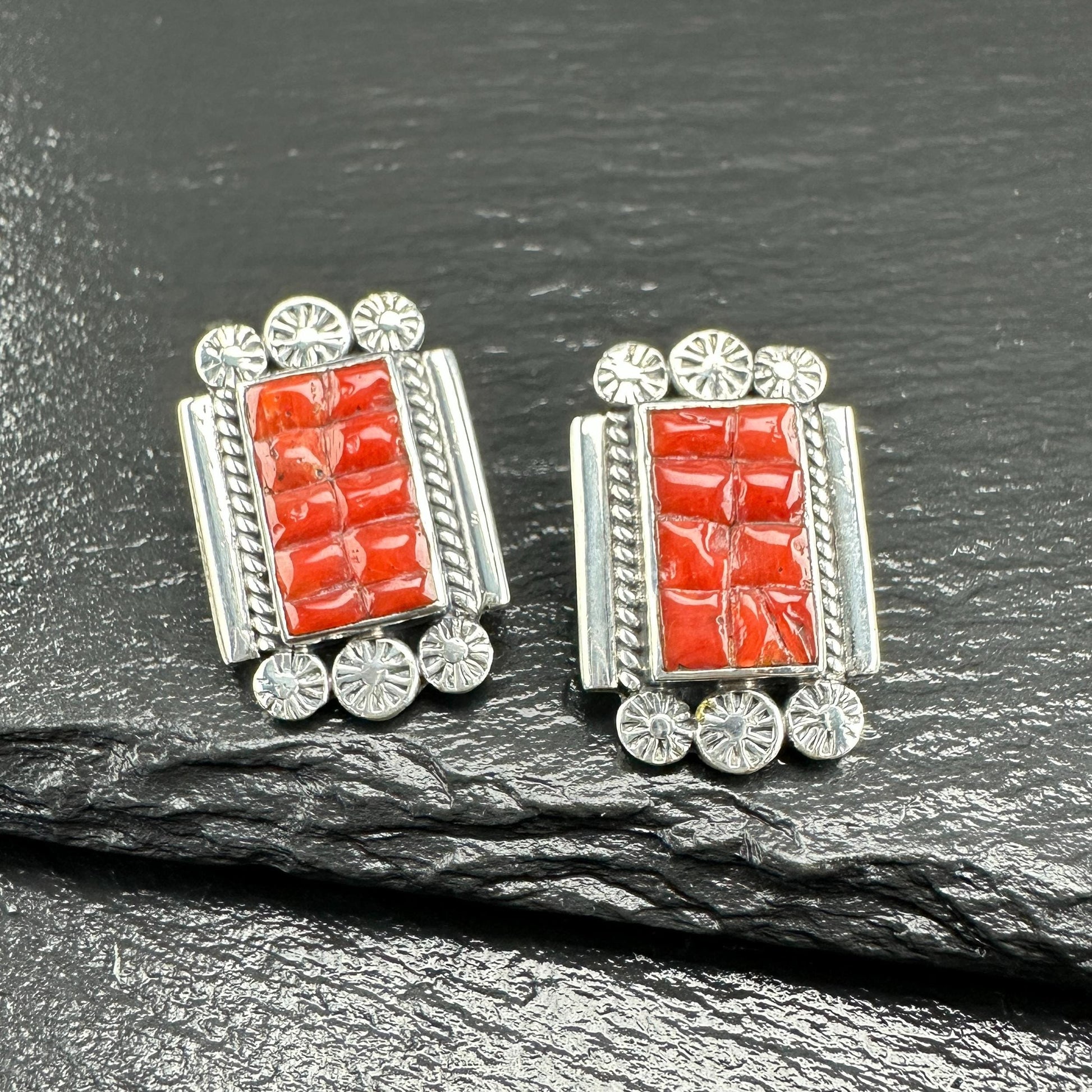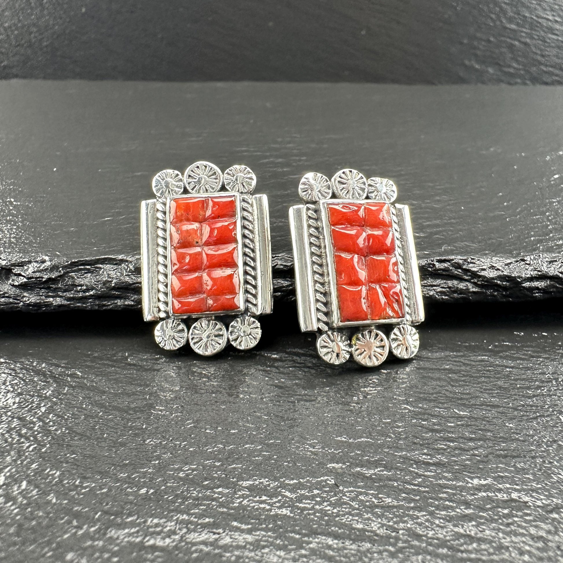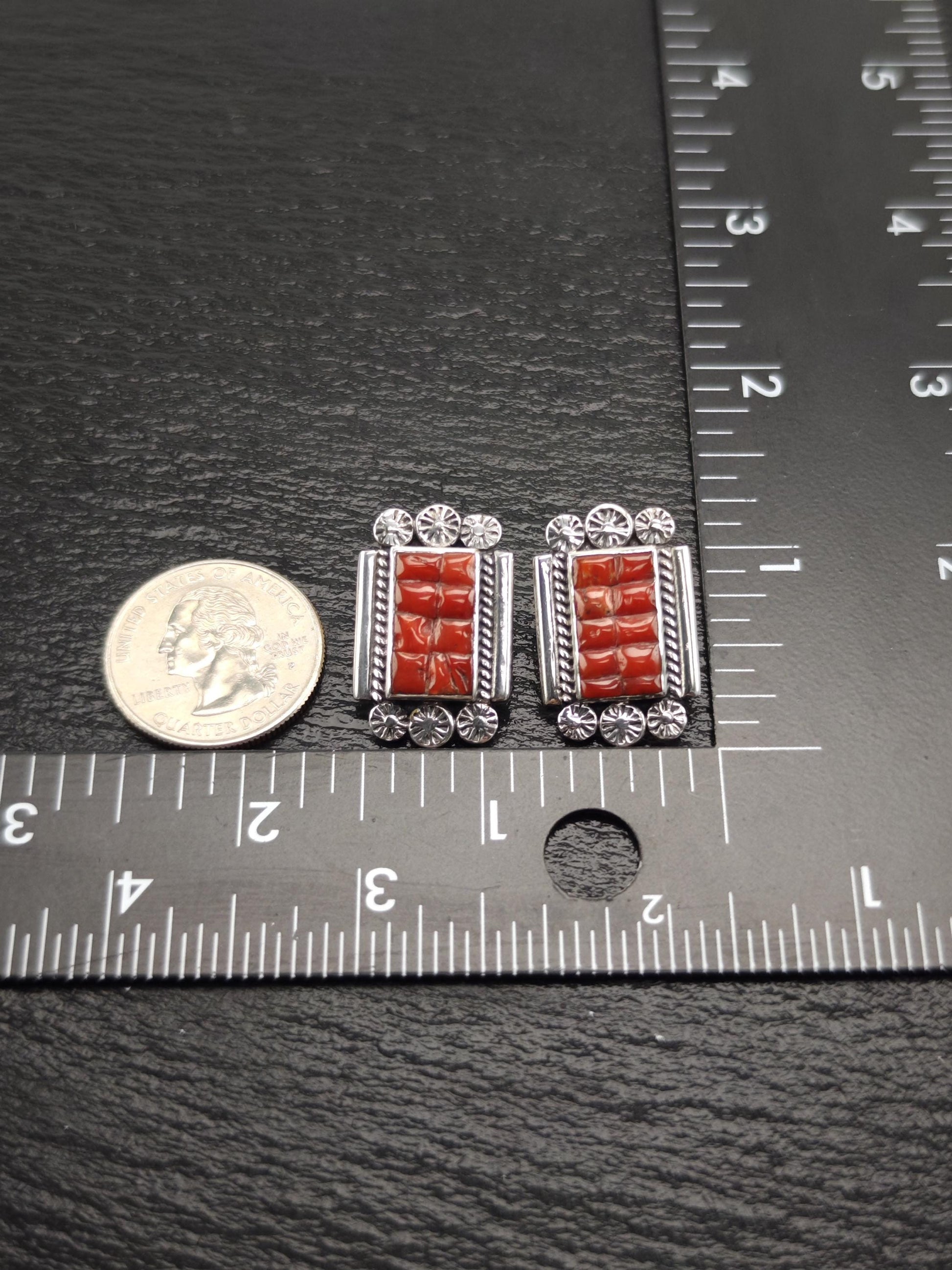 Southwest Red Coral Inlay Stud Earrings Sterling Silver