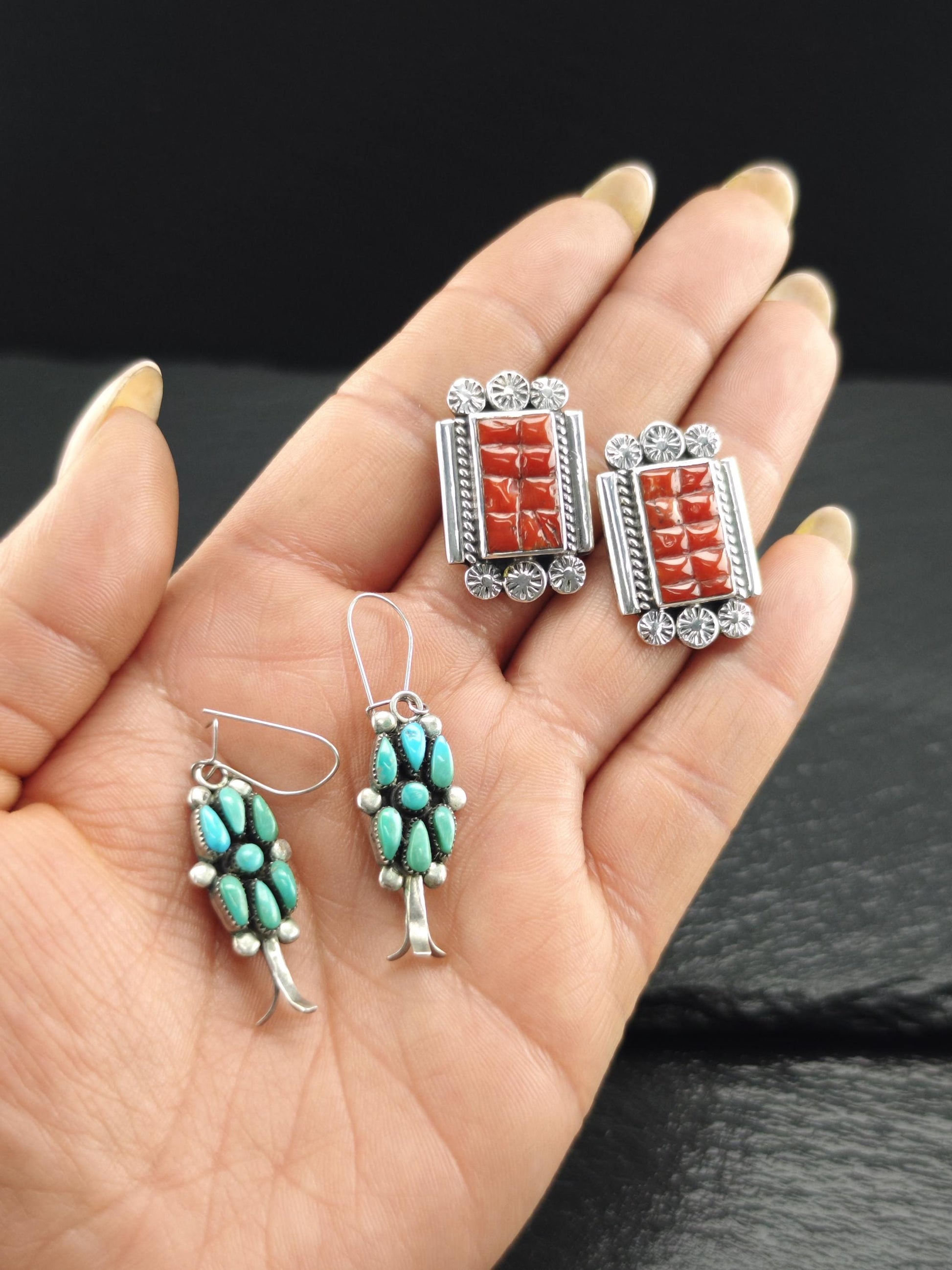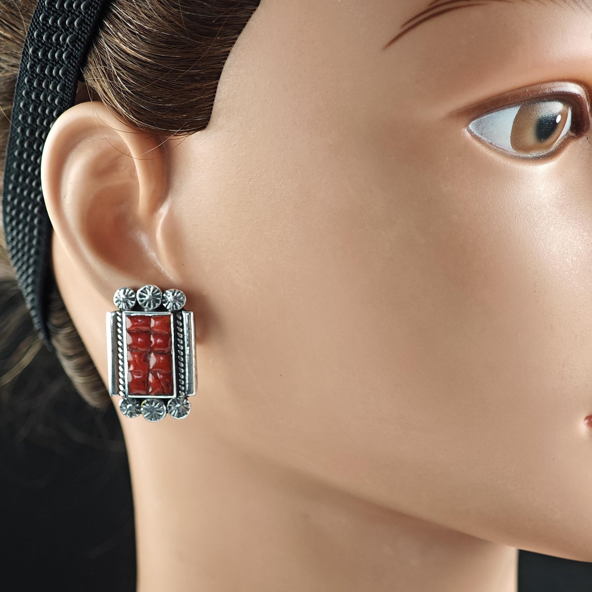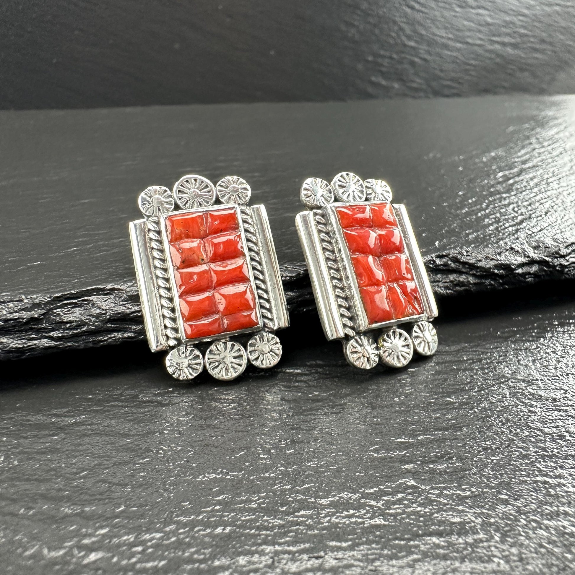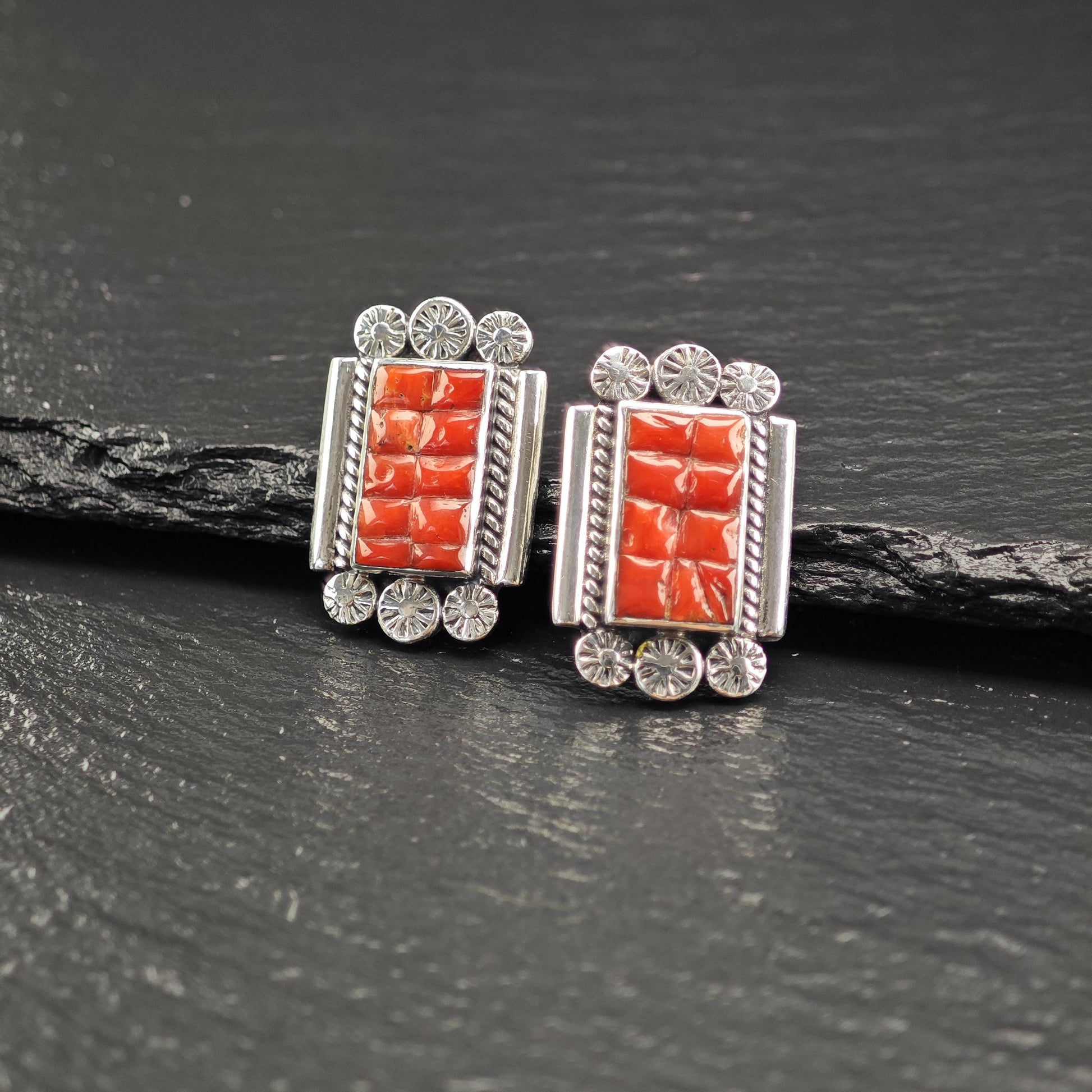 Southwest Red Coral Inlay Stud Earrings Sterling Silver