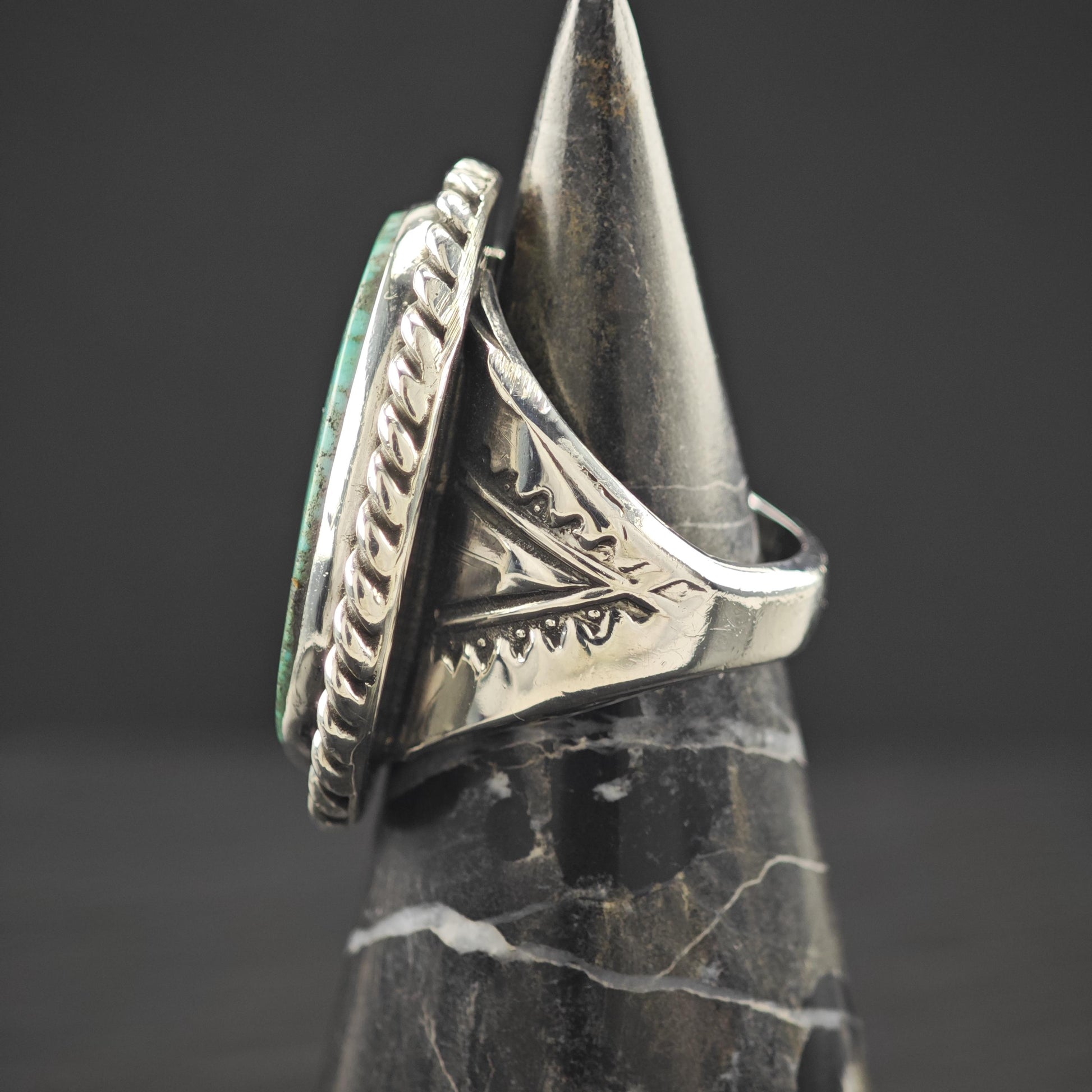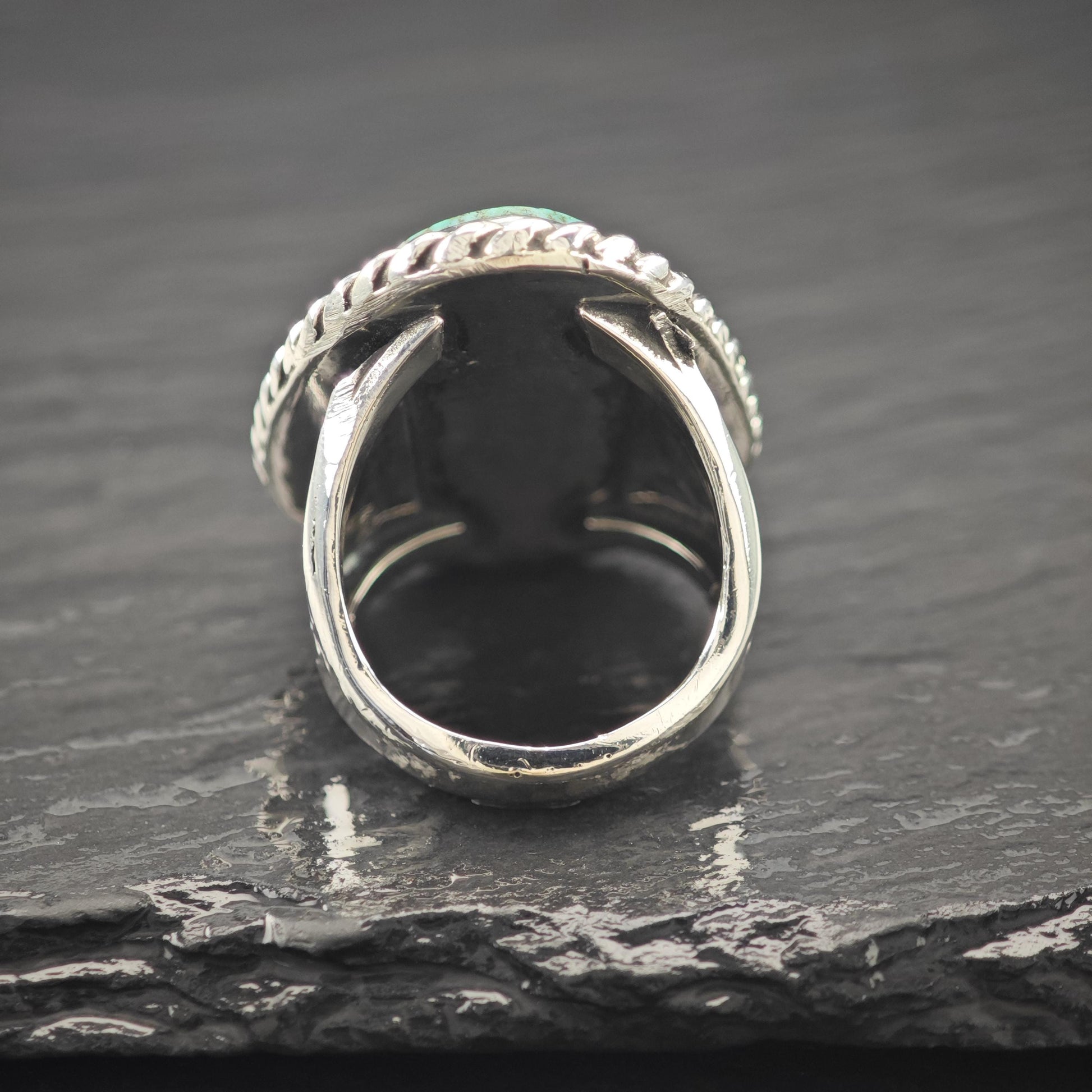 - Features a distinctive off-center spiderweb turquoise stone set in a secure bezel