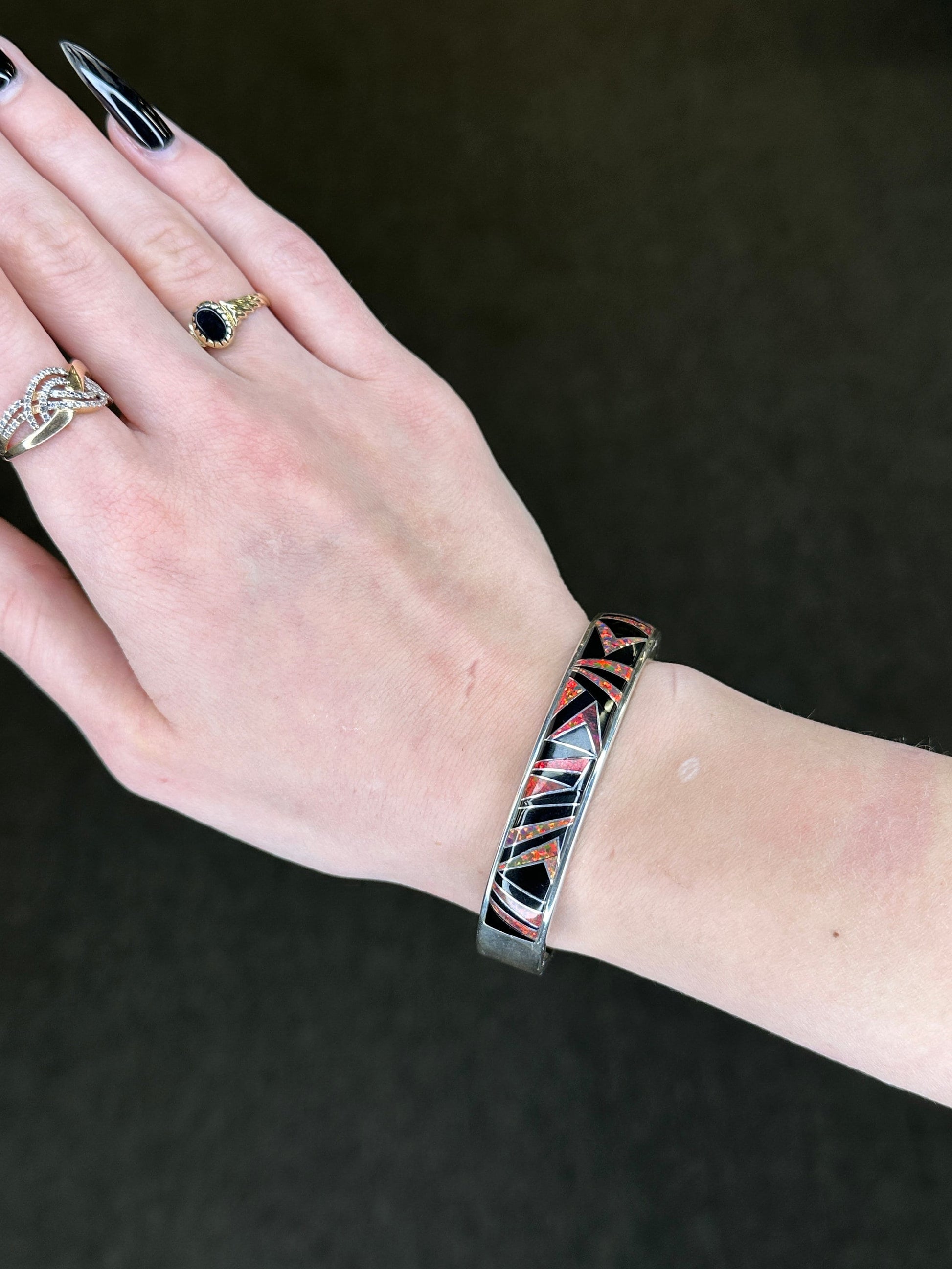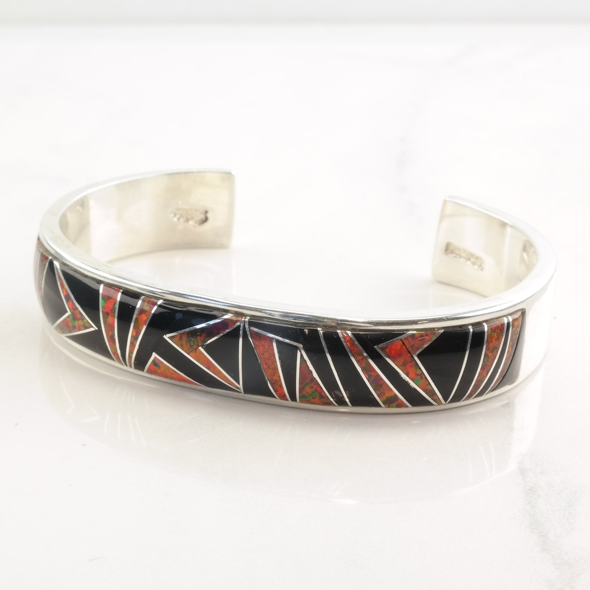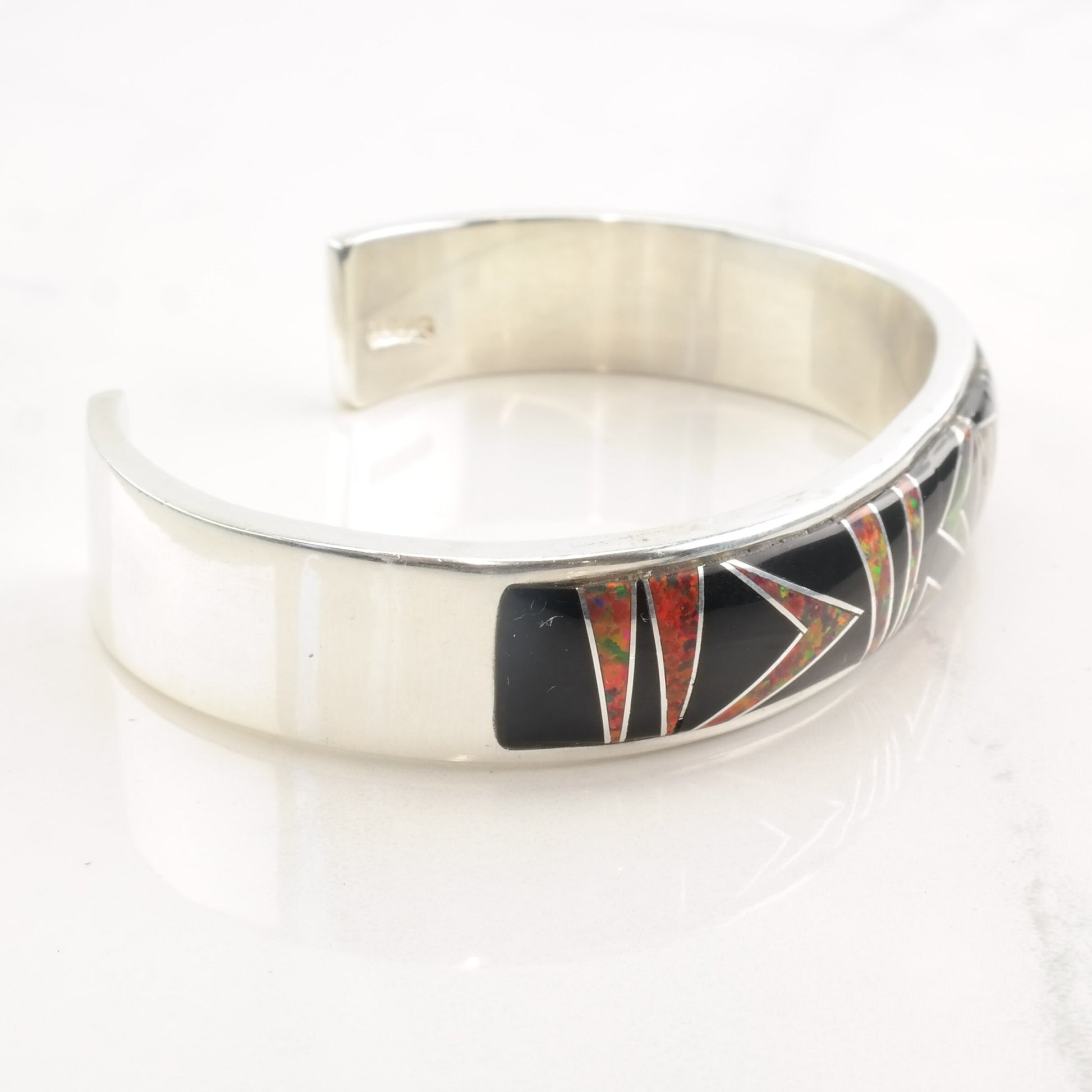Southwest Sterling Silver Cuff Bracelet Fire Lab Opal Onyx Inlay