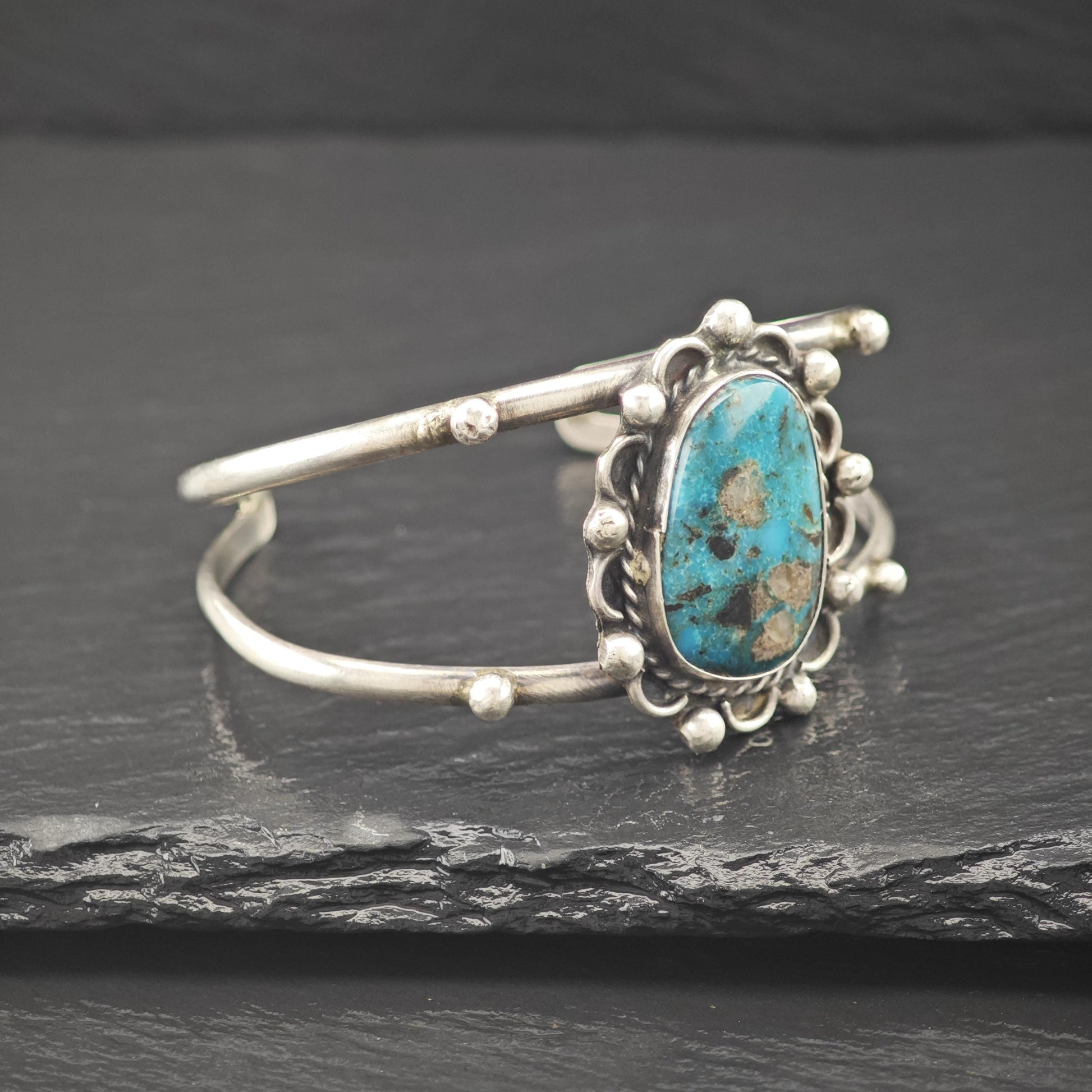 Discover the beauty of this exquisite Southwest Sterling Silver Turquoise Cuff Bracelet, a stunning piece that showcases the artistry of Southwestern jewelry. This bracelet is unmarked but features intricate stamping that highlights its unique design. It comfortably fits a wrist size of 6 1/2 inches and has a tip to tip length of 5 3/8 inches, with a width of 1 3/8 inches. Weighing in at 21.7 grams, this cuff is both lightweight and durable.