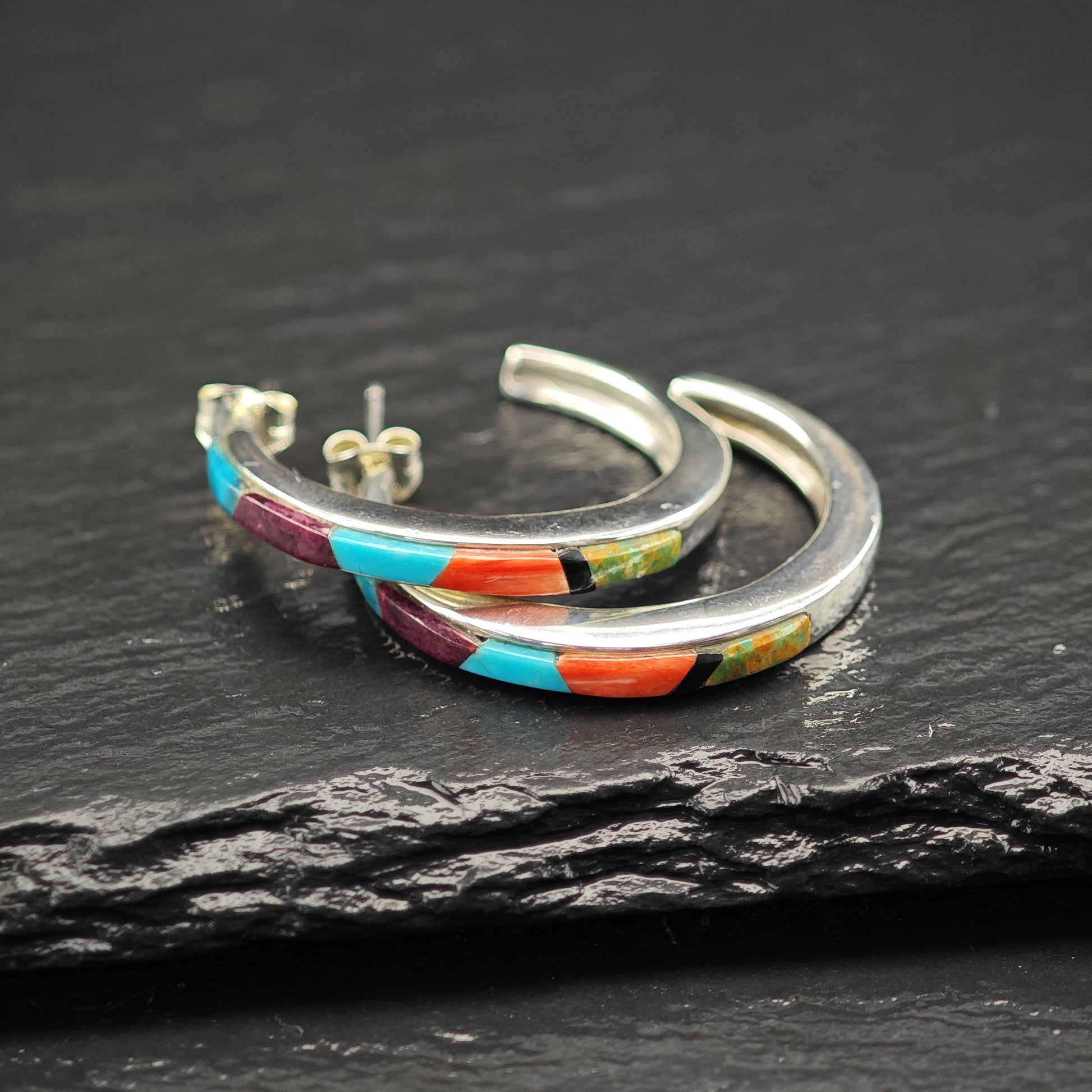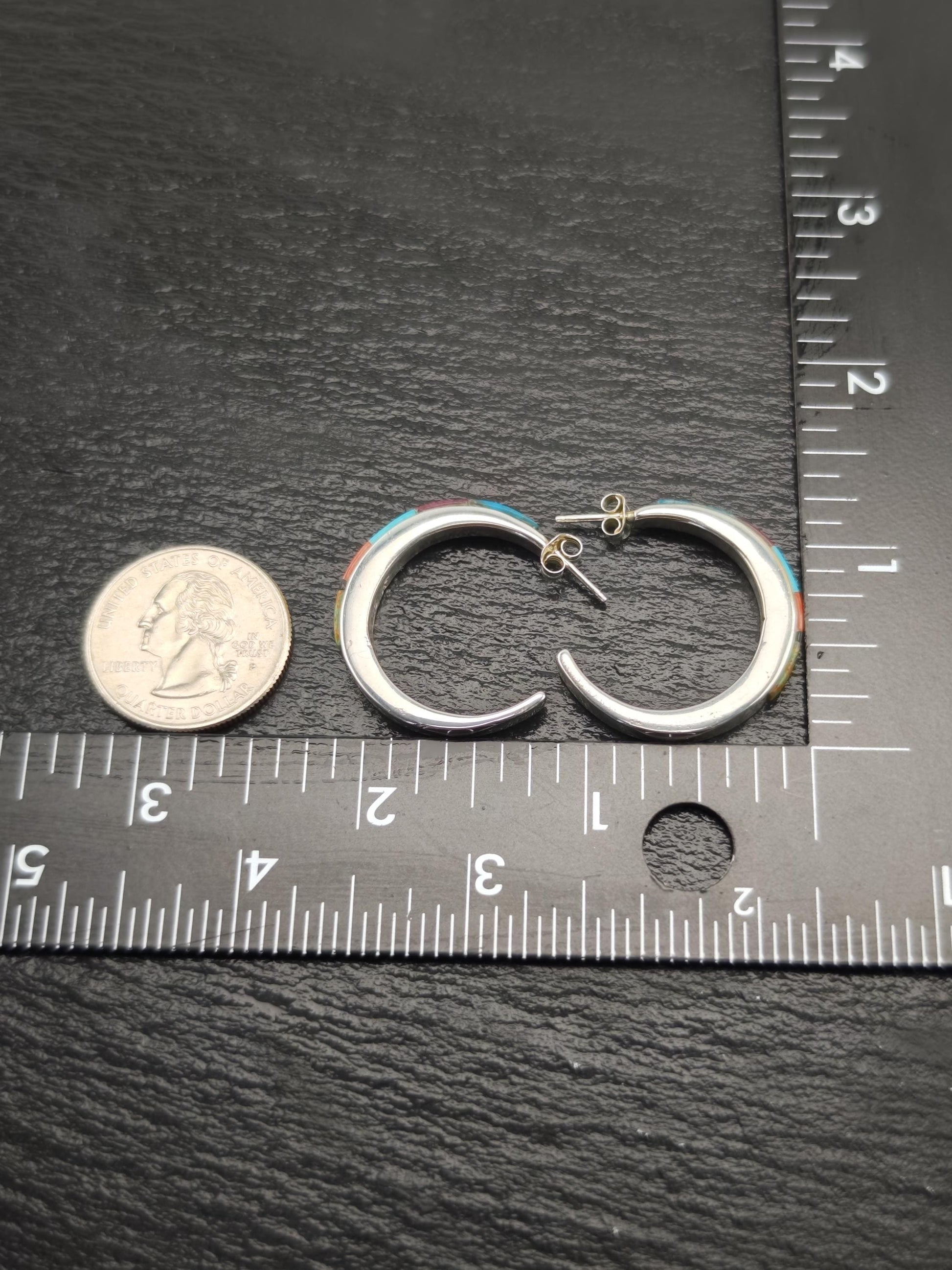 Southwest Turquoise, Coral Inlay Stud/Hoop Earrings Sterling Silver