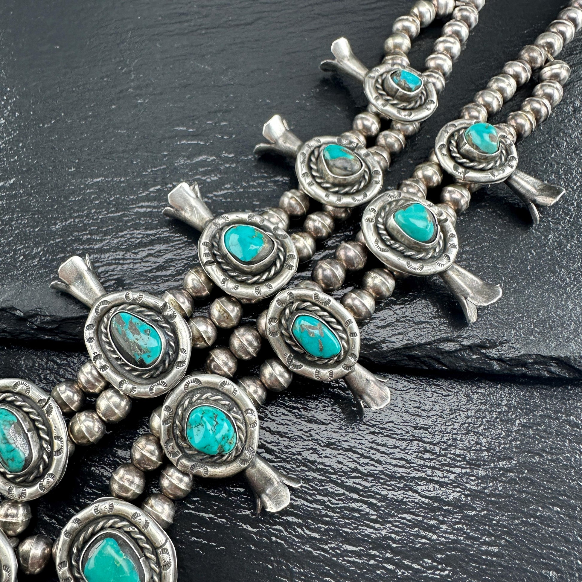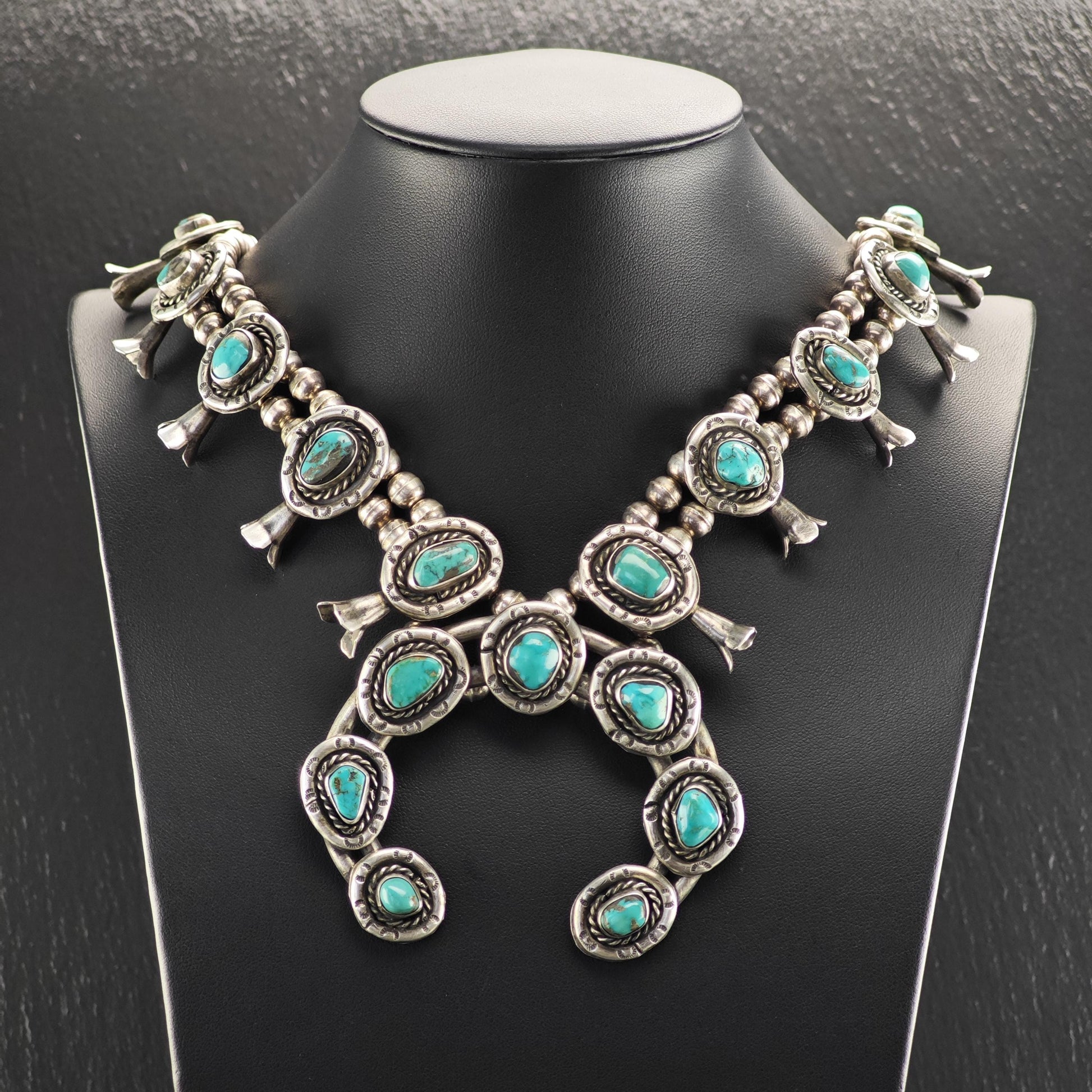 Discover a stunning piece of vintage craftsmanship with this exquisite Native American Squash Blossom Necklace, featuring beautiful blue turquoise and intricate stamped designs. Weighing 175.8 grams, this necklace showcases natural turquoise that has been expertly crafted to highlight its striking blue hues.