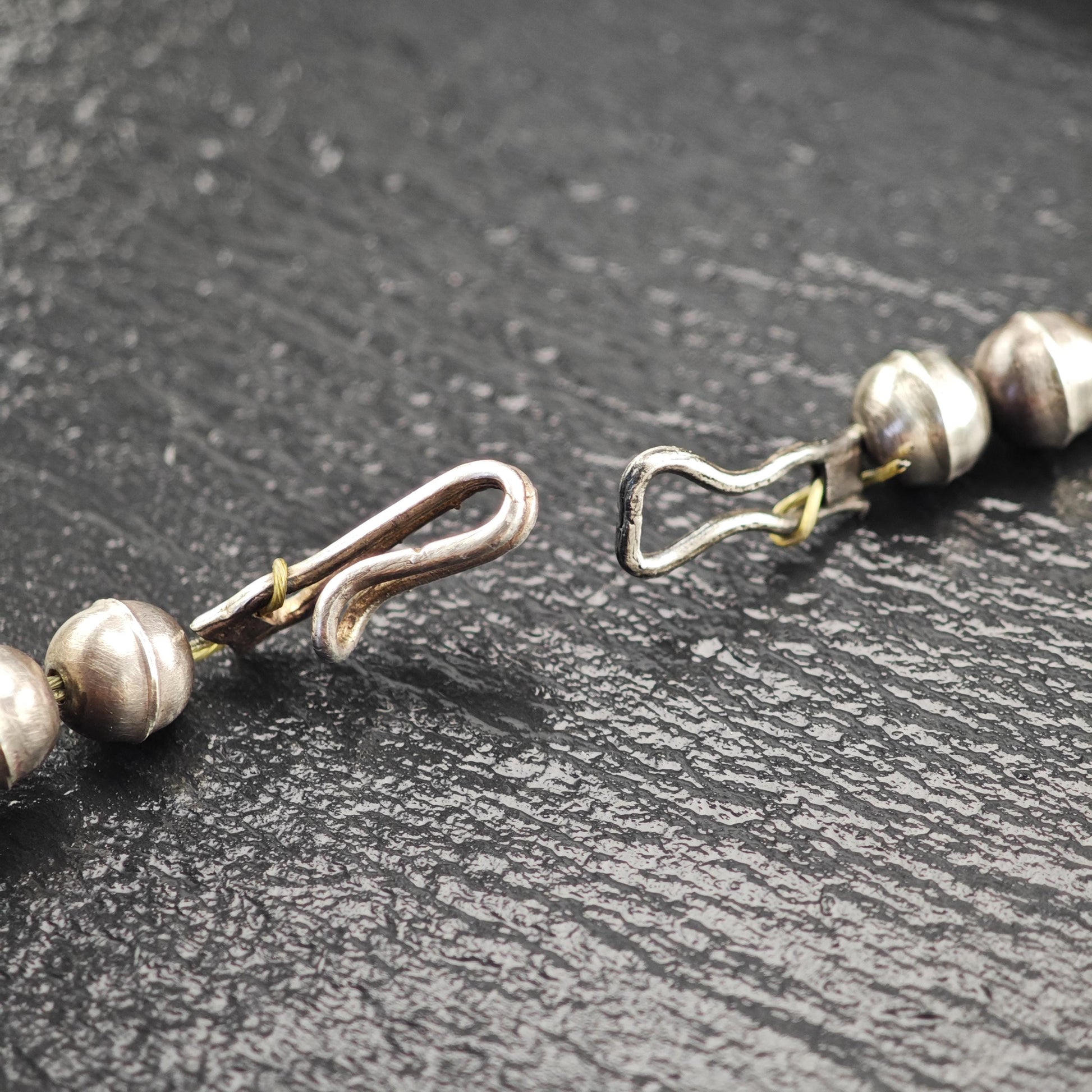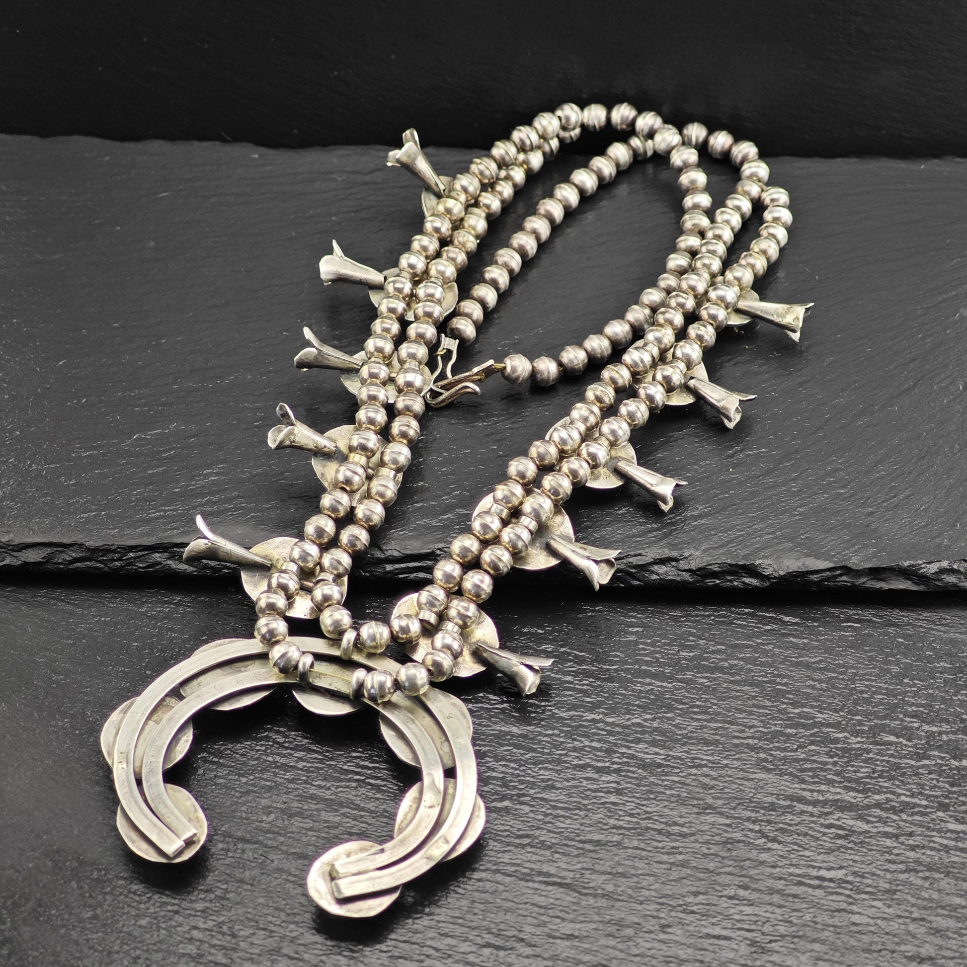Dating back to circa 1970, this necklace embodies the rich heritage of Native American jewelry making. Please note that variations in color in the images are due to reflections; the necklace is even more beautiful in person, showcasing the lovely silver tones.