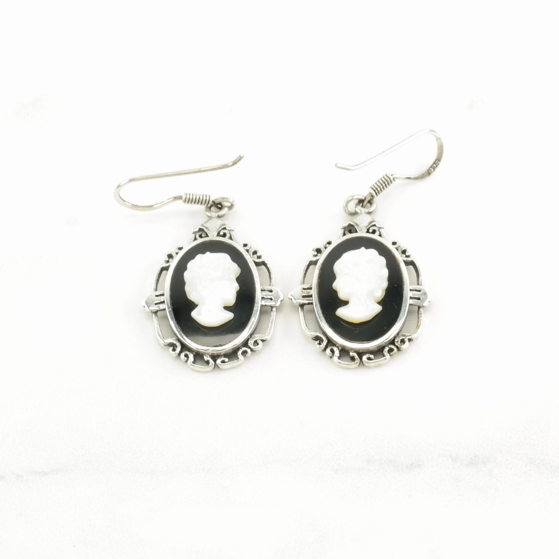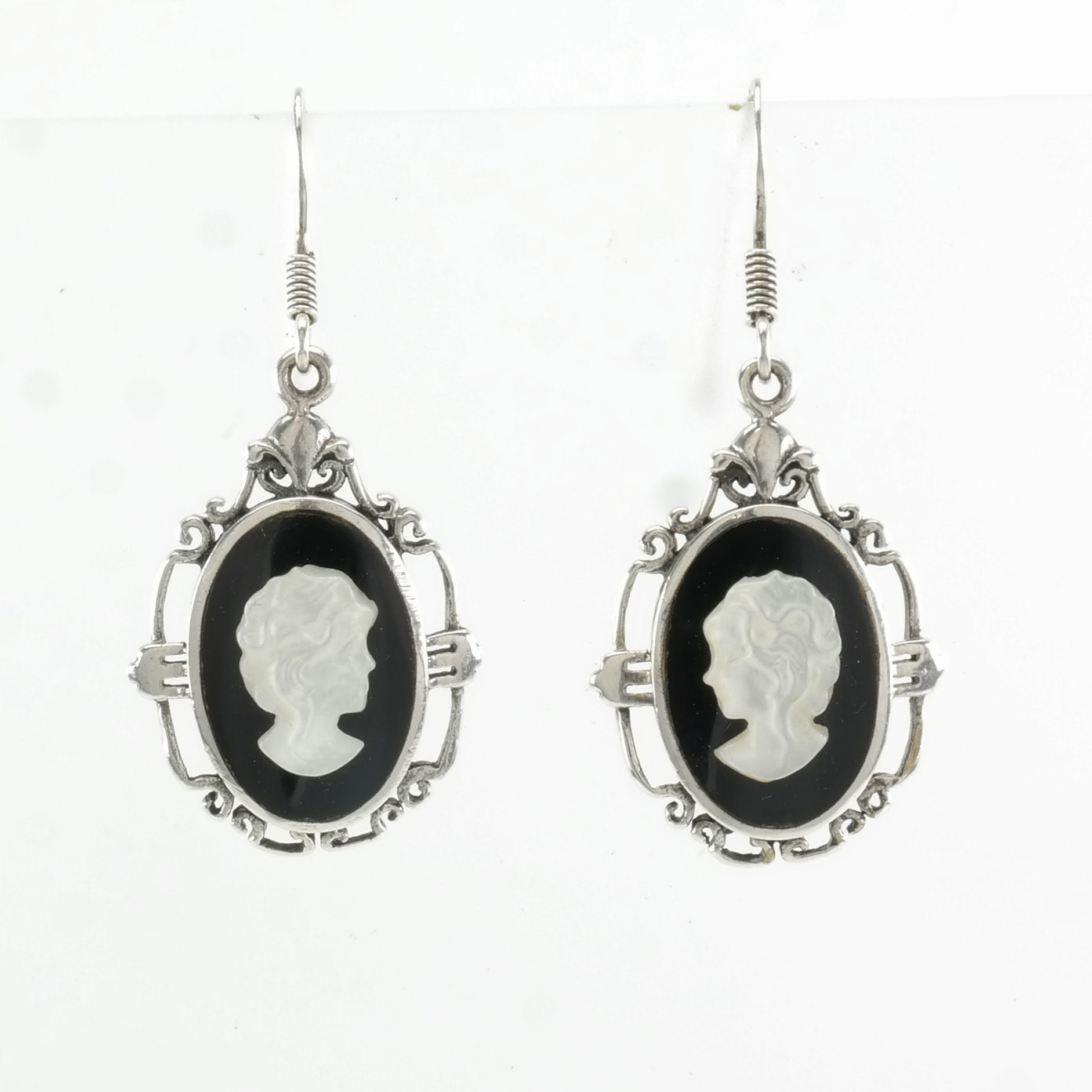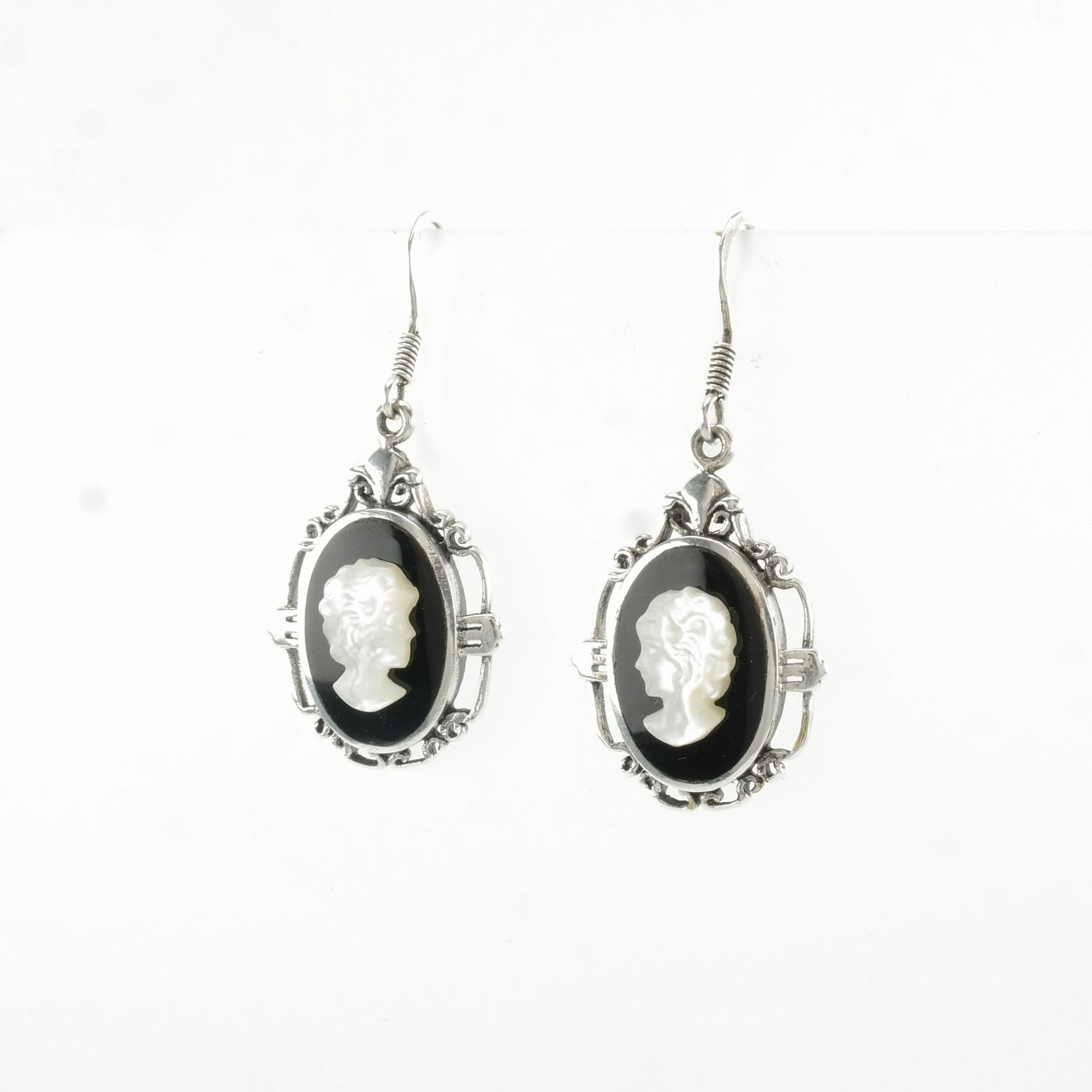 Sterling Silver Black, White MOP, Onyx Portrait Earrings Fish hook