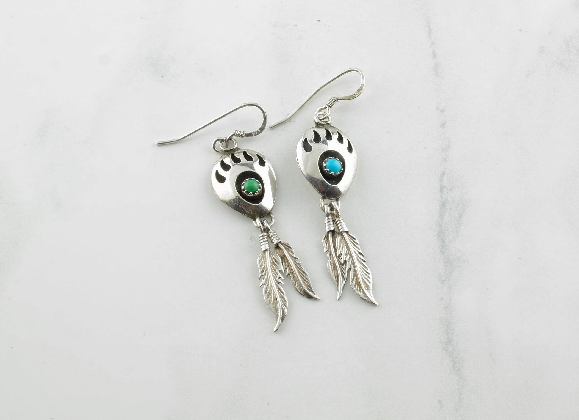 These vintage sterling silver earrings feature a tear-drop shape with a bear paw and feather design and Turquoise center.