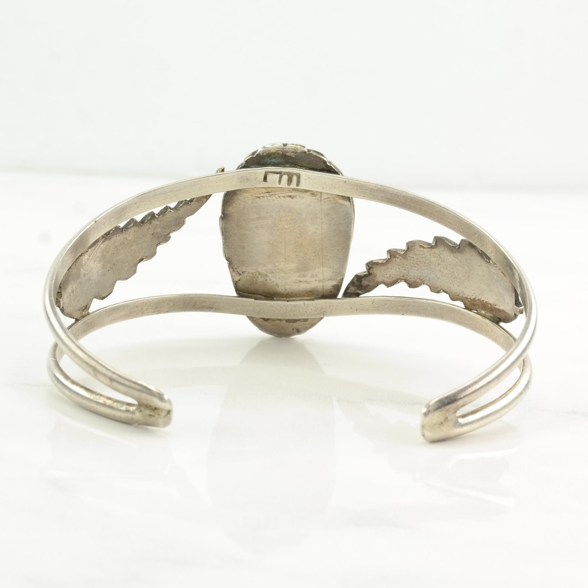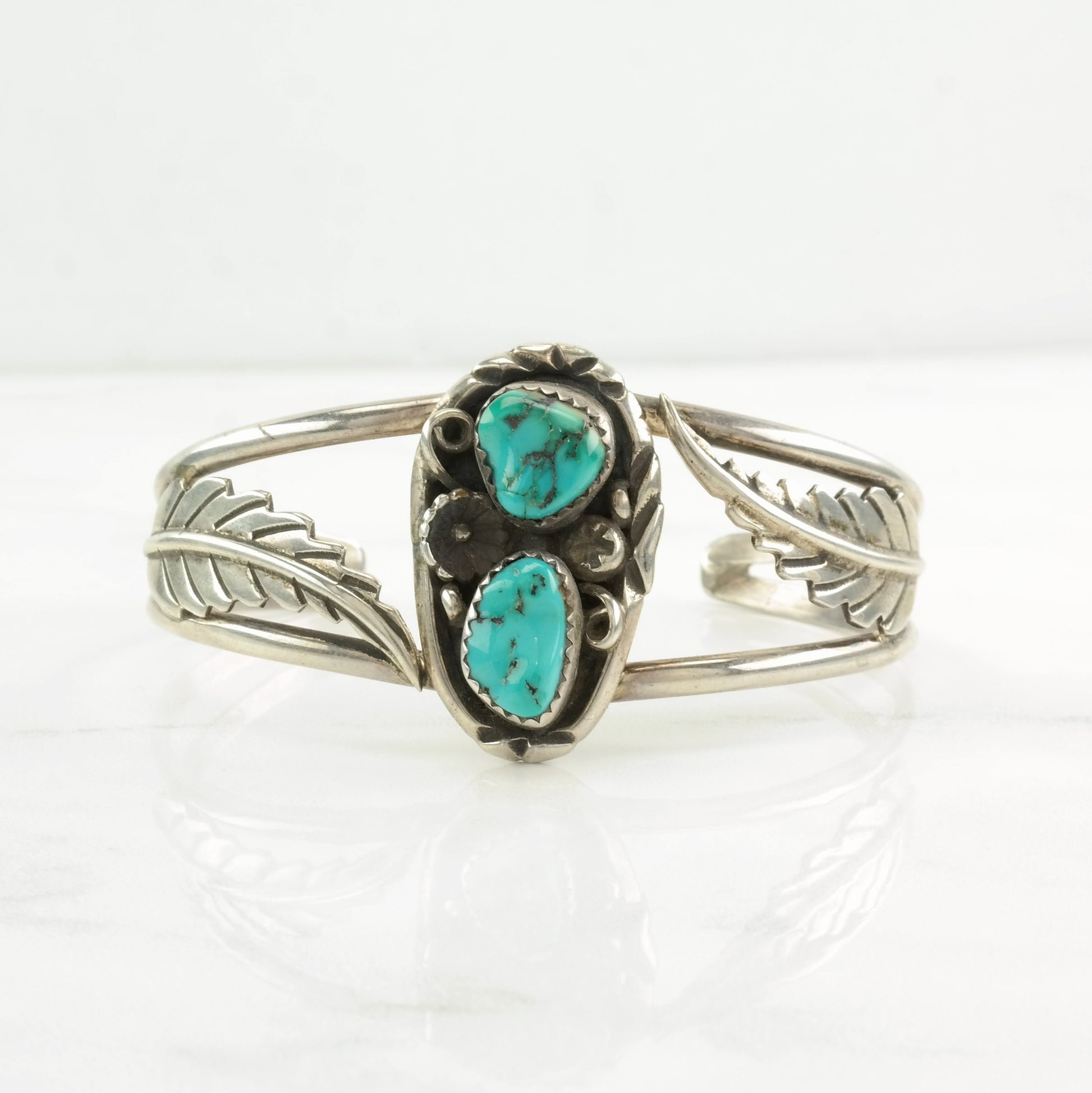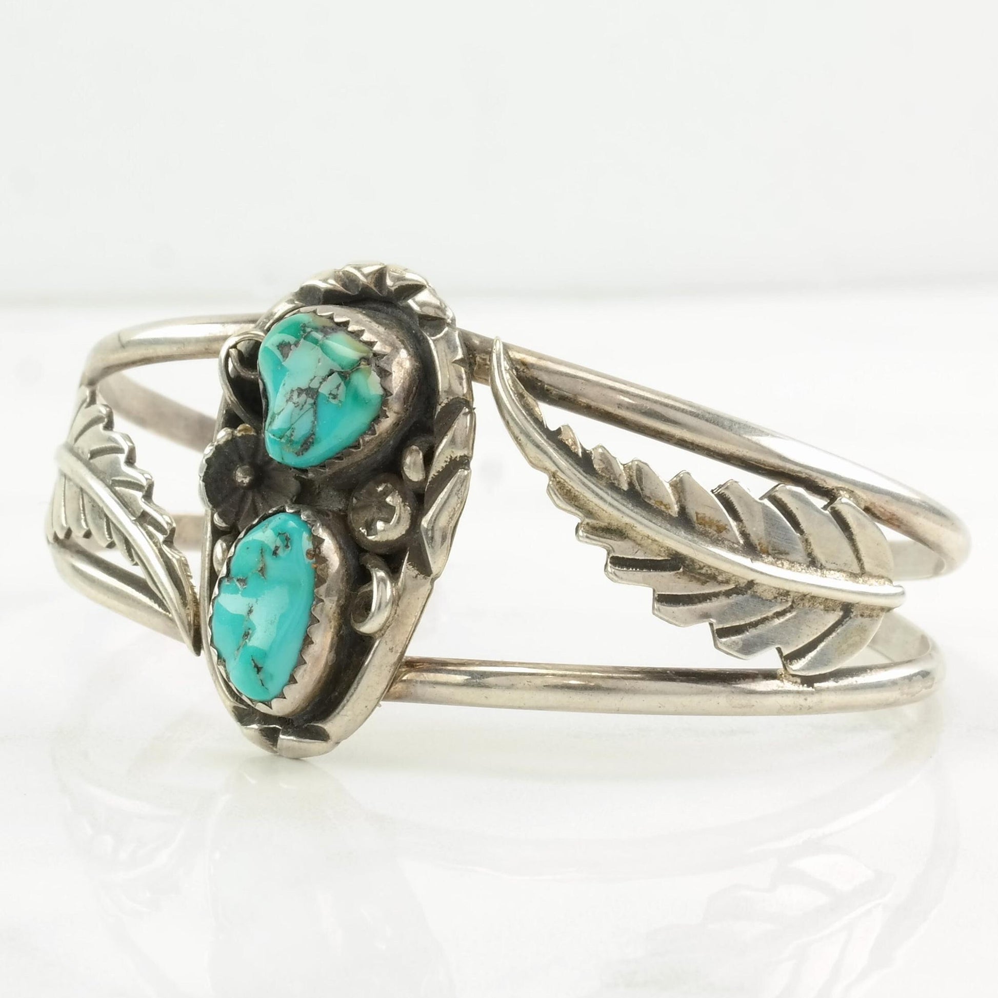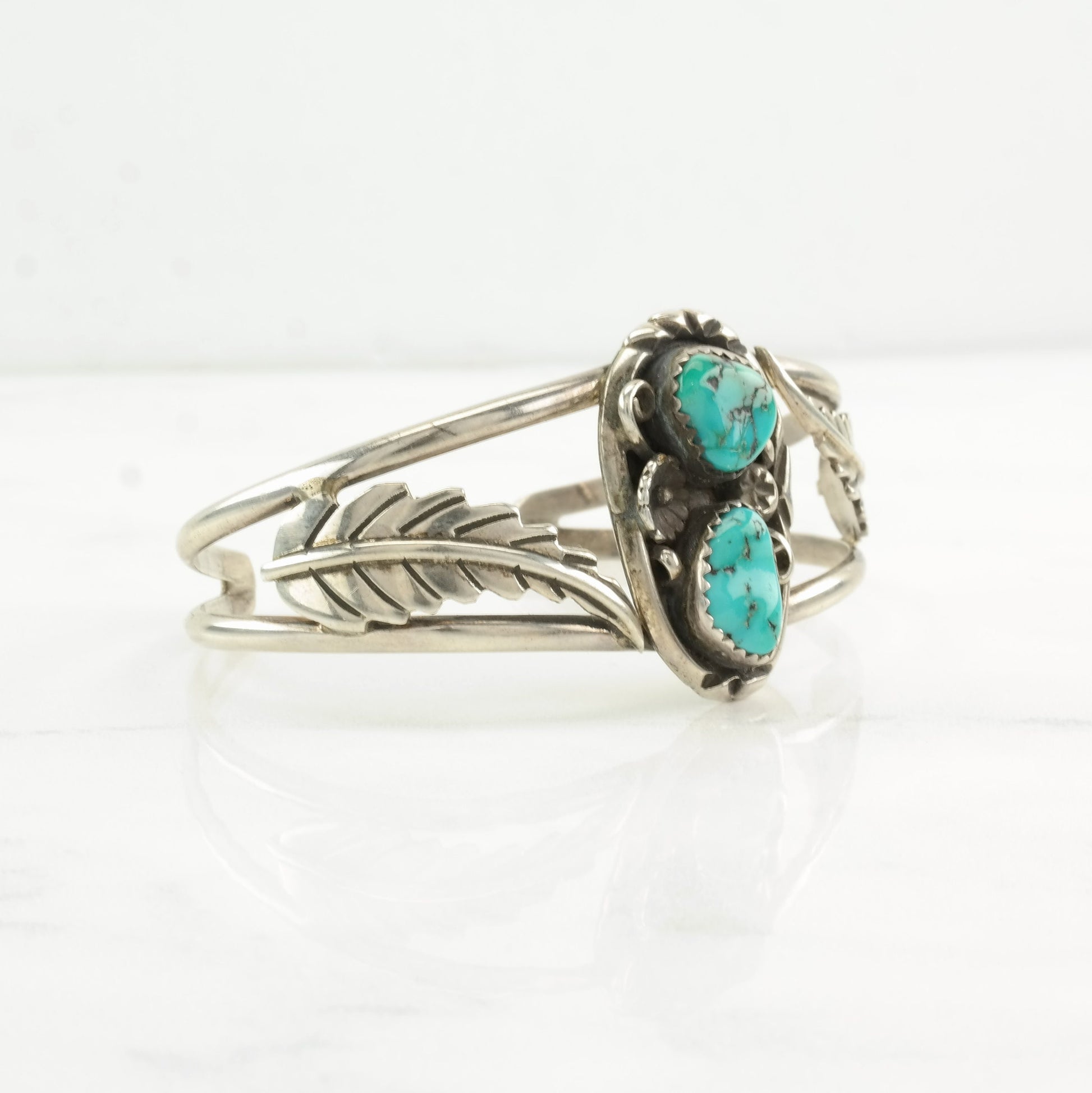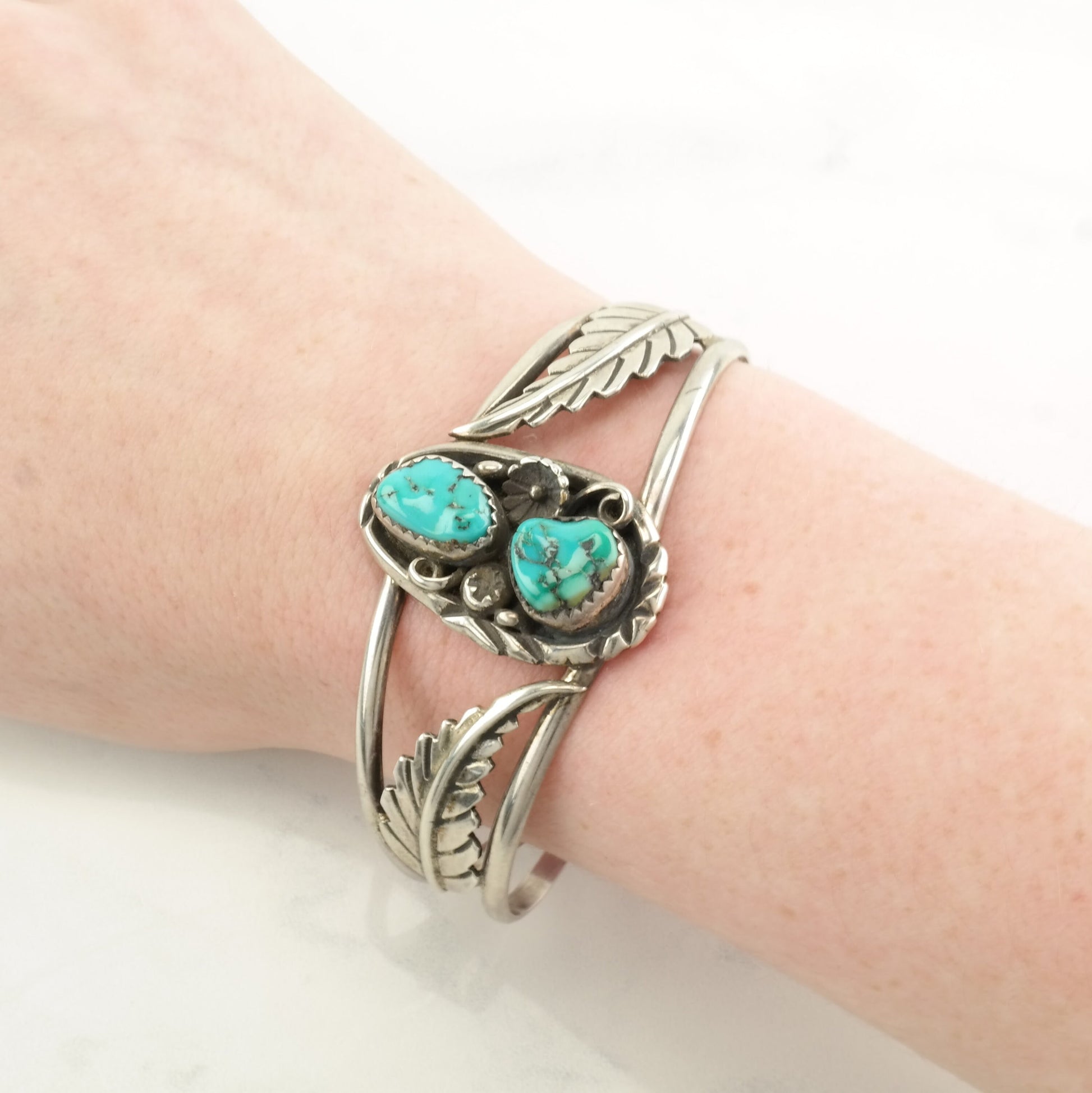 Sterling Silver Cuff Bracelet Blue Turquoise Feather, Two Stone