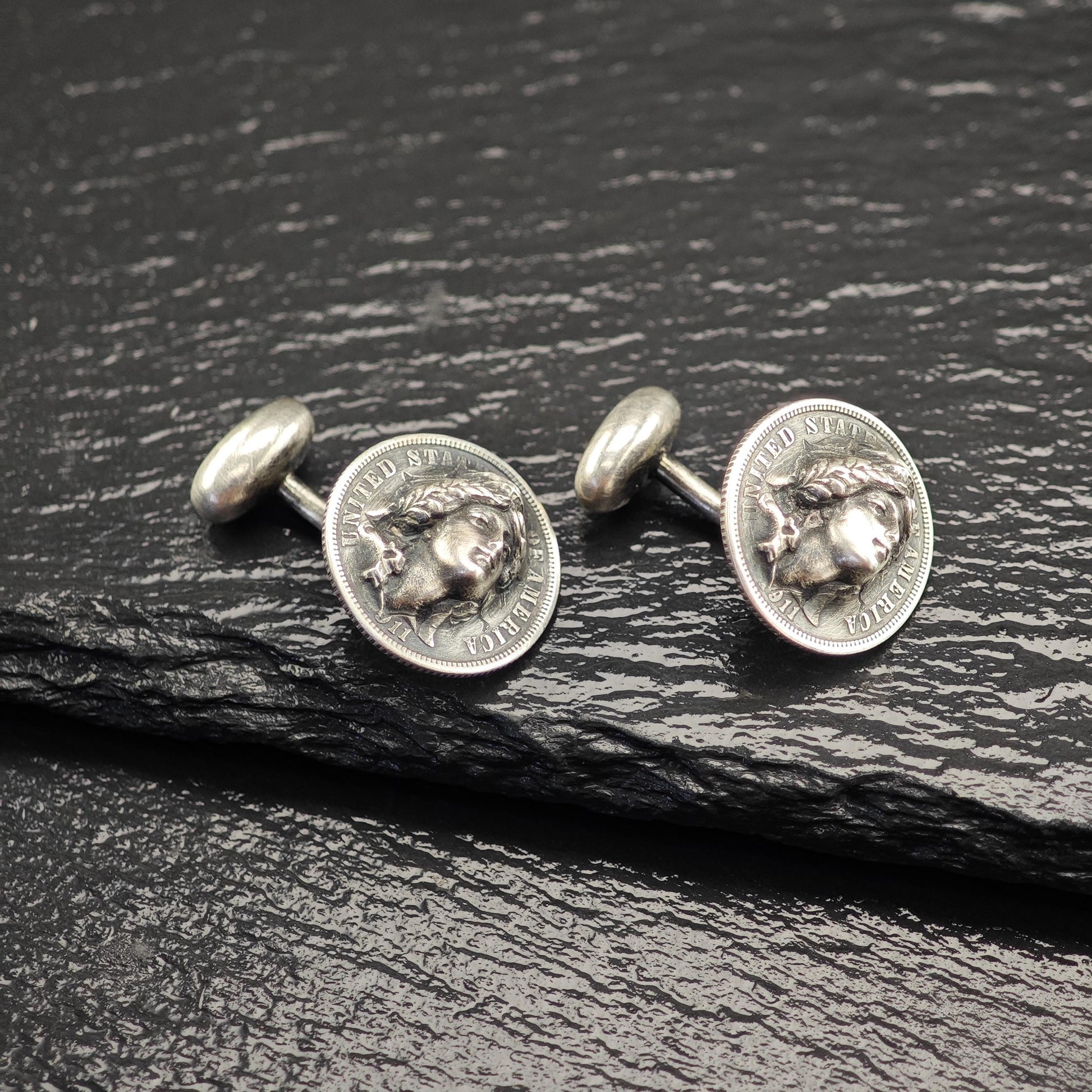 Discover this exquisite pair of antique cufflinks featuring an abstract design and a genuine dime coin, crafted from sterling silver. Weighing 8.3 grams, these cufflinks date back to circa 1910, showcasing a timeless elegance that complements both formal and casual attire.