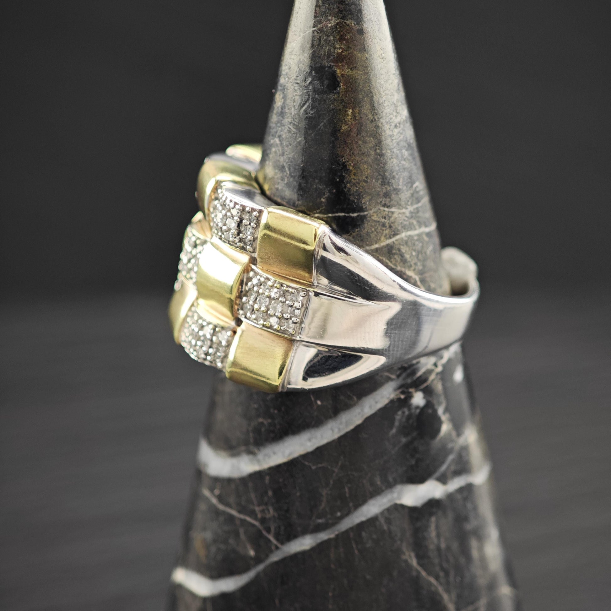 The ring is a size 8 1/4 but can be resized to fit your needs. Weighing in at 6.2 grams, it features earth-mined stones totaling approximately 0.44 carats. Its condition is lovely, having been pre-owned and meticulously cleaned and polished to appear like new, with only age-appropriate wear, if any.