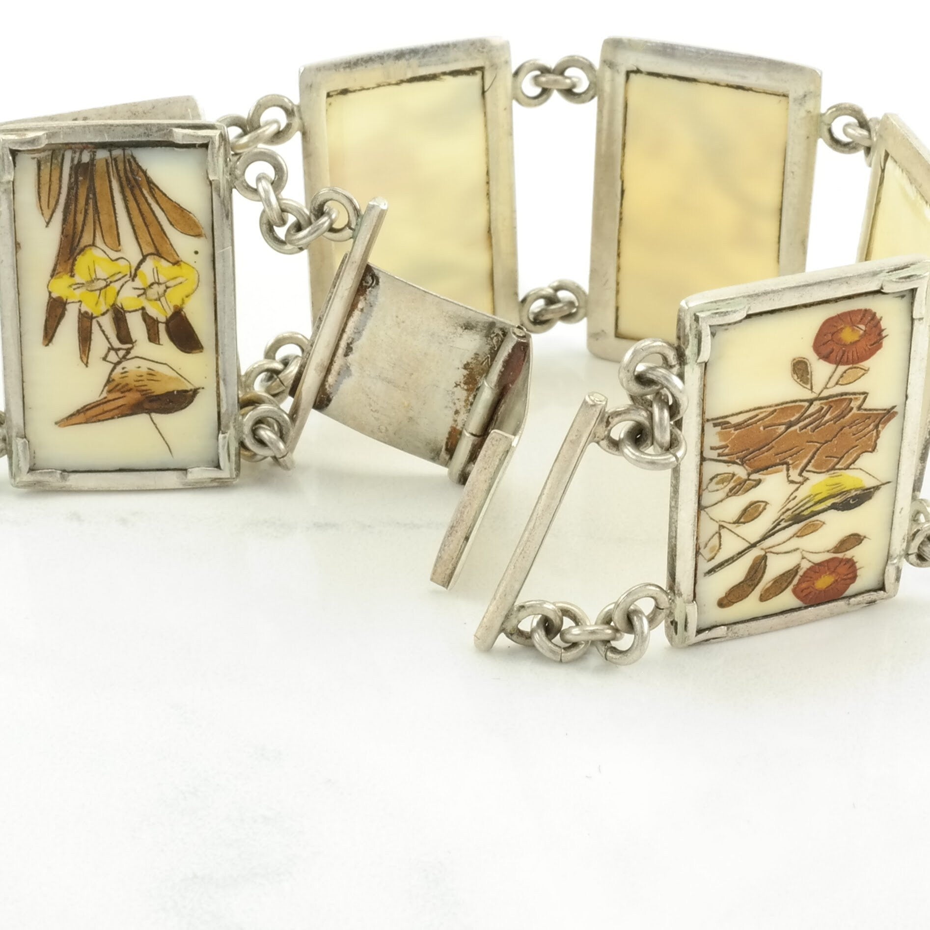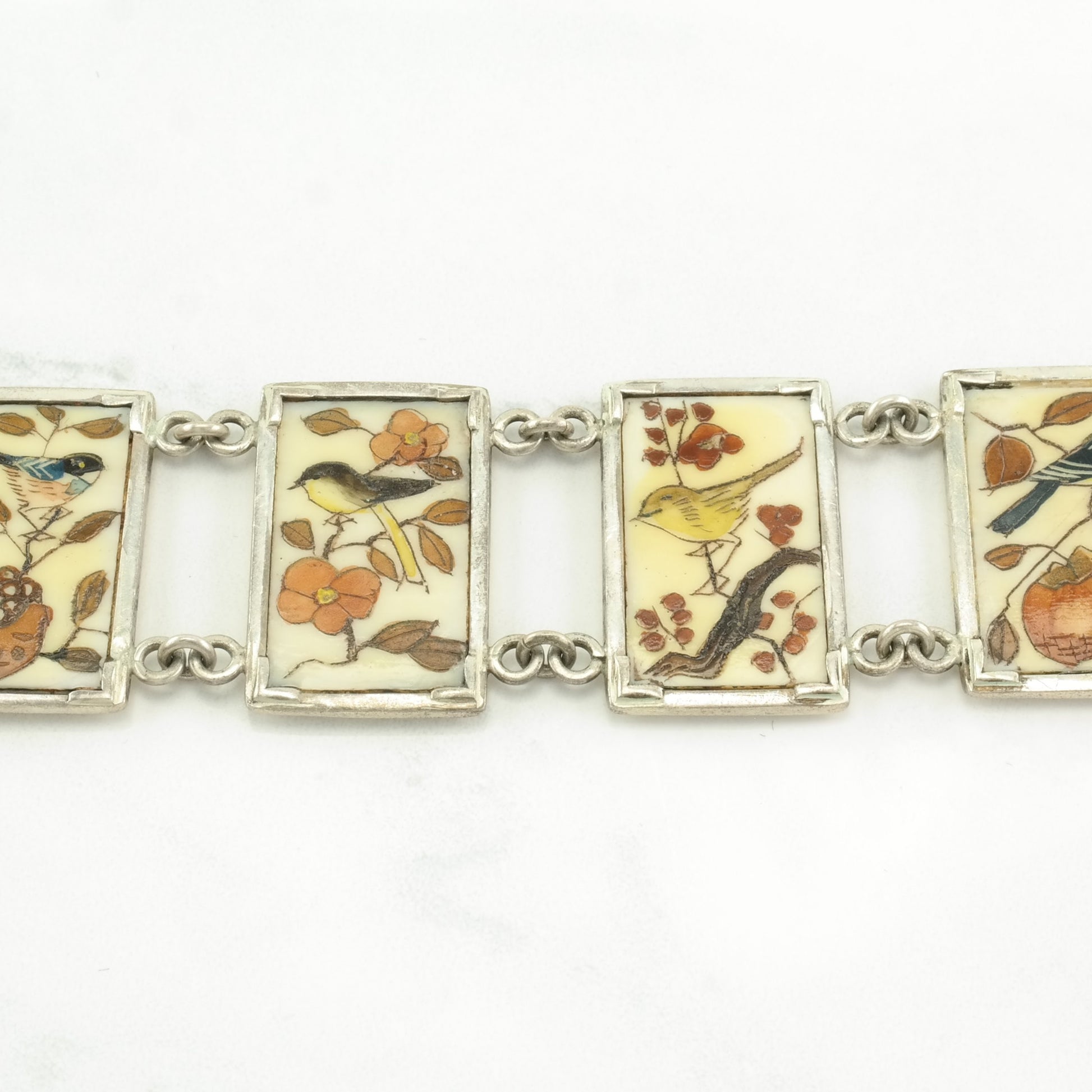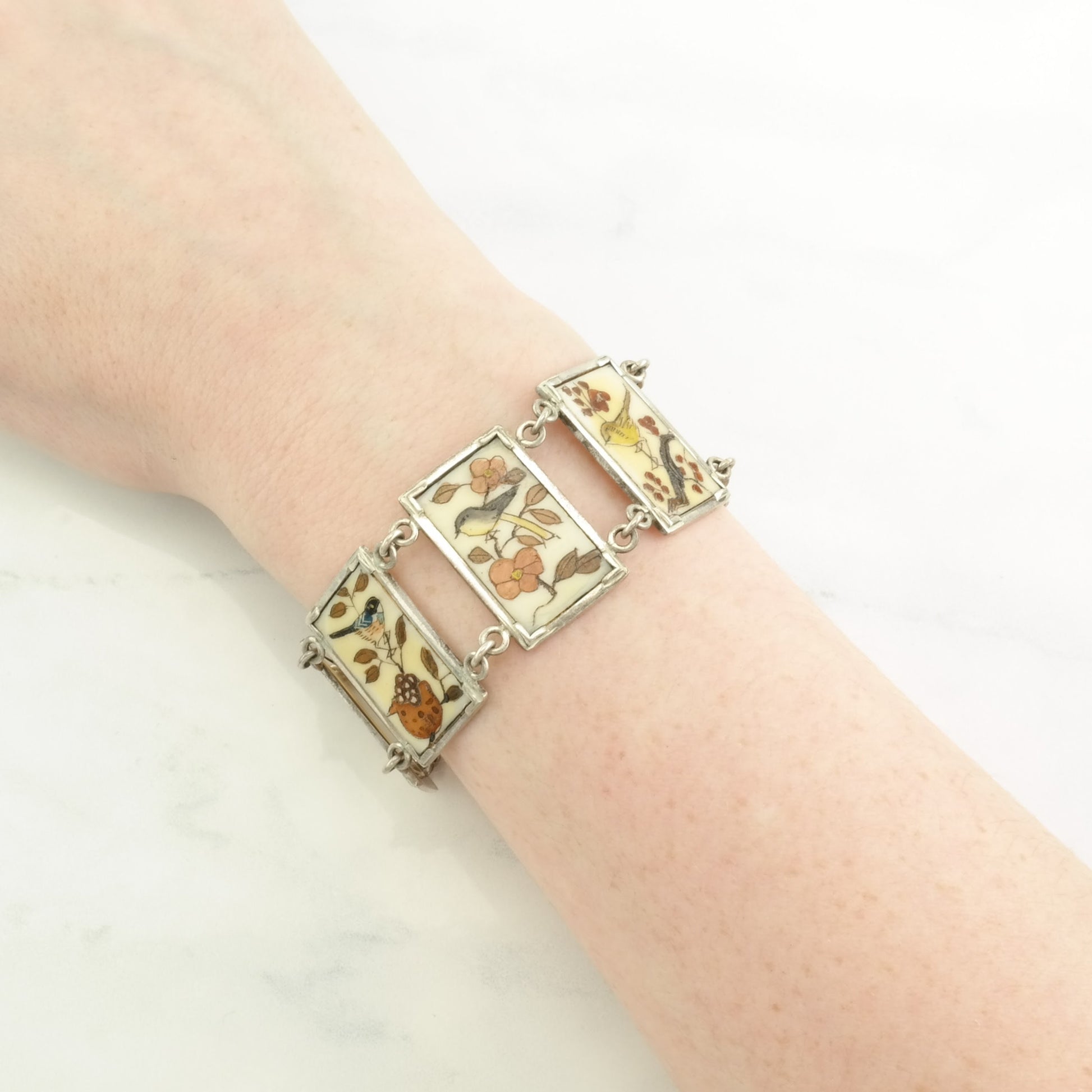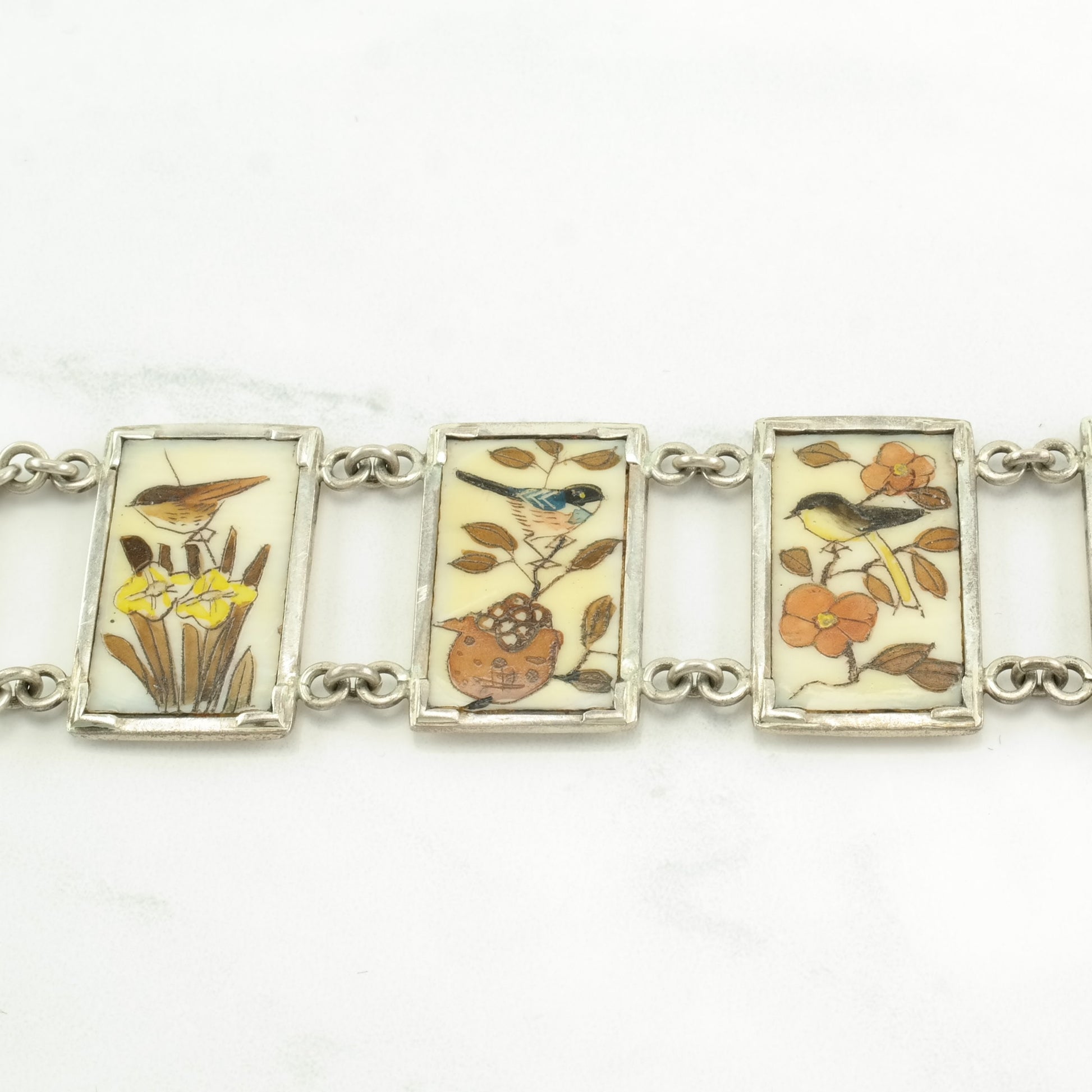 Sterling Silver Link Bracelet Hand Painted Birds, Resin