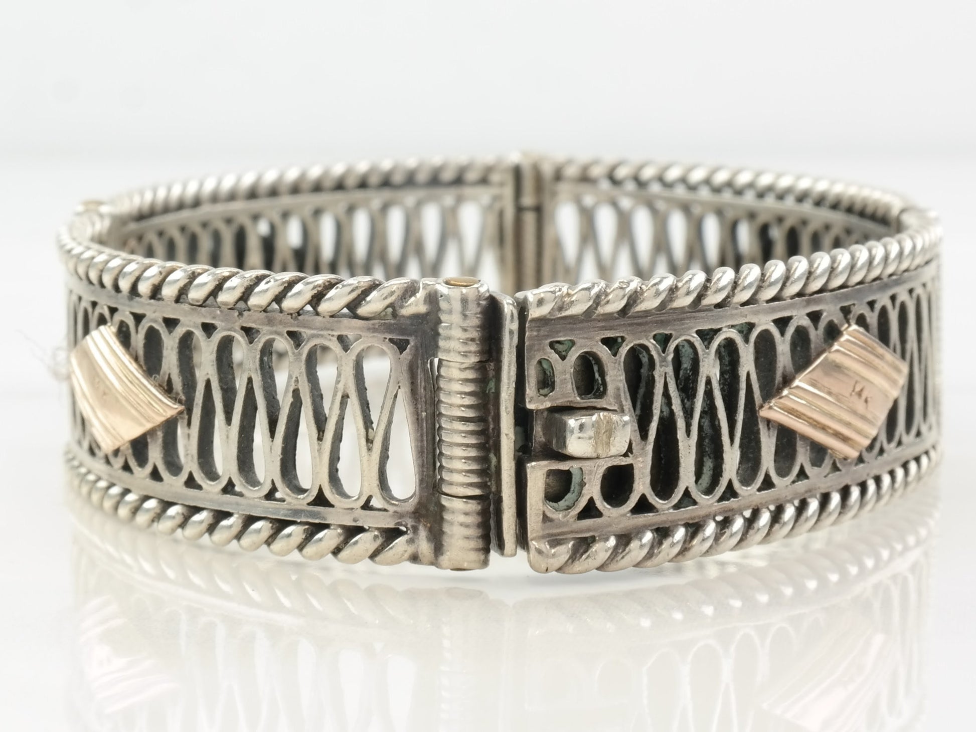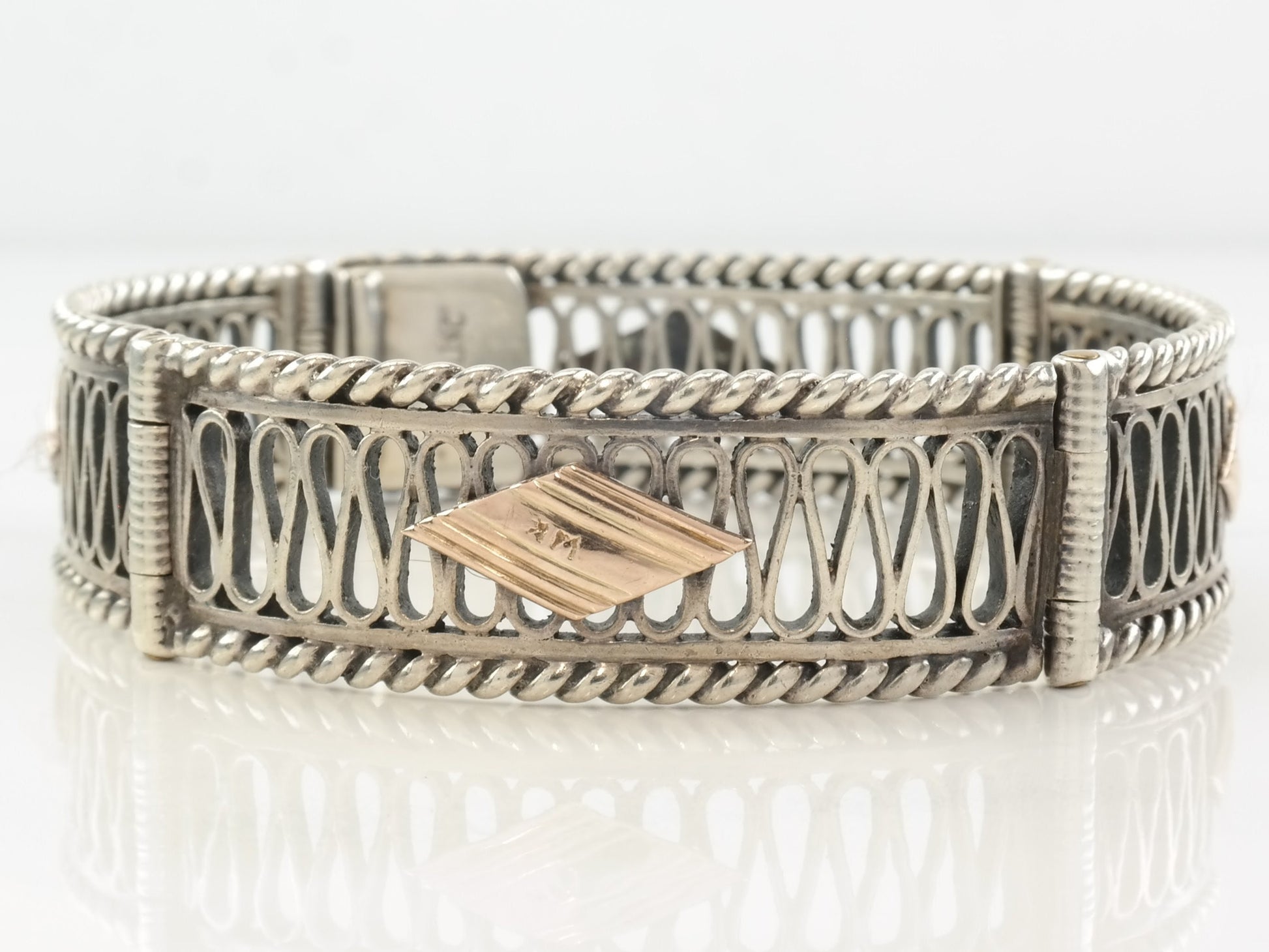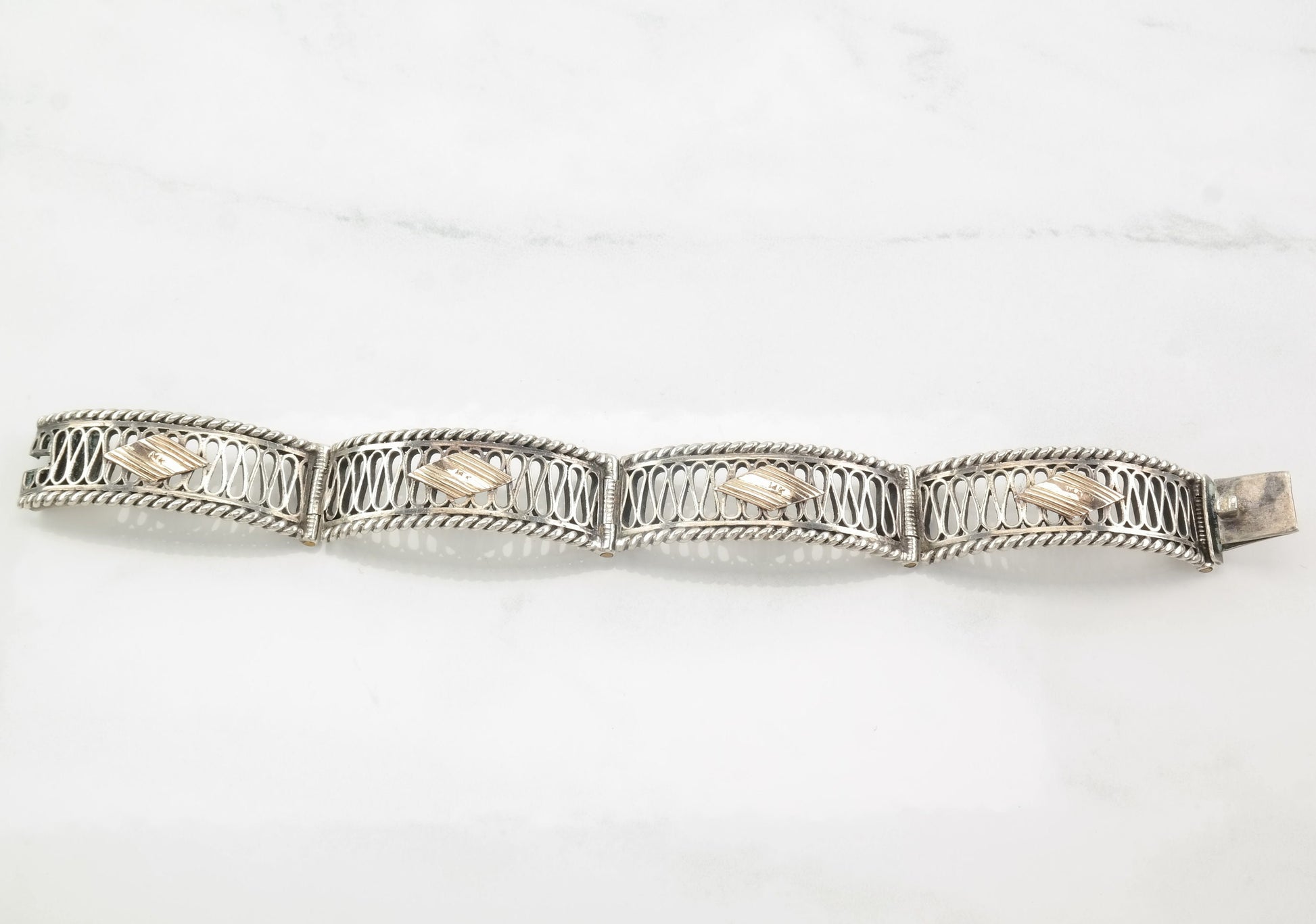 A stunningly unique design dating back to circa 1960! This filigree, sterling silver, and 14K gold accent bracelet will add that extra flair to any outfit.