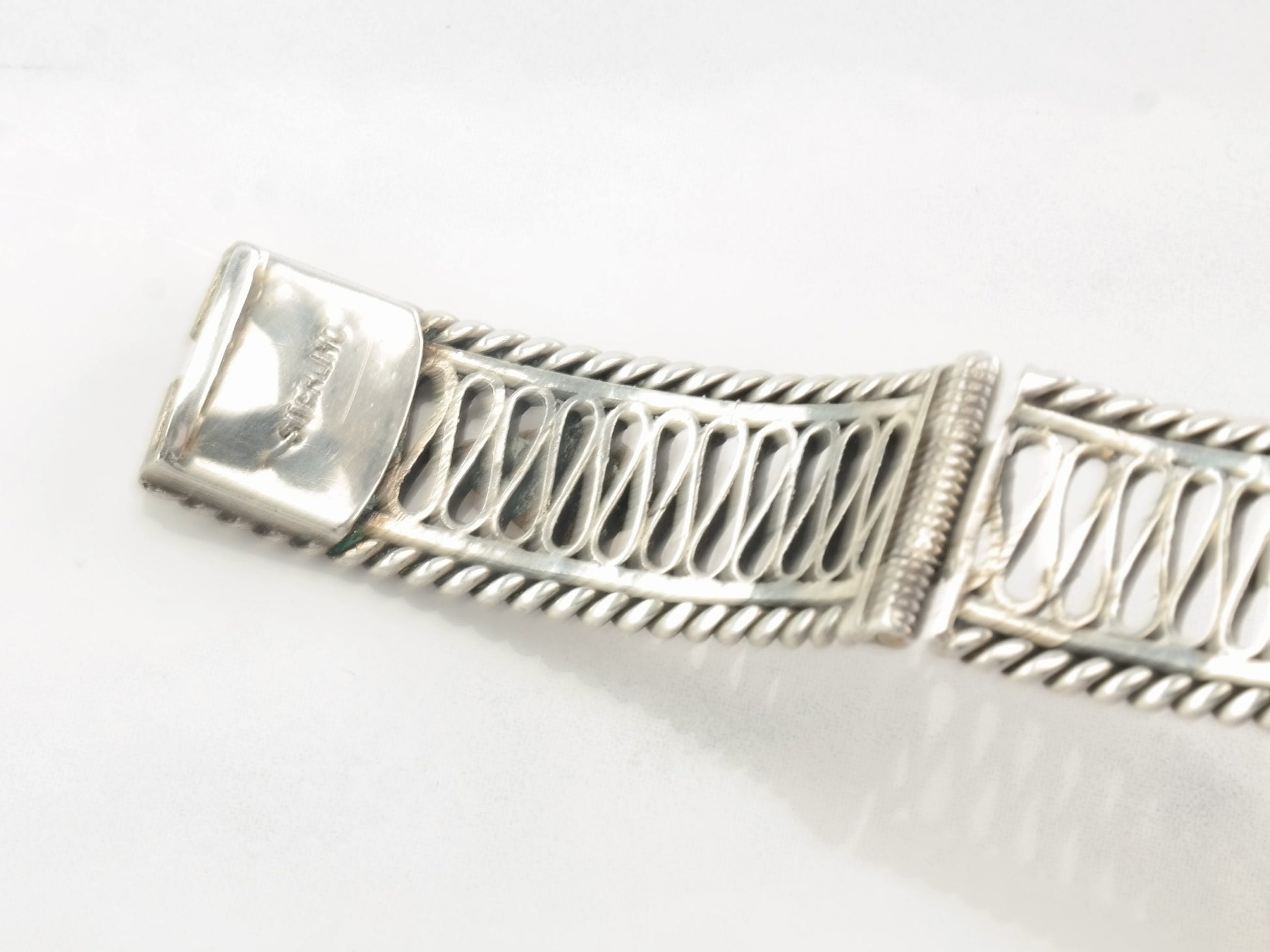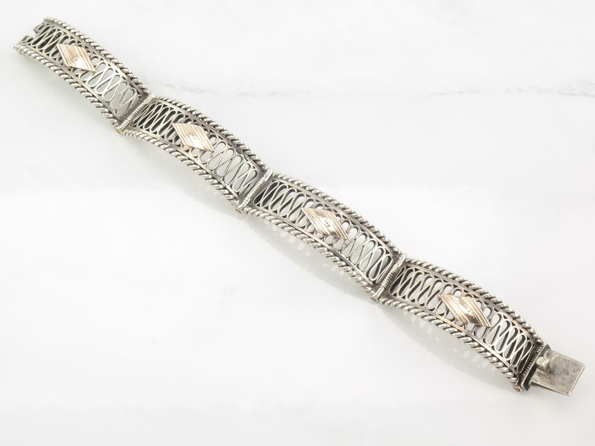 Sterling Silver Panel Bracelet 14K Gold Accent Filigree 6 3/4"