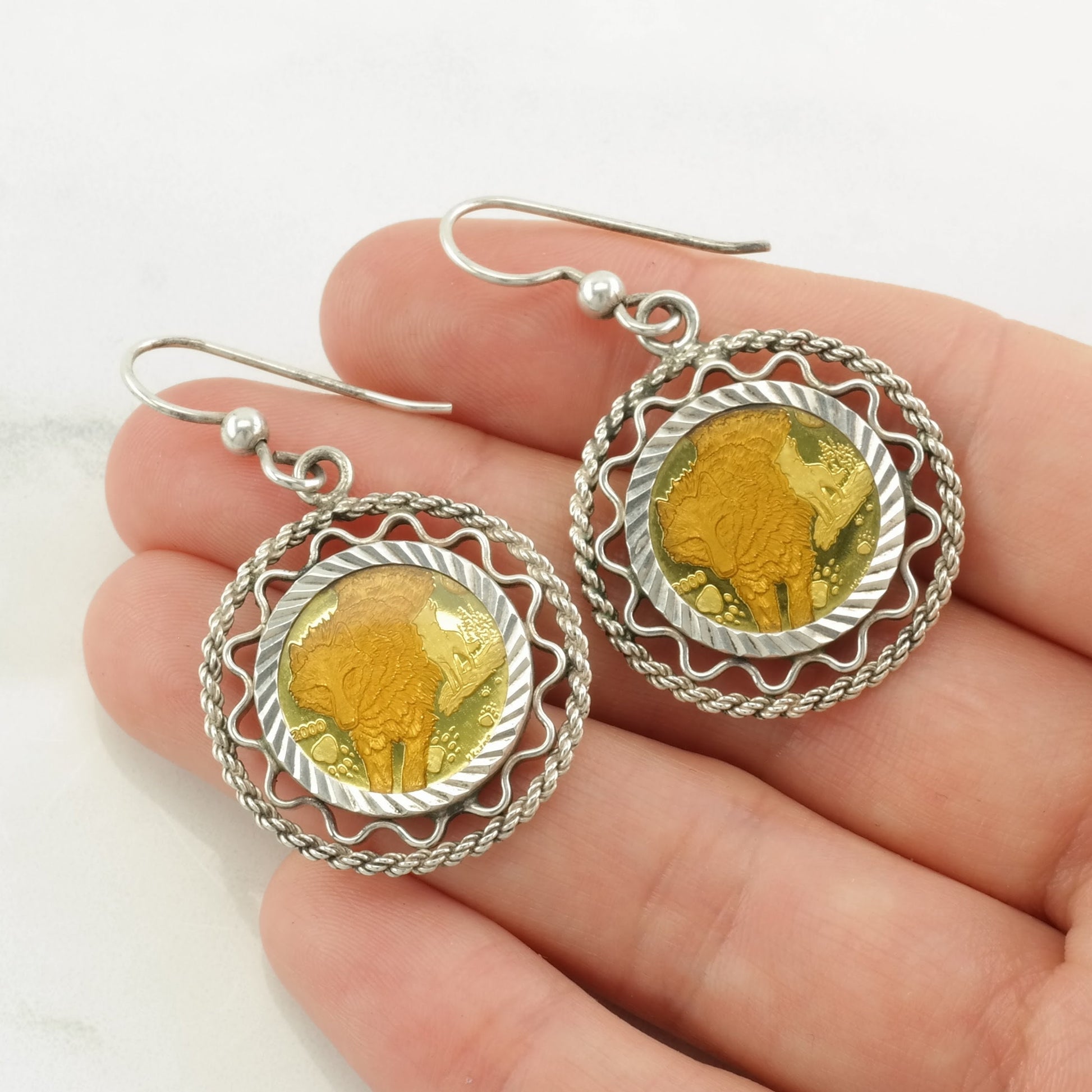Sterling Silver Wolf Coin, Alaska, Gold Tone Earrings Fish hook