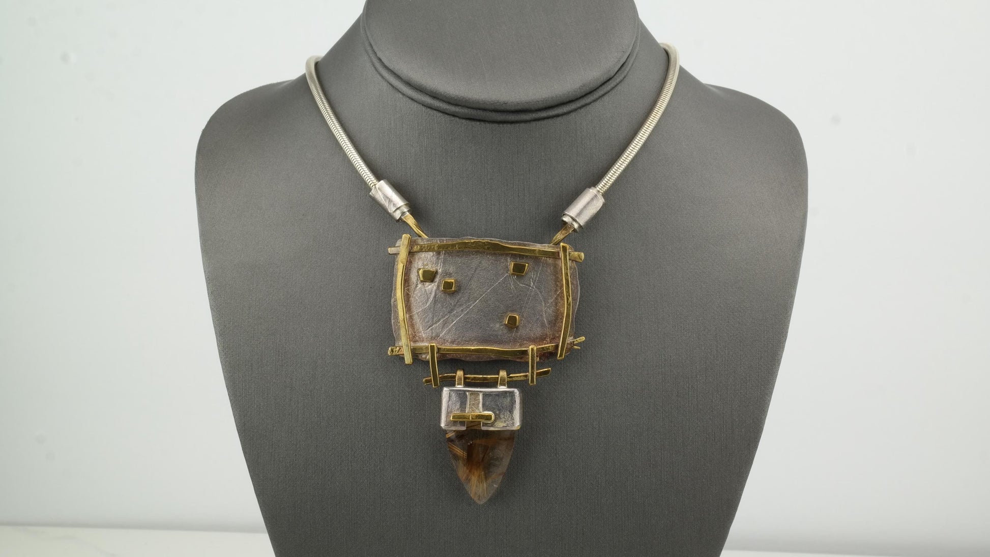 Make a statement with this striking studio-crafted necklace featuring a unique mixed metals pendant. This eye-catching piece showcases a rutilated quartz cabochon with mesmerizing golden needles, set in a bold design of sterling silver and brass.
