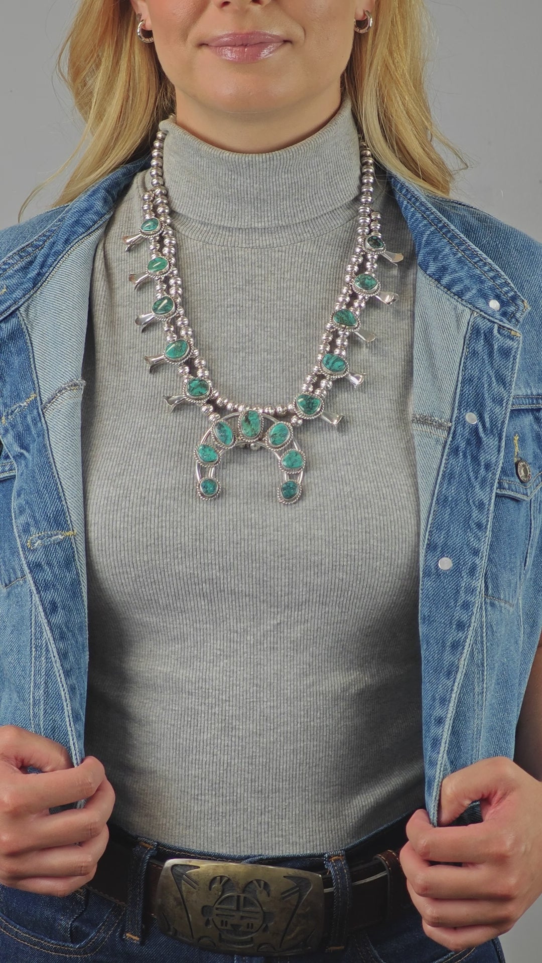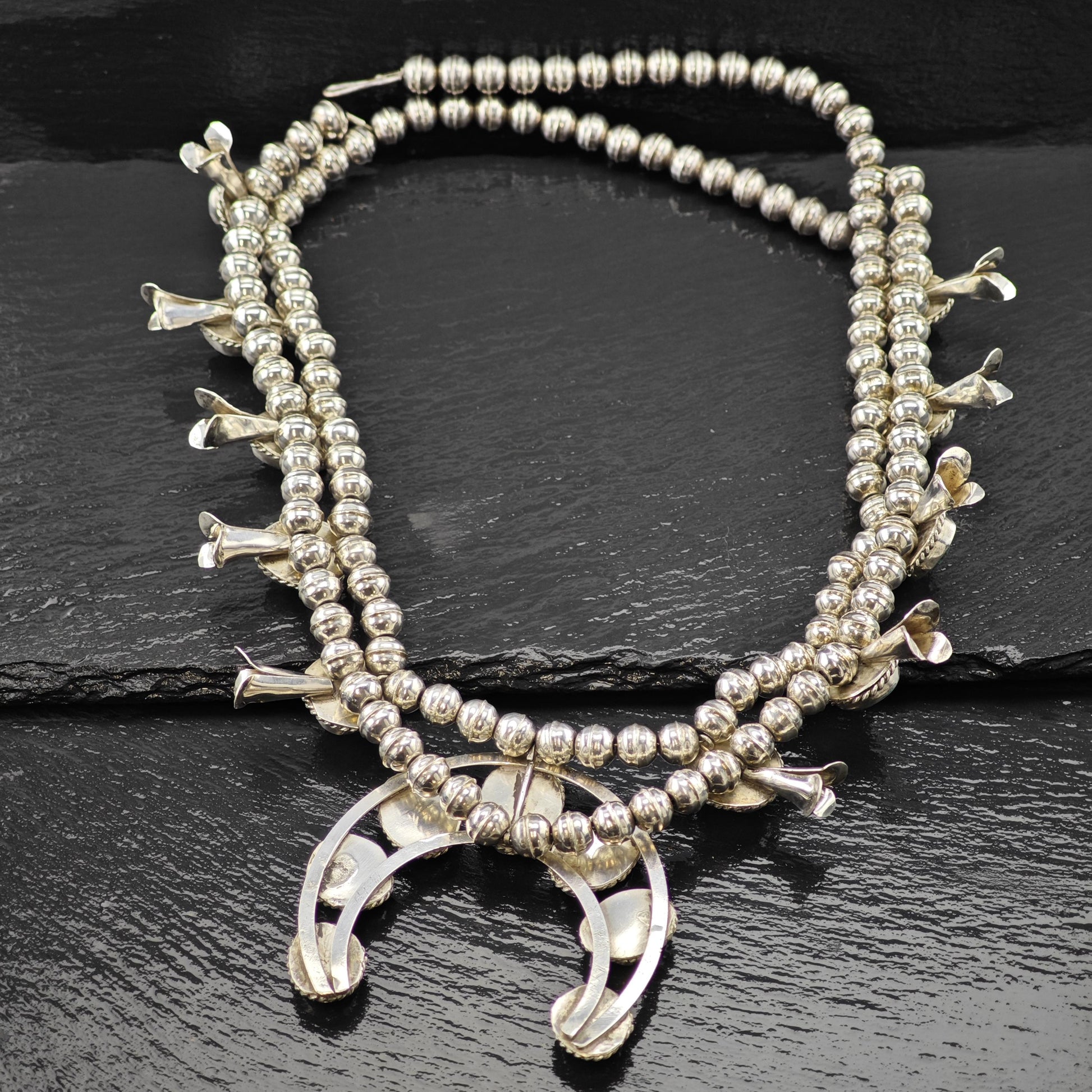 Discover the timeless elegance of this vintage squash blossom necklace, a true testament to Native American craftsmanship. Featuring stunning stabilized blue turquoise stones set in sterling silver, this bead necklace captures the spirit and beauty of Southwest jewelry traditions. Whether you're searching for a unique holiday gift or a cherished addition to your collection, this piece offers both history and style.