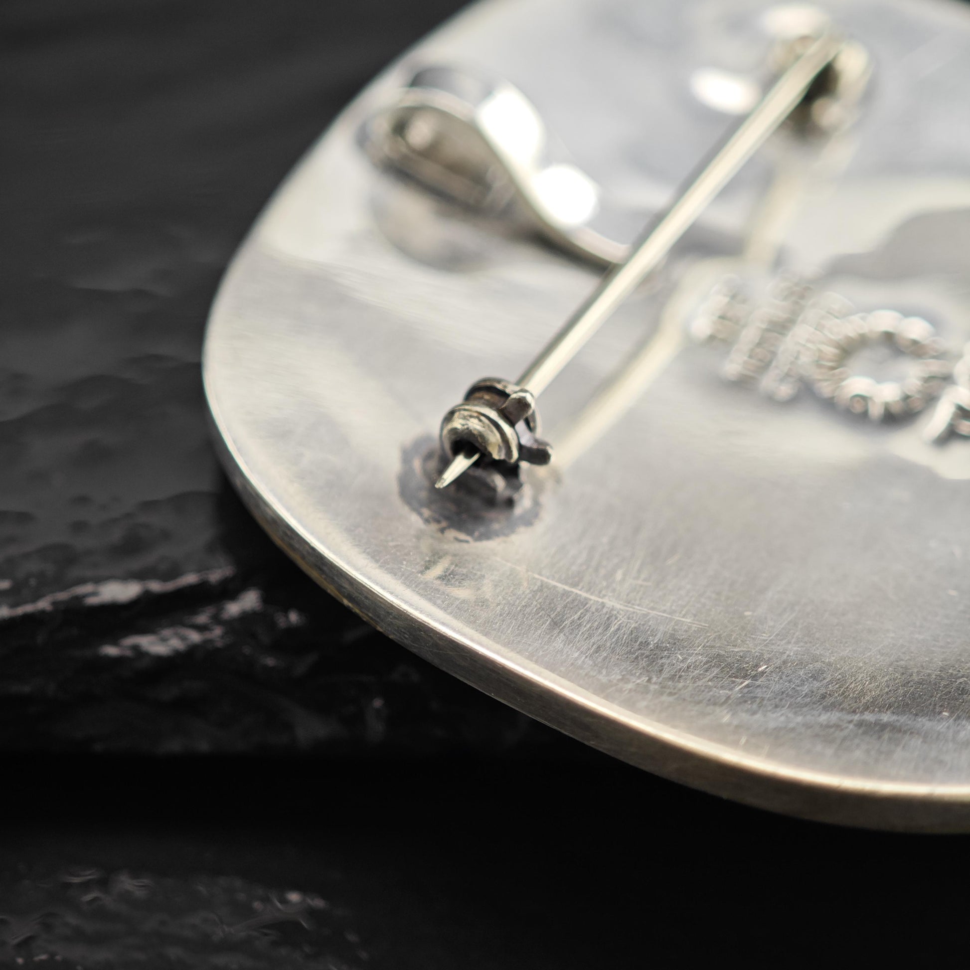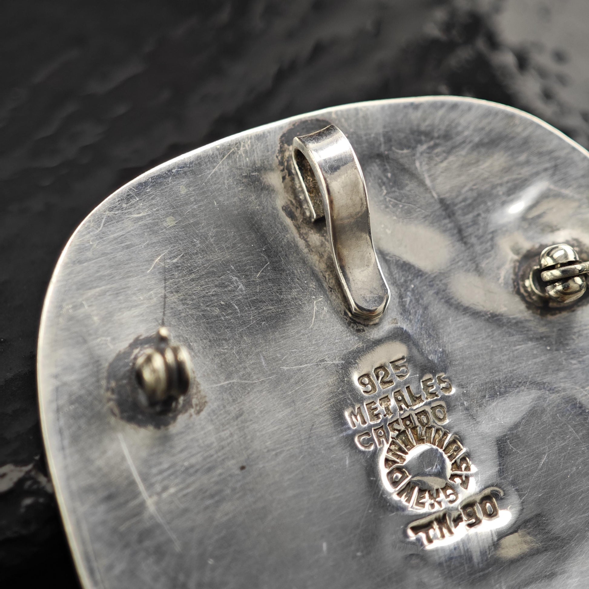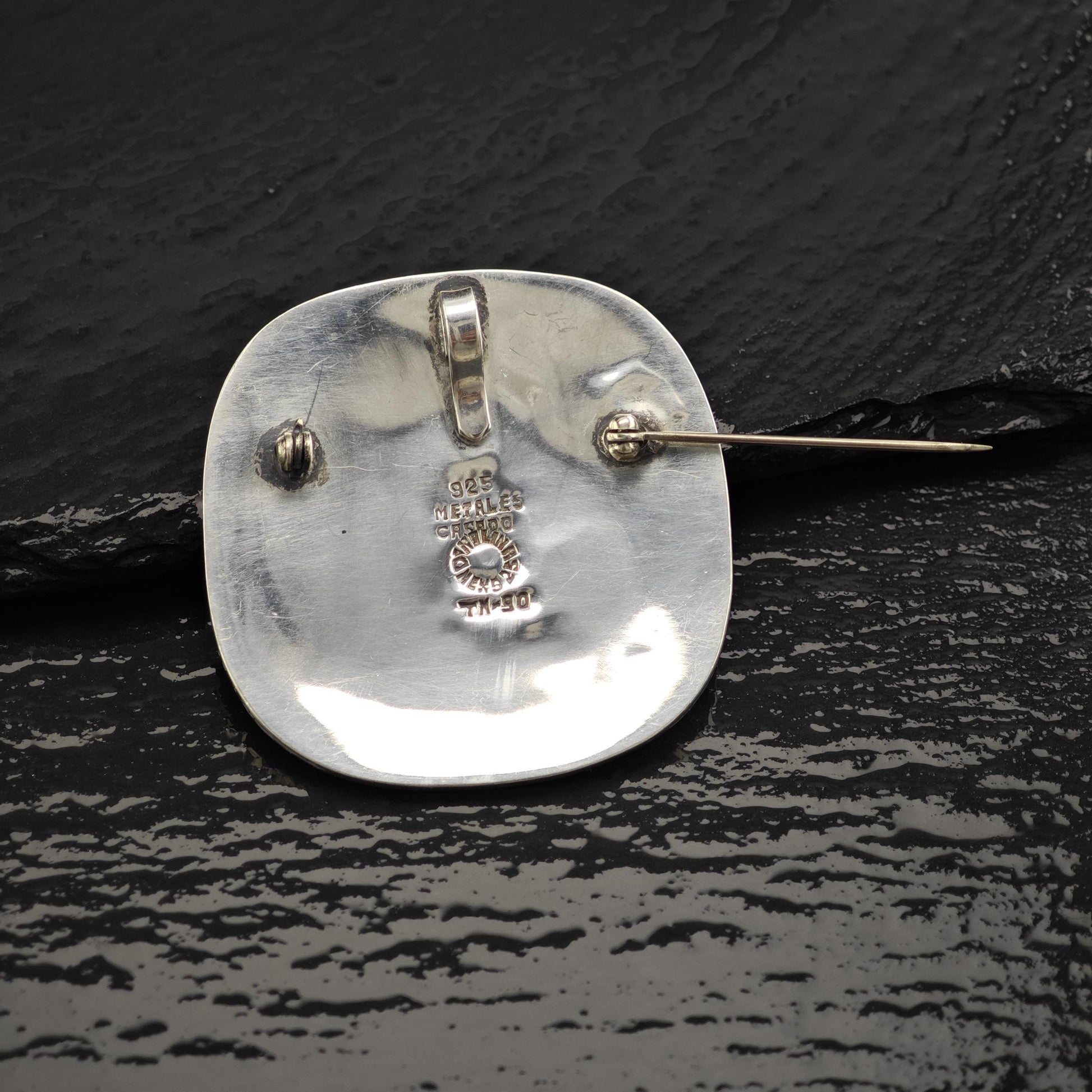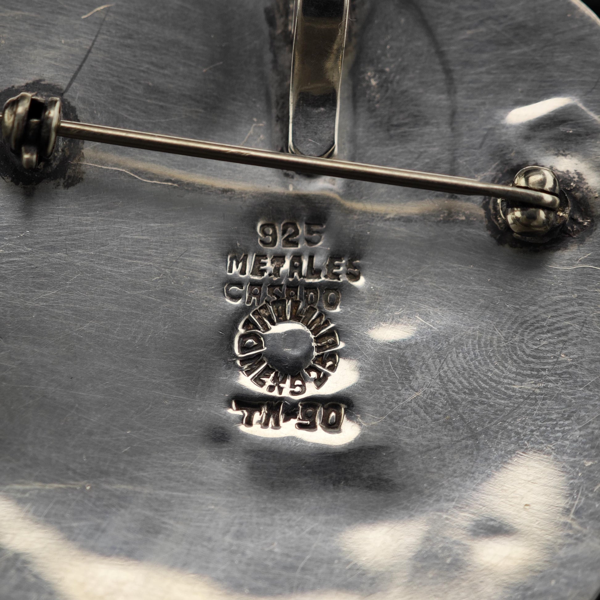 Measuring 1 7/8 inches in both length and width, this brooch weighs 30.7 grams, providing a substantial yet comfortable wear. The intricate design showcases the artistry of Taxco silver, marked with 925, Metales Casado, Dinolina, Mex 925, and TA-90, ensuring its authenticity as sterling silver.