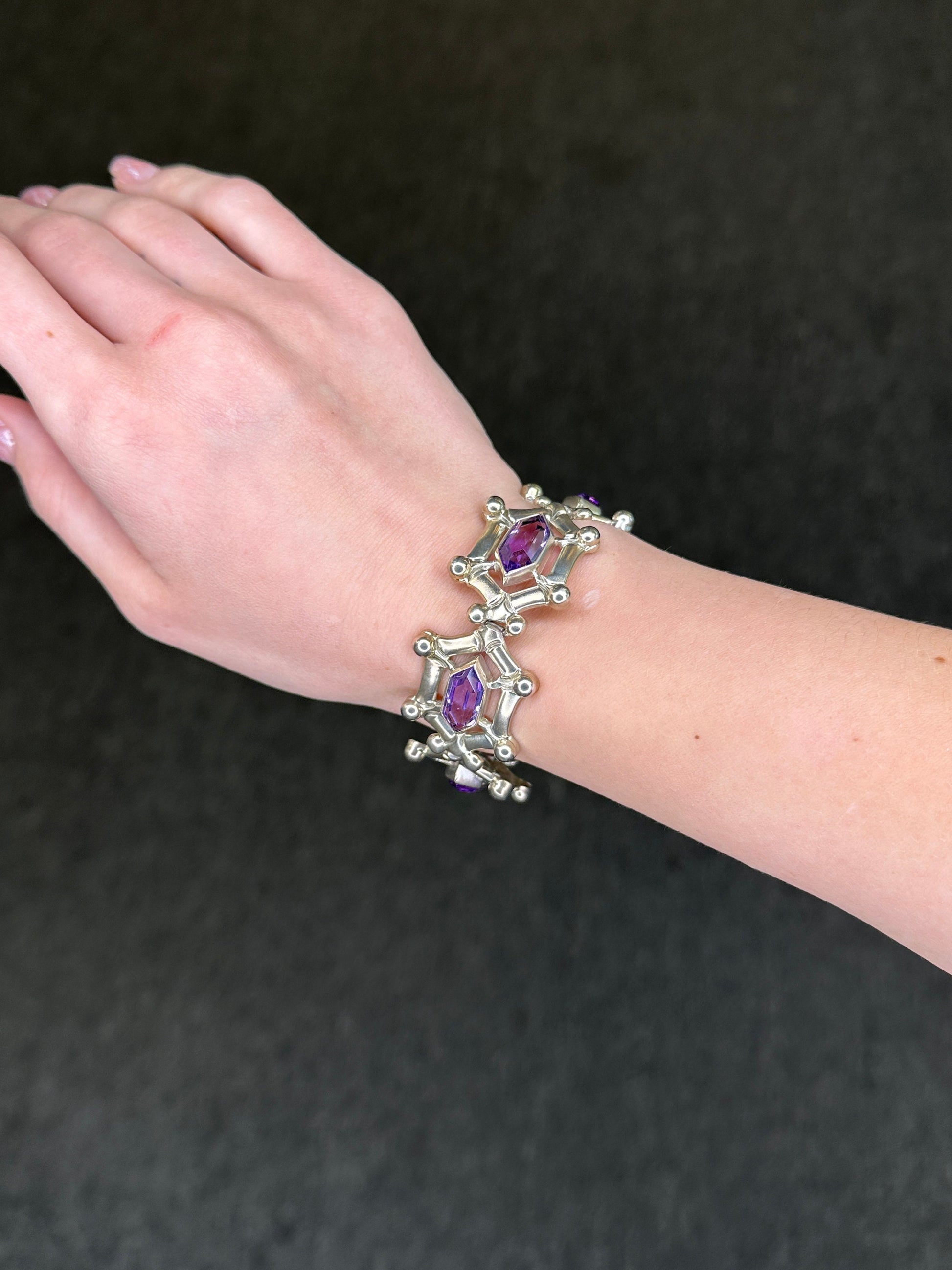 A gorgeous Taxco sterling silver bracelet featuring enchanting amethyst stones.