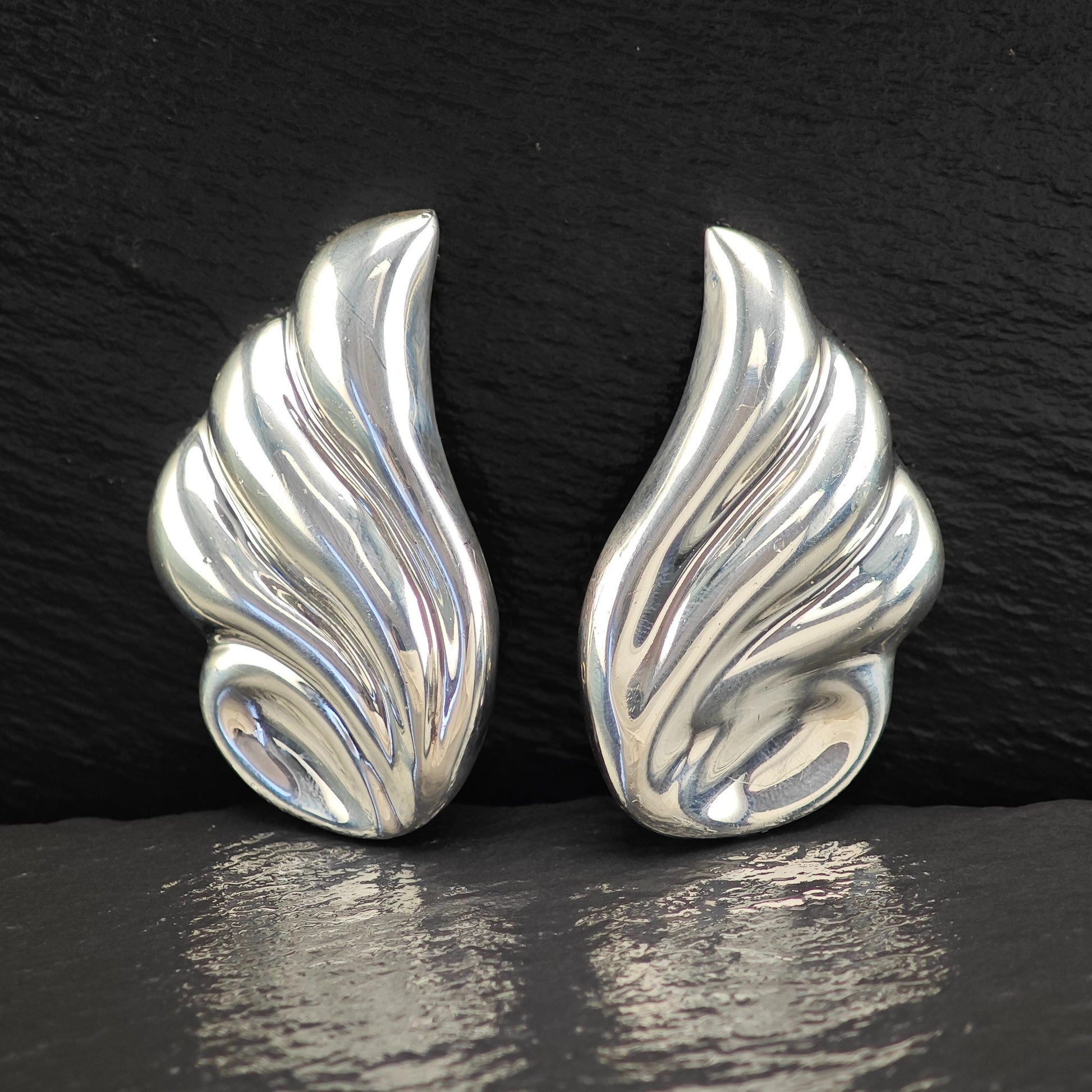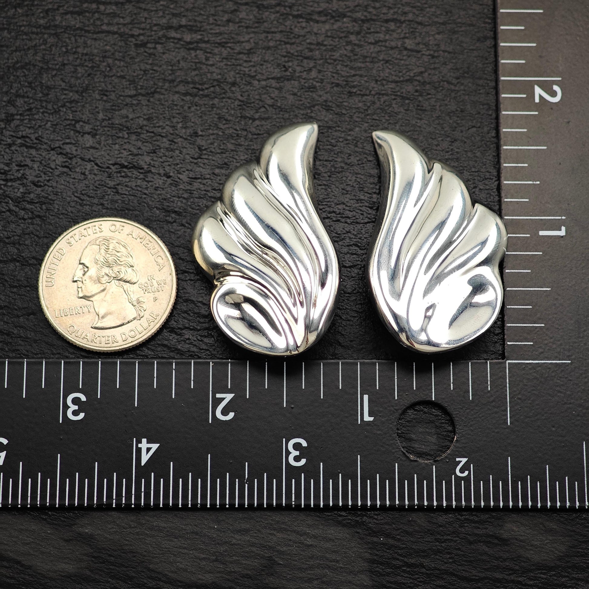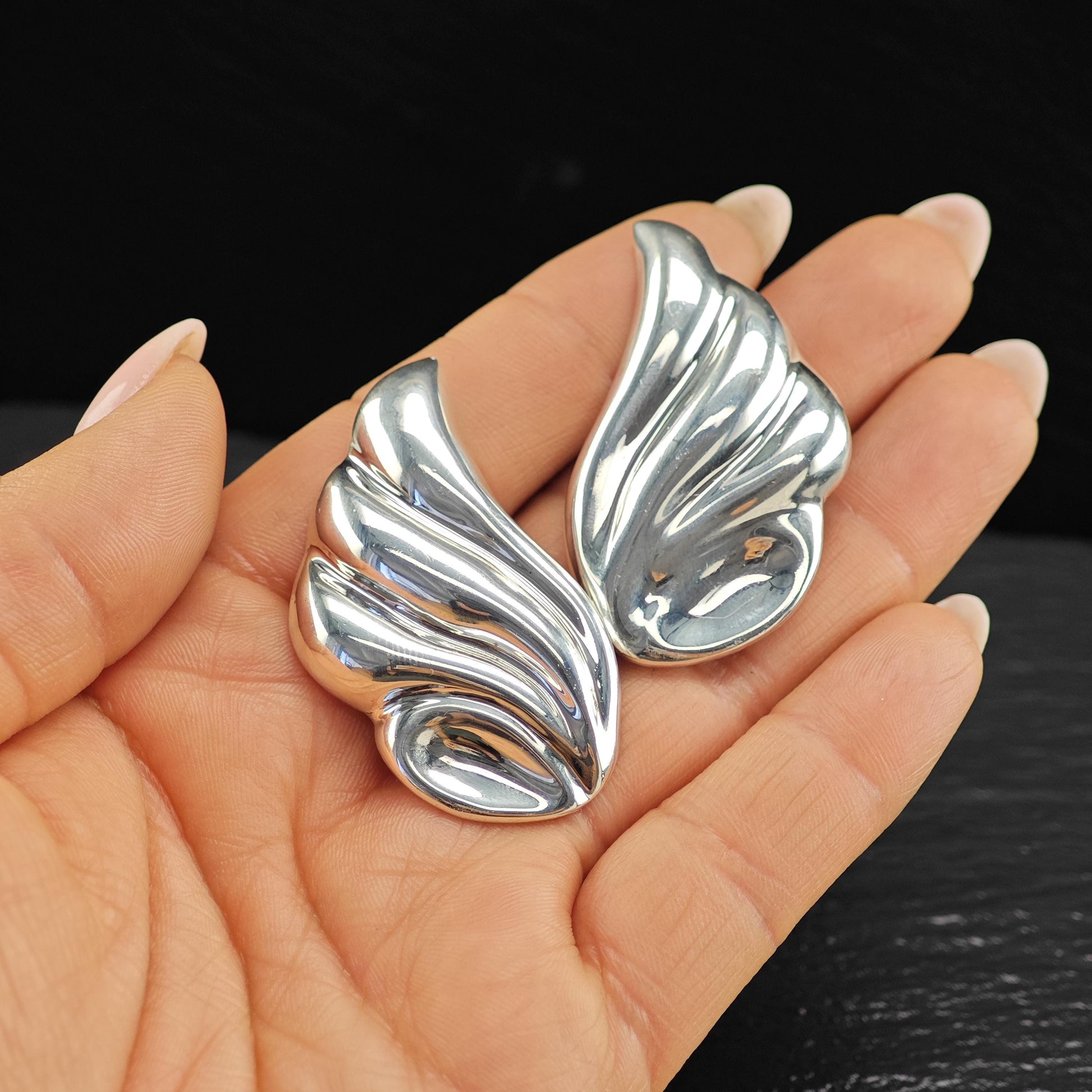 Discover these stunning vintage sterling silver earrings, featuring a unique wings puffy design. Measuring 1 3/4 inches in length and 1 inch in width, these earrings weigh a comfortable 24.8 grams, making them a perfect accessory for any occasion.