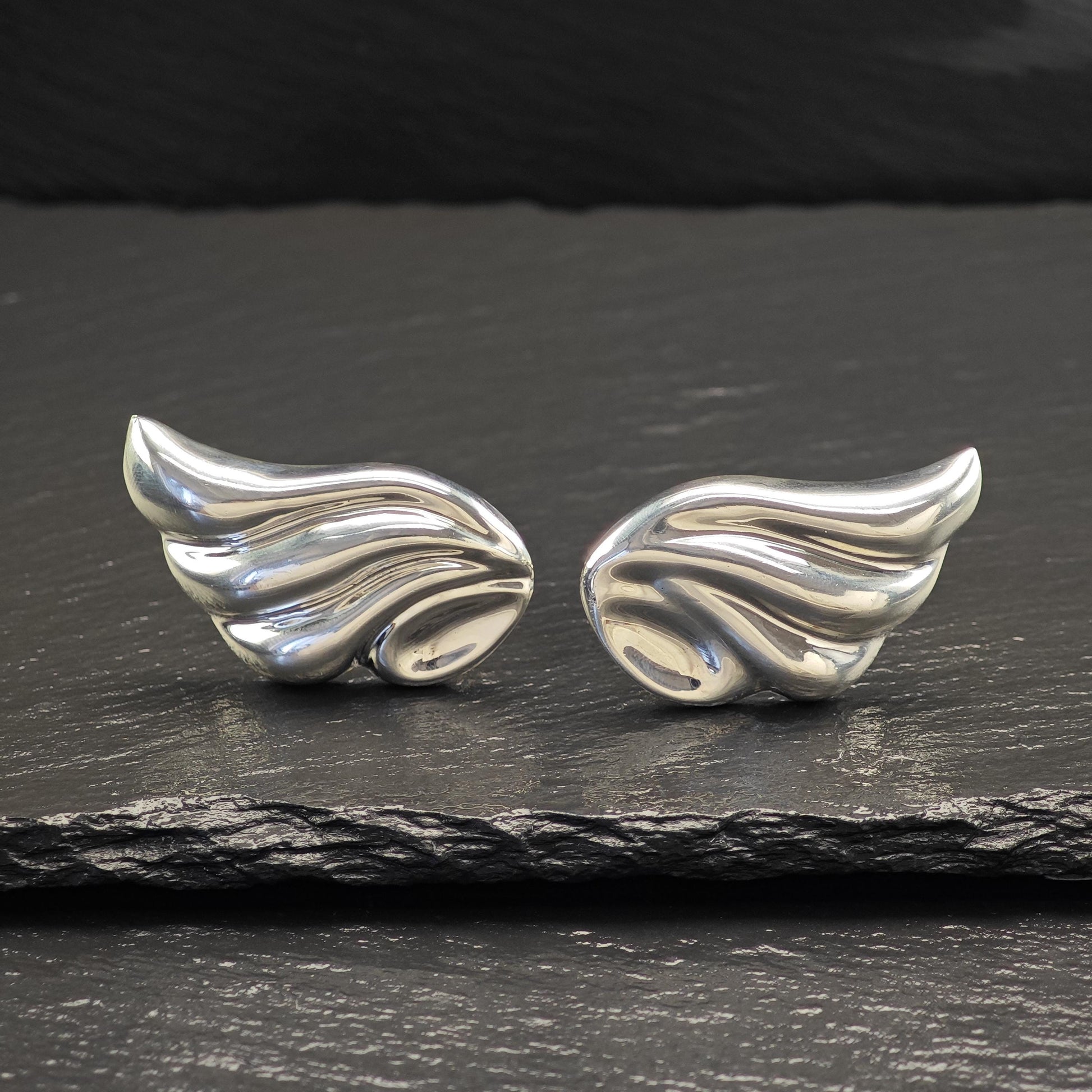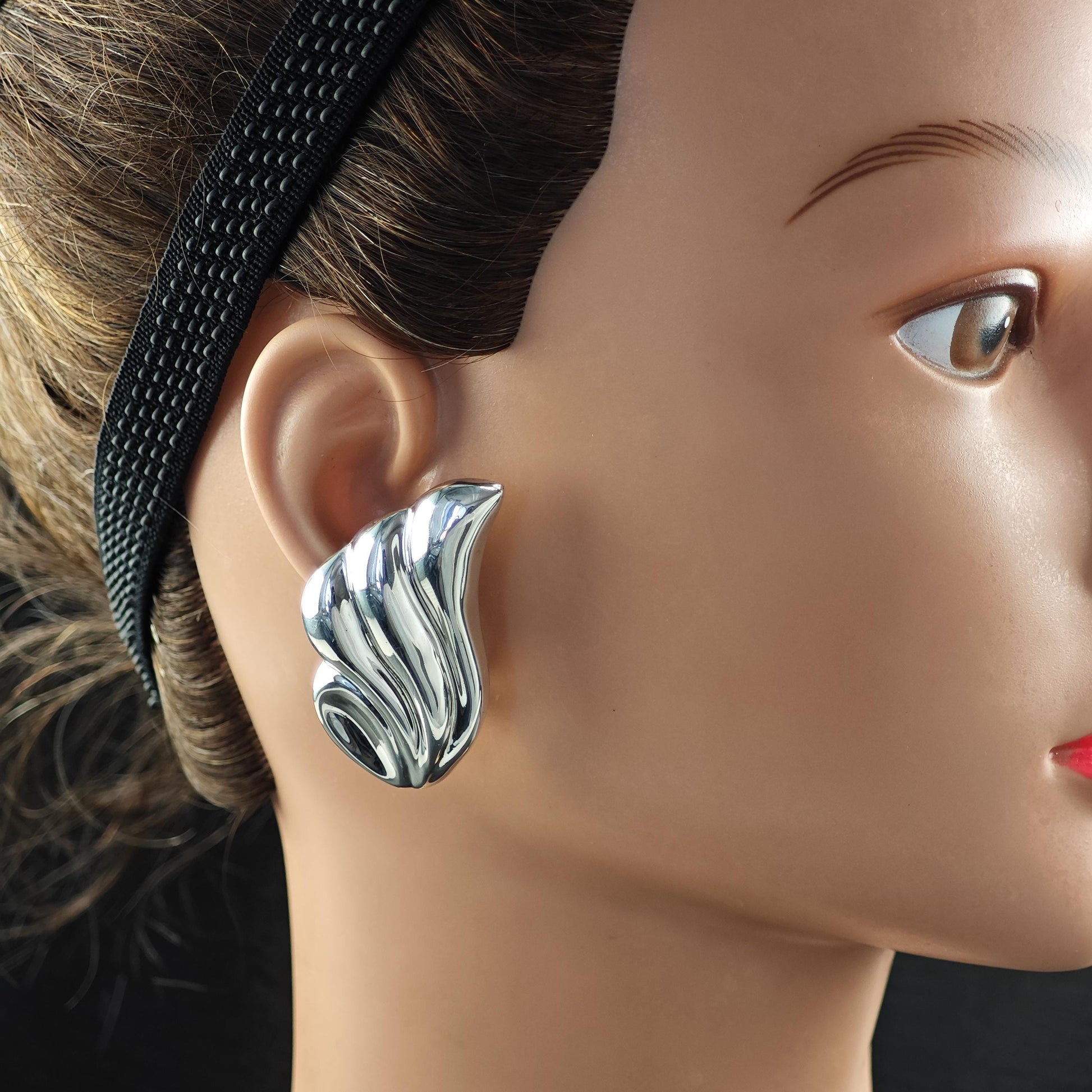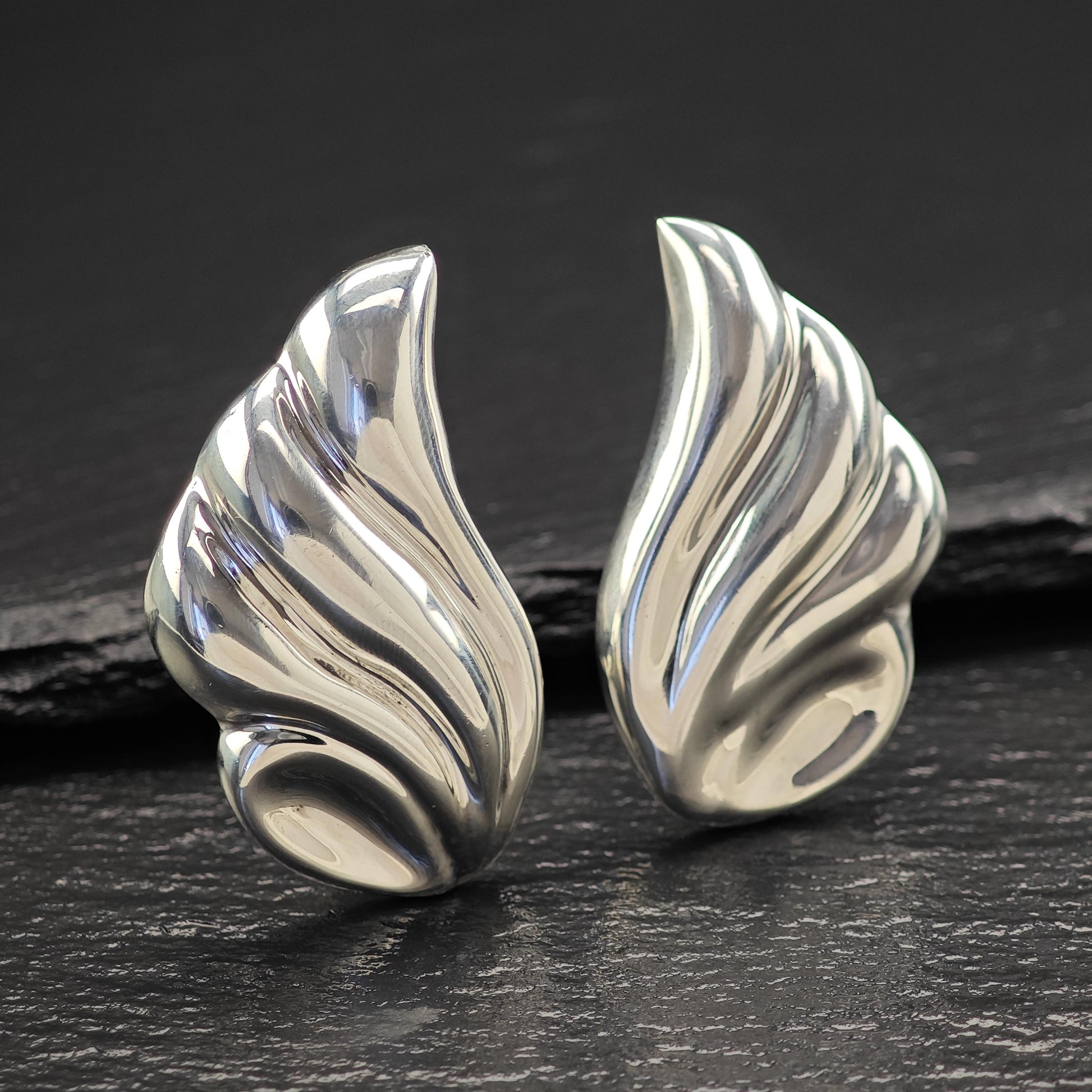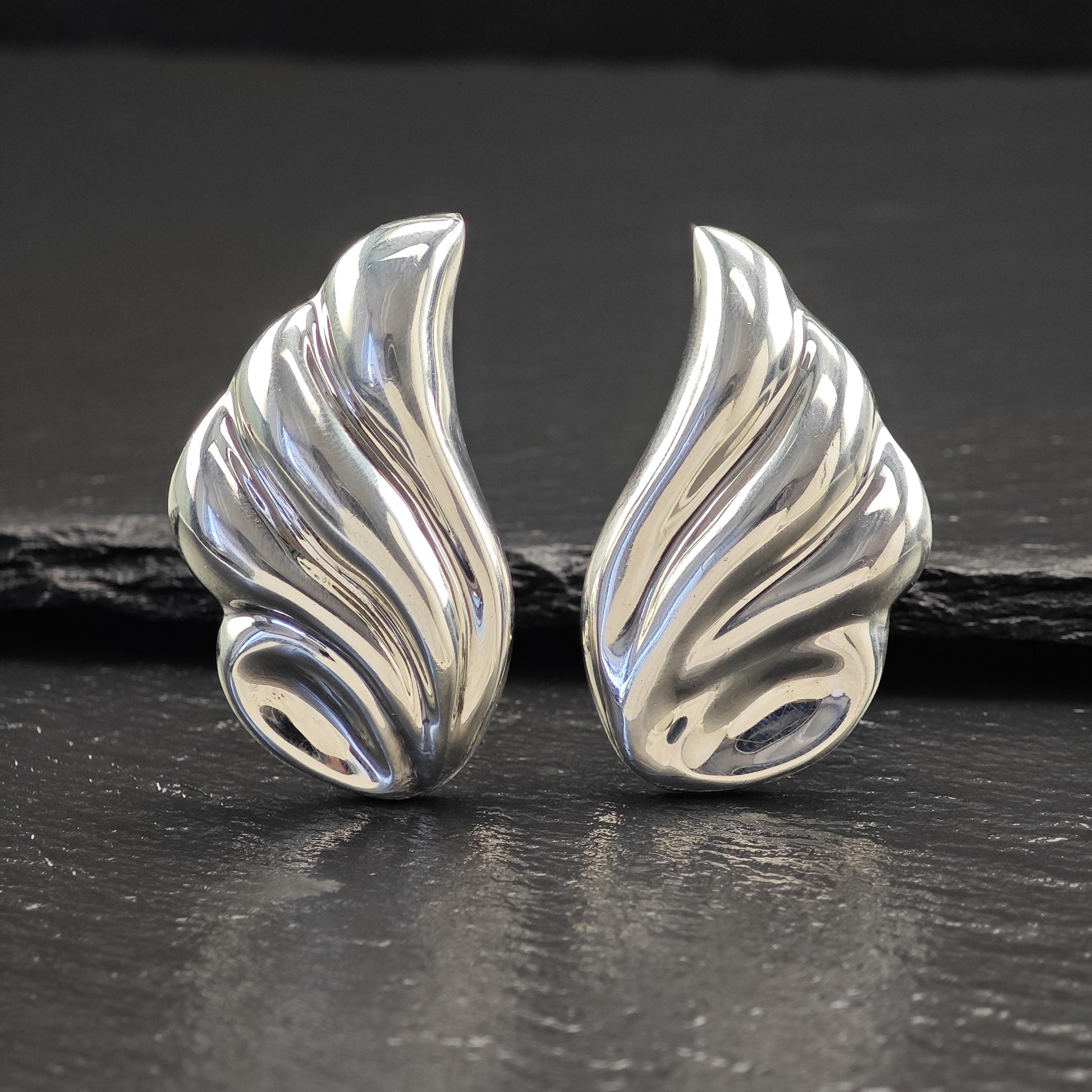 Discover these stunning vintage sterling silver earrings, featuring a unique wings puffy design. Measuring 1 3/4 inches in length and 1 inch in width, these earrings weigh a comfortable 24.8 grams, making them a perfect accessory for any occasion.