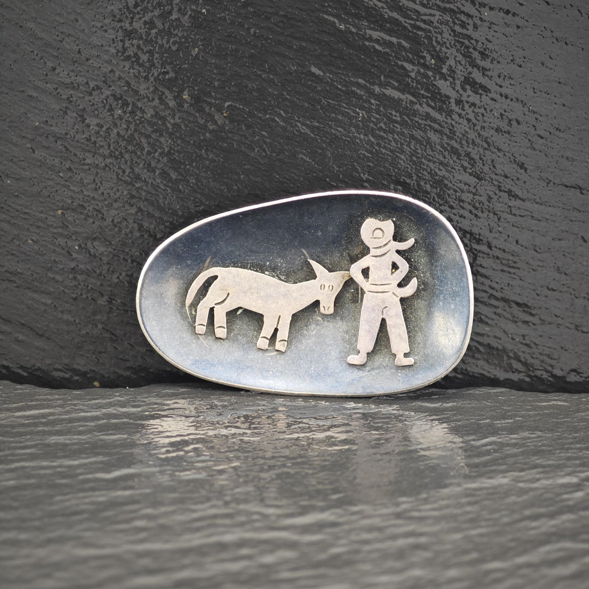 Stone or design featured on this brooch is Cowboy, Donkey