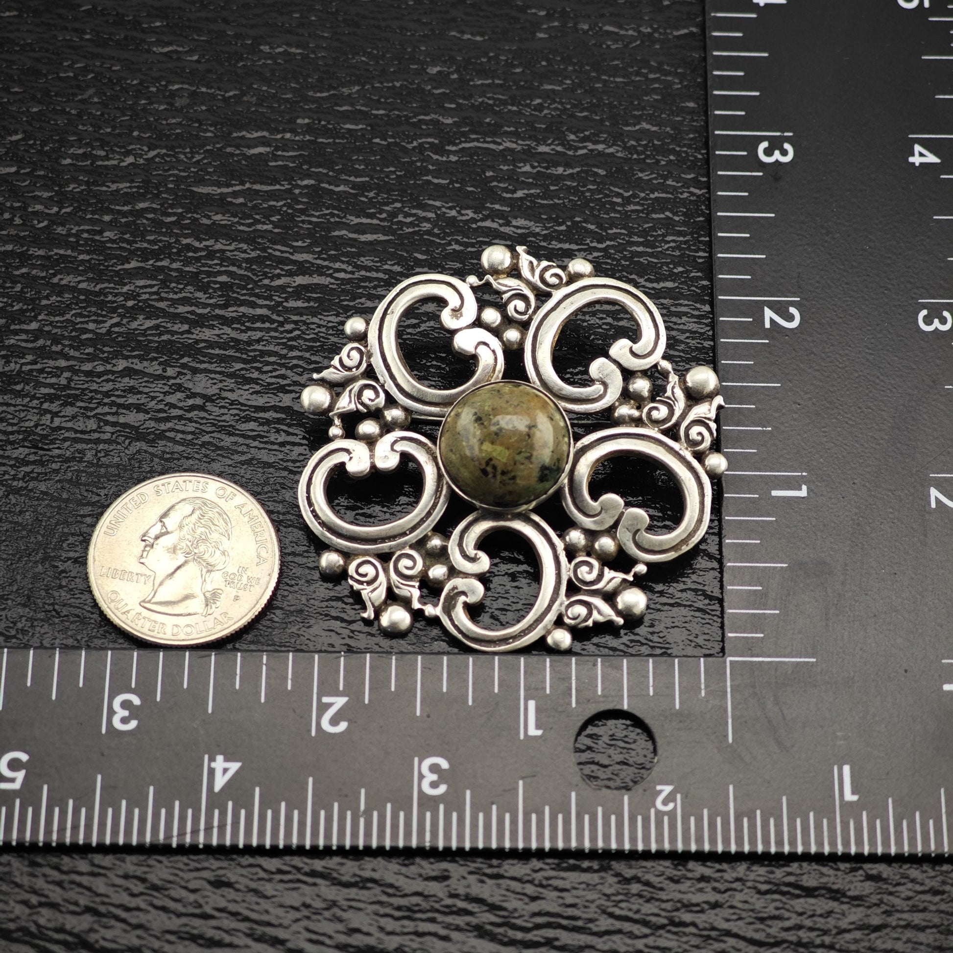 Discover the exquisite beauty of this Taxco Multi-Color Serpentine Brooch, crafted from sterling silver and featuring a captivating geometric design. This stunning piece, dating back to circa 1980, measures 2 1/8 inches in both length and width and weighs 26.2 grams, making it a substantial yet elegant addition to any jewelry collection.