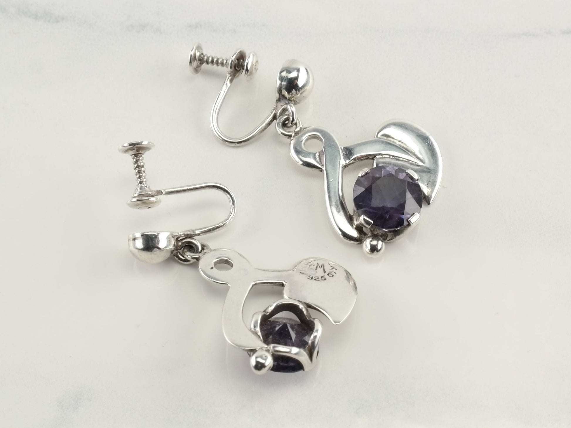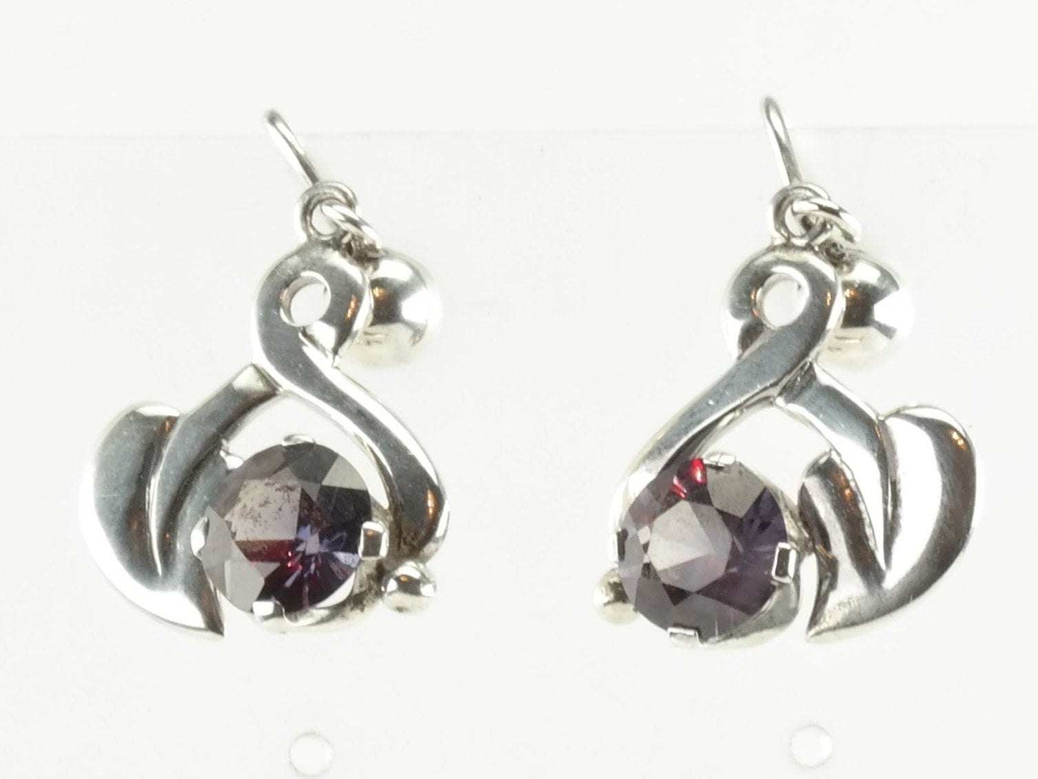 Taxco Sterling Silver Purple Corundum Leaf Earrings Screw Back