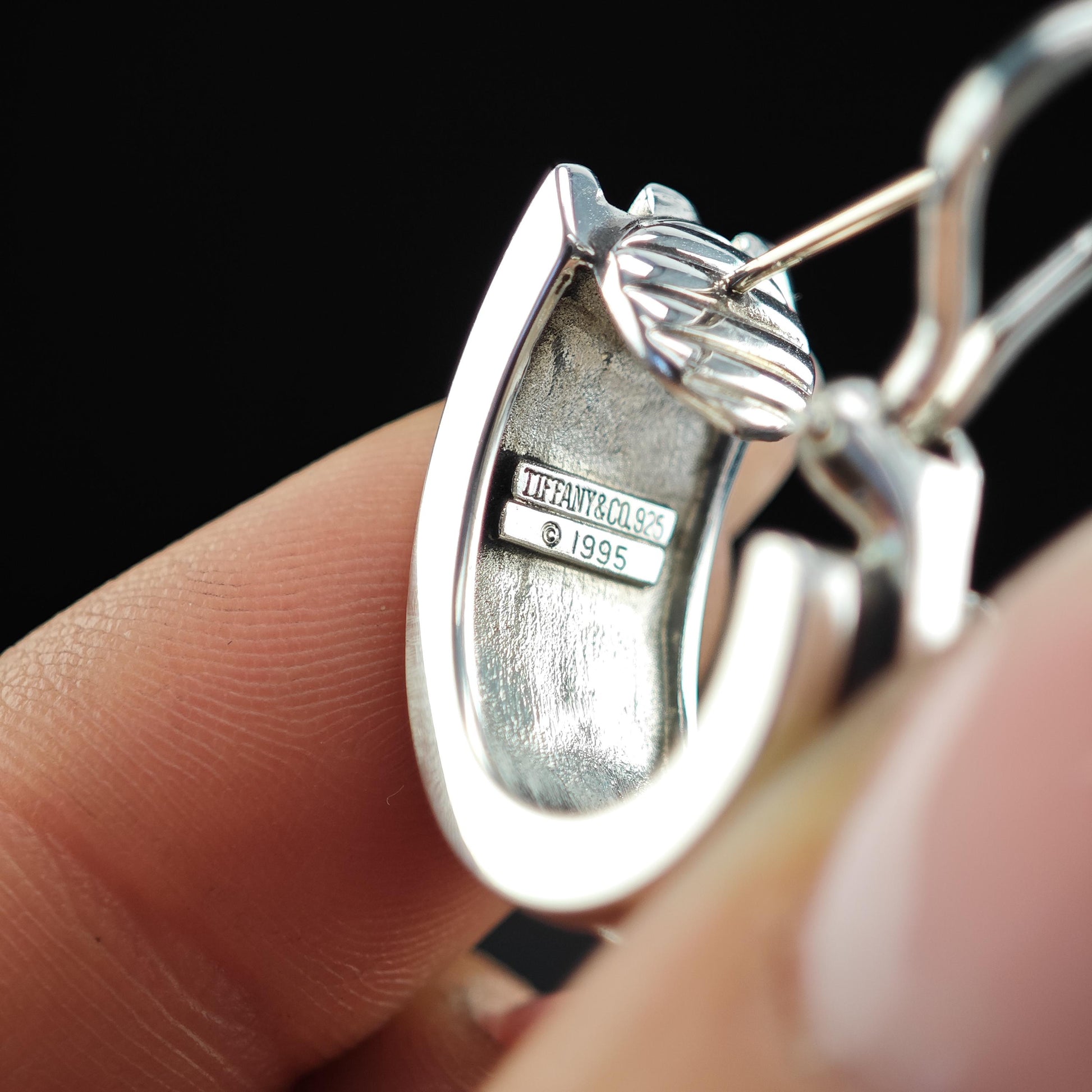 Discover these exquisite vintage sterling silver earrings, measuring 7/8 inches in length and 3/8 inches in width. Weighing a delicate 16.2 grams, these earrings feature the iconic Atlas 1995 incised design, showcasing Tiffany & Co.'s craftsmanship. The posts are marked with "Tiffany & Co., 925" and "Copyright 1995, T & Co 925," ensuring authenticity and tested sterling silver quality.