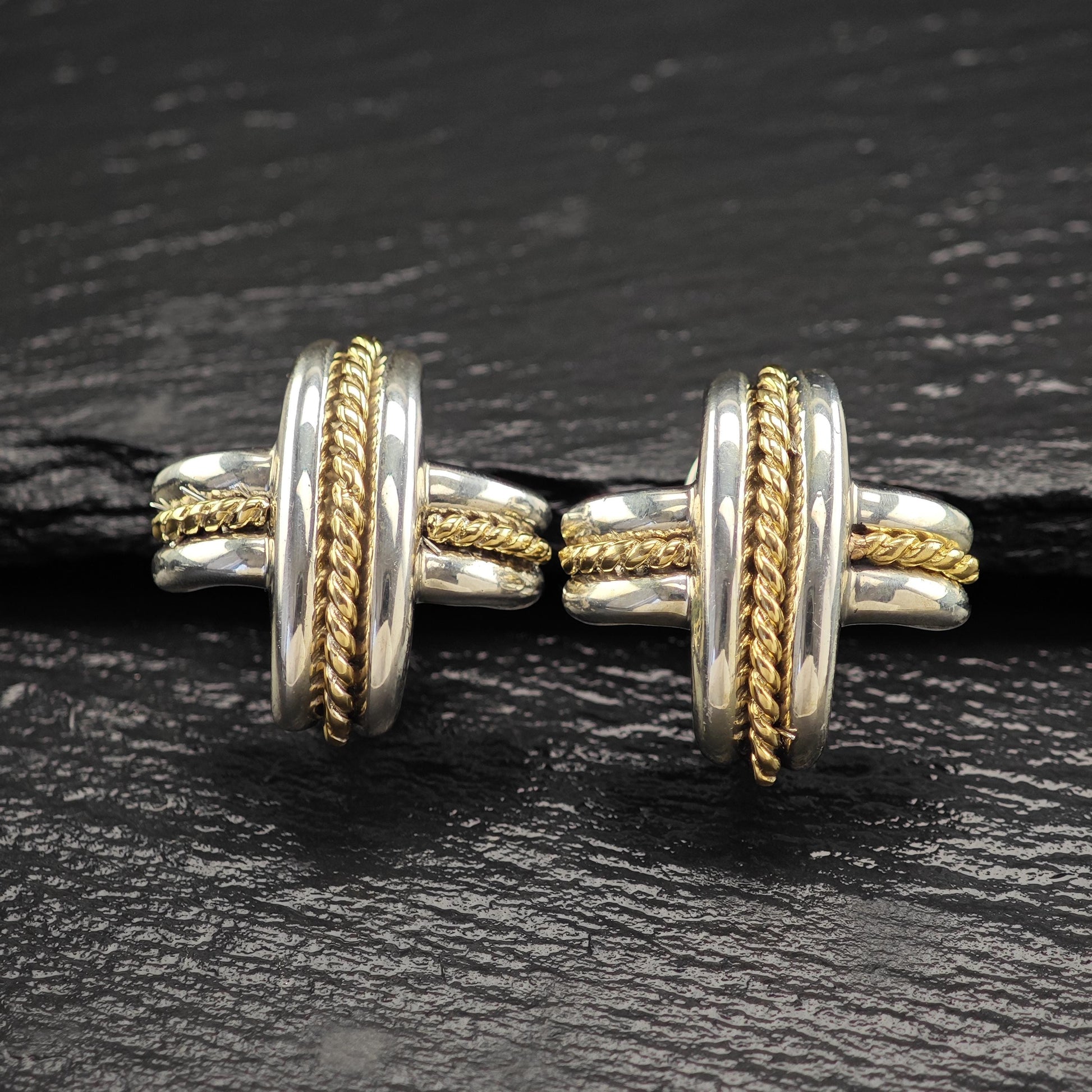 Crafted with attention to detail, they showcase the unique combination of two-tone finishes, ensuring a timeless appeal. The earrings are marked with "750," indicating the gold content, along with "Copyright 1990," "Tiffany & Co," and "925," confirming their authenticity as tested sterling silver.