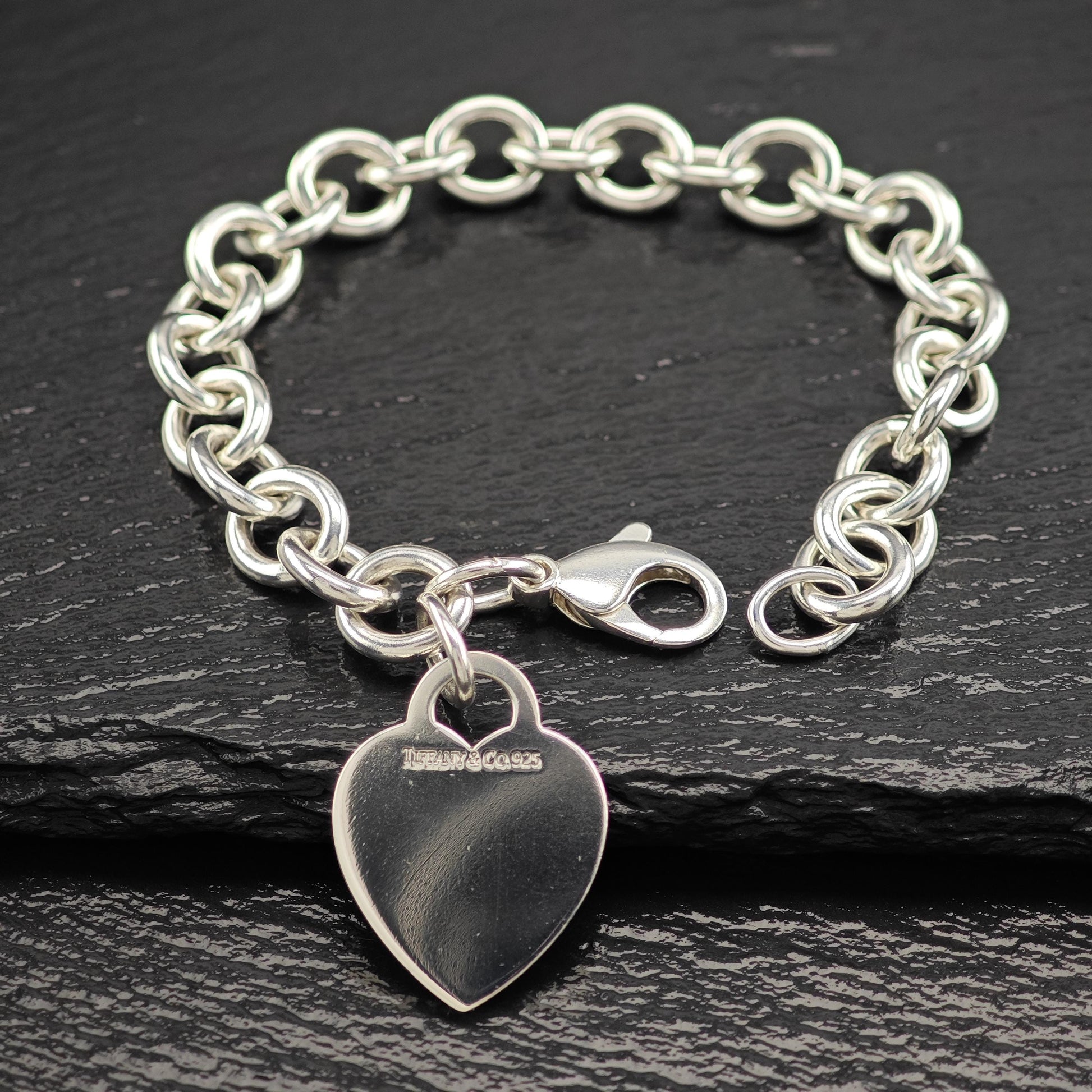 Discover the elegance of the Tiffany Heart Tag Curb Bracelet, crafted from high-quality sterling silver. This stunning piece is stamped with the iconic Tiffany & Co. mark and the 925 designation, ensuring its authenticity and premium quality. Designed to fit a wrist size of 6 3/4", the bracelet has a lay flat length of 7 1/2" and a width of 3/8", making it a perfect accessory for any occasion. Weighing in at 35.6 grams, this bracelet is both substantial and comfortable to wear.
