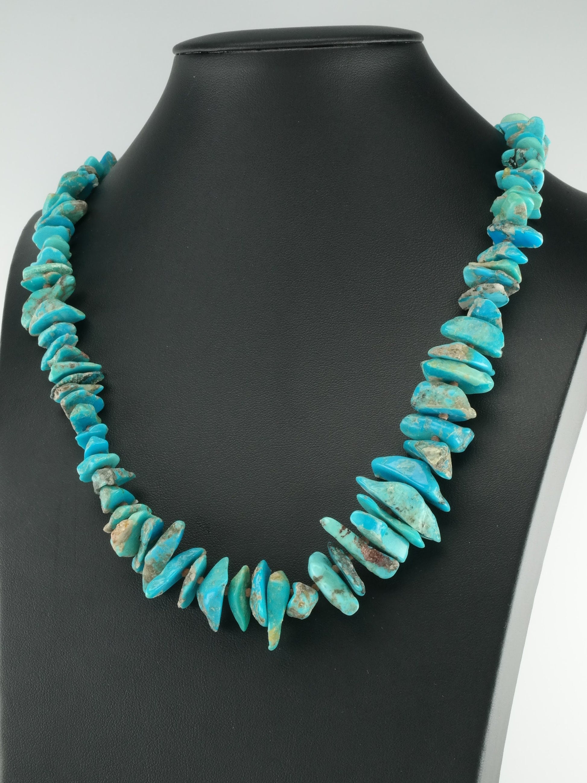 Graduated turquoise nuggets, ranging in size from delicate 8mm to bold 28mm, create a captivating visual flow. Each stone is unique, with natural variations in color and texture that tell a story of the earth from which it came. Accents of tiny turquoise heishi beads add a delicate touch.